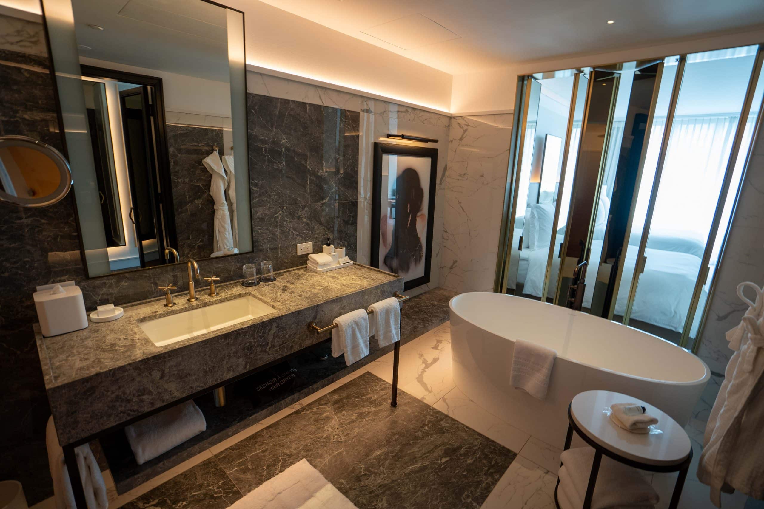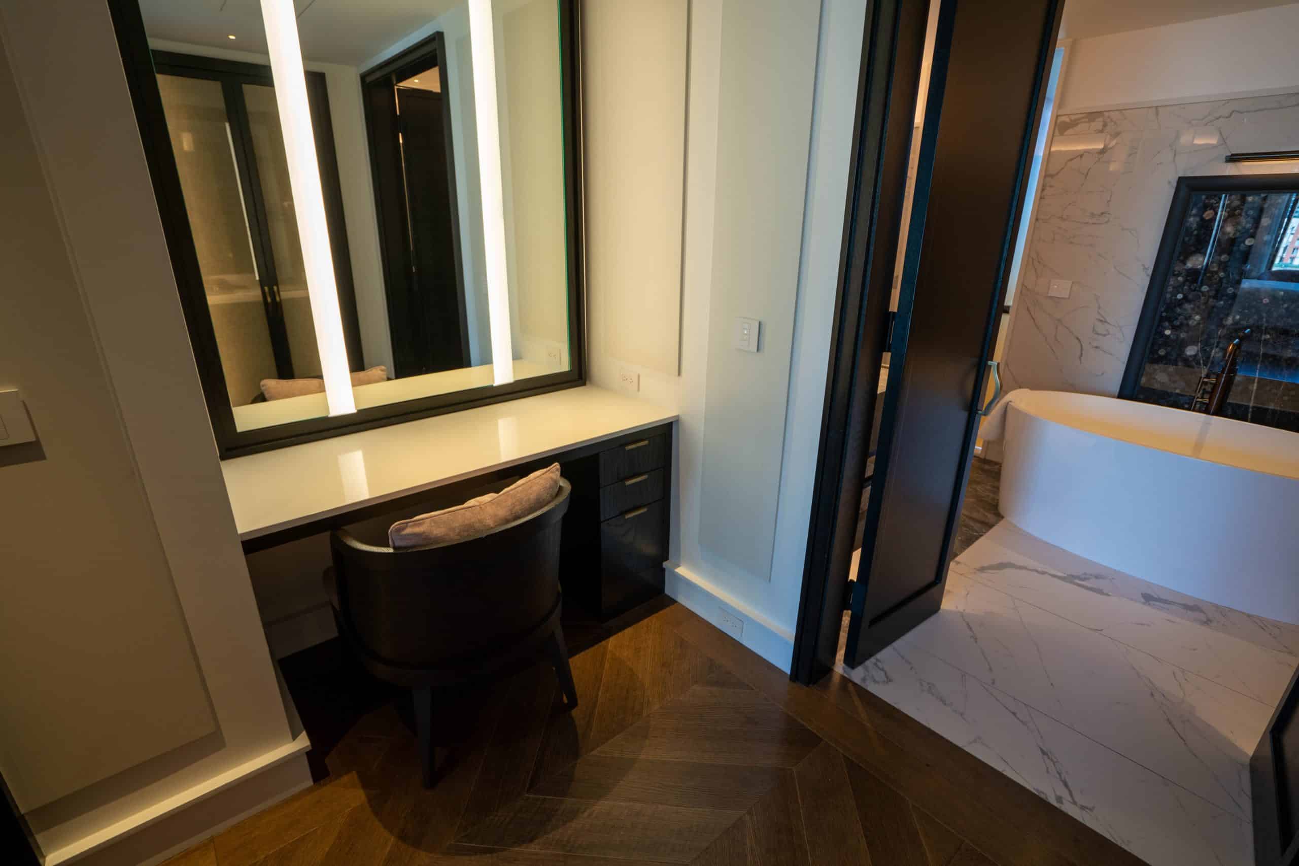 The full granite bathroom of the suite is a true gem, boasting a circular soaker bathtub that adds to the luxurious experience. There’s also a separate makeup table nearby.