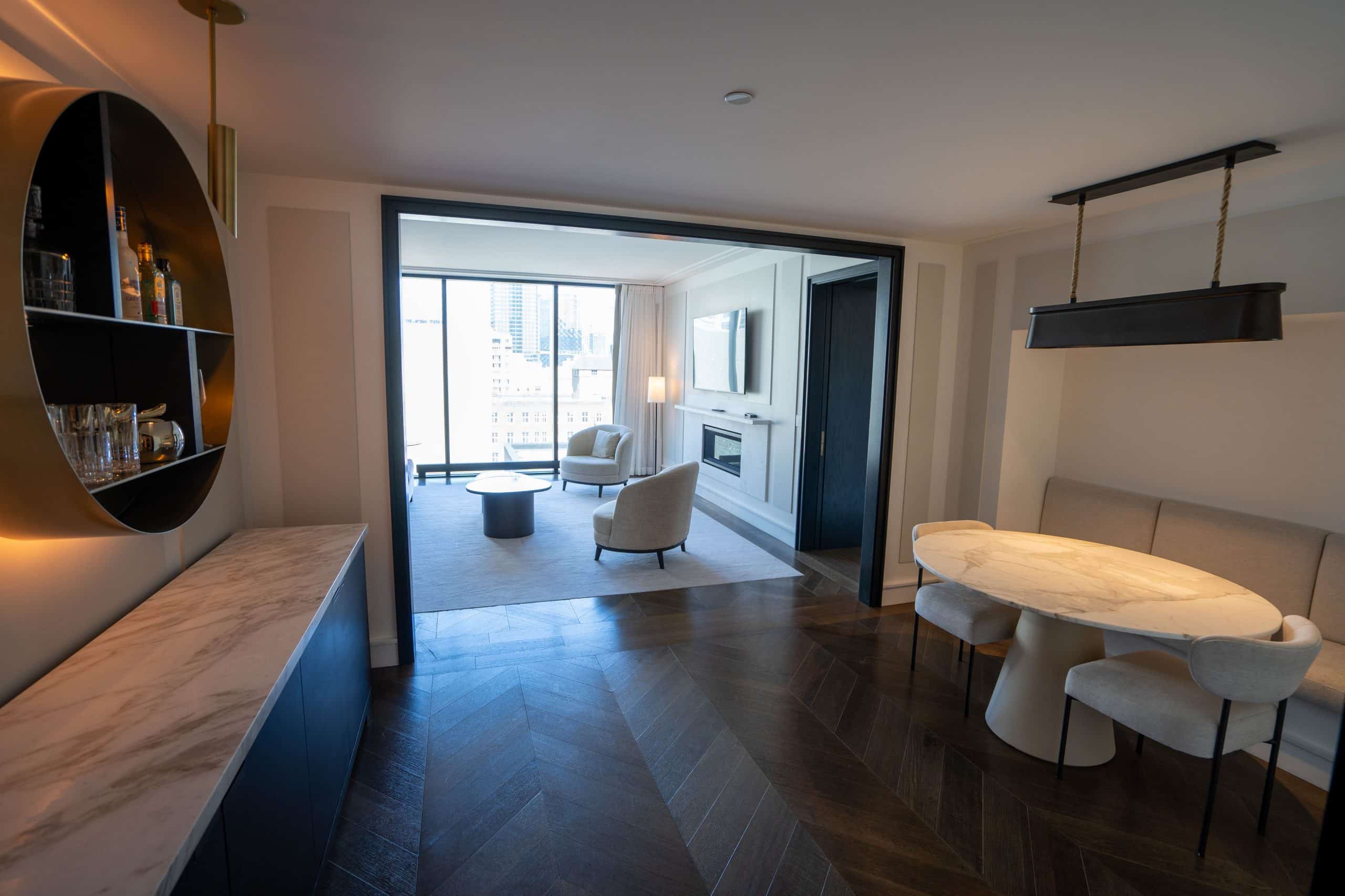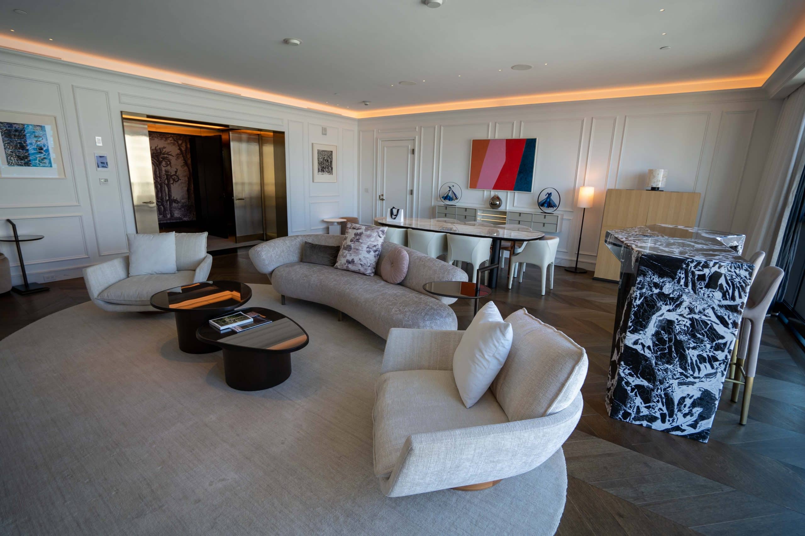 Upon entering the suite, guests are greeted by a sleek living area, furnished with plush seating and a dining table that comfortably accommodates up to eight people.