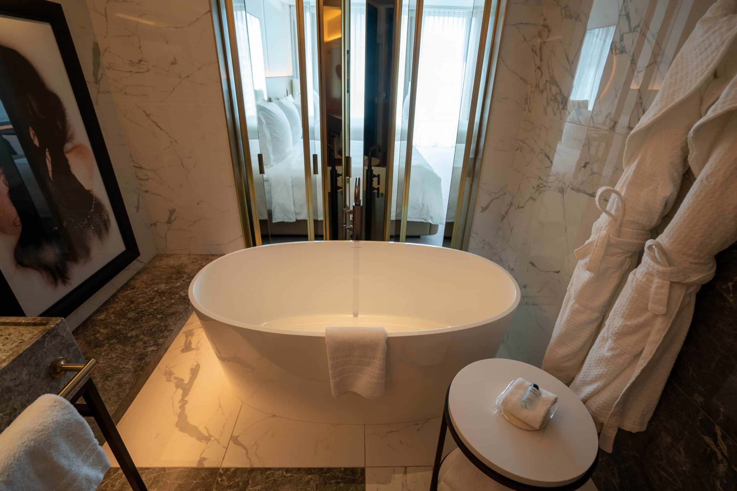 There’s a single vanity to the left, complete with elegant bronzed fixtures and a large mirror. The centrepiece of the bathroom is a deep freestanding circular bathtub, with an adjacent side table and two plush robes to the right.