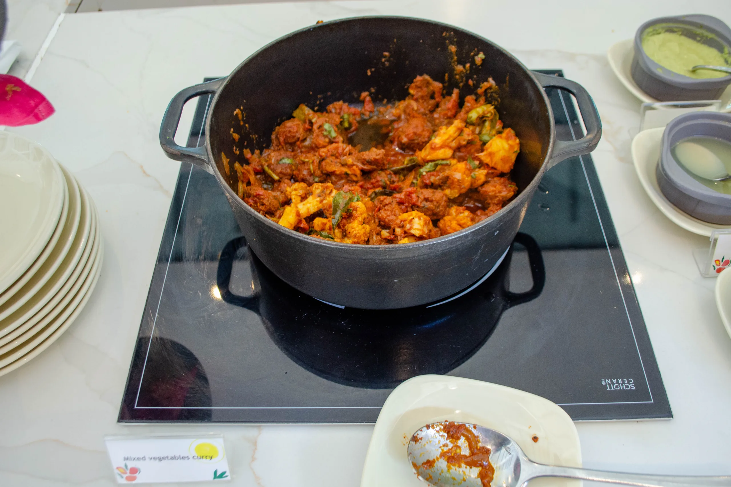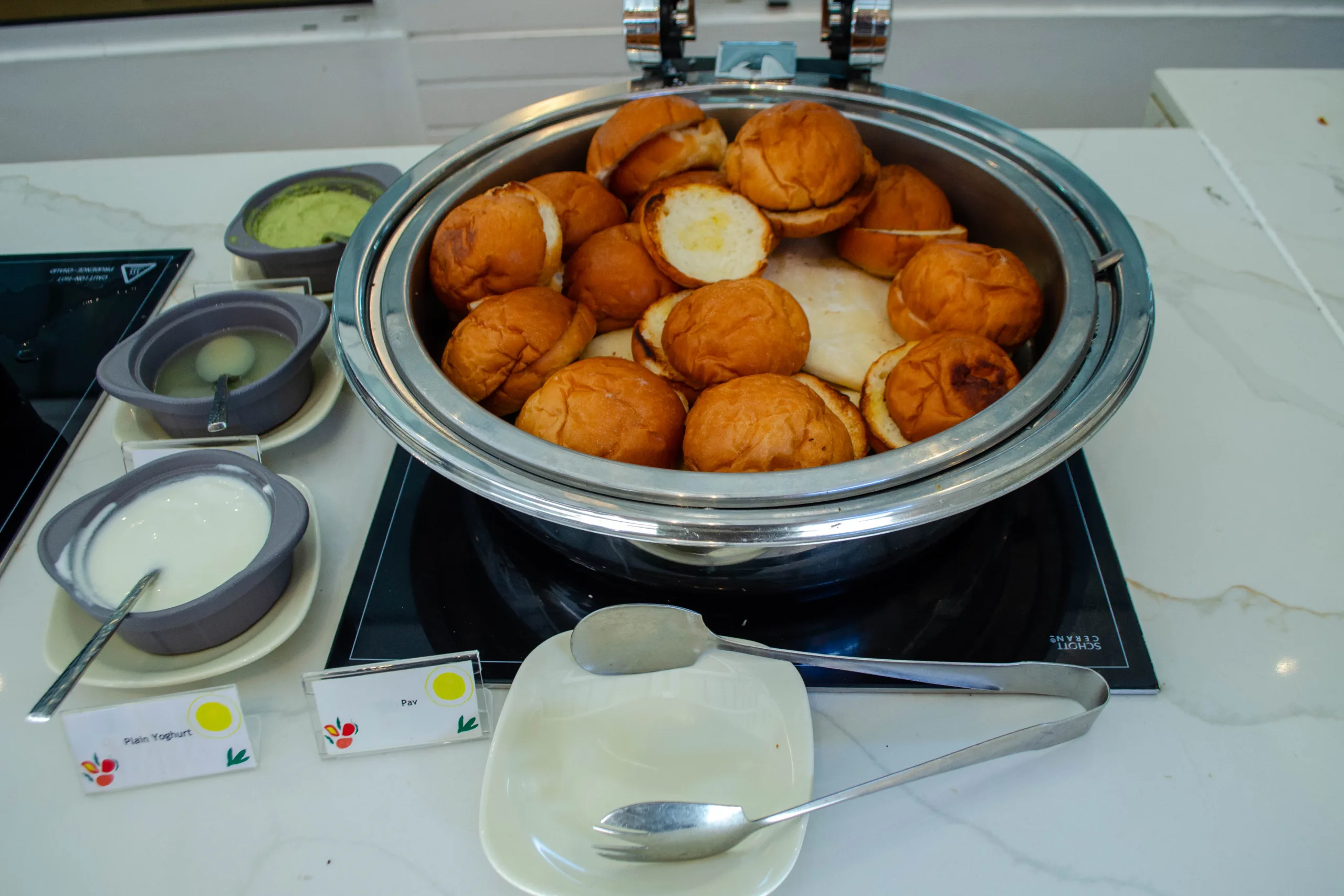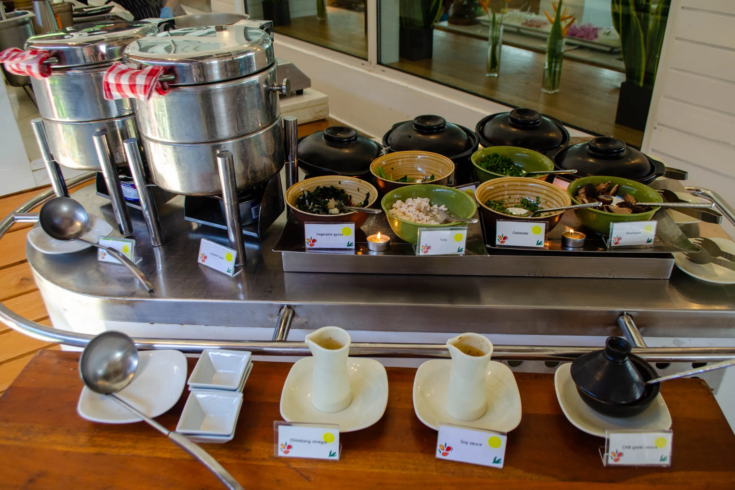 Hot items available at the buffet include soups, curry, lentils, ful-medames, and traditional breakfast staples such as porridge, bacon, sausages.