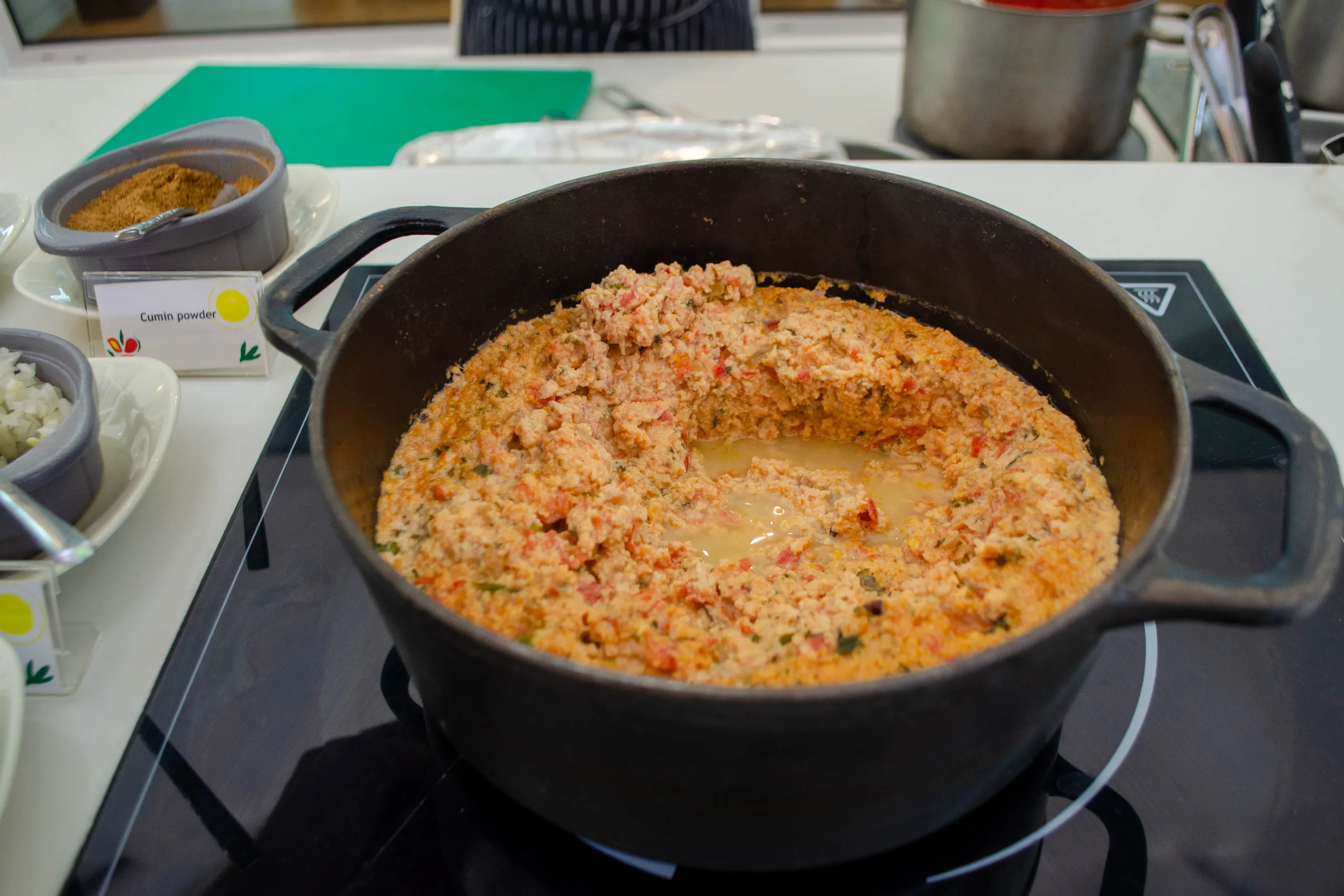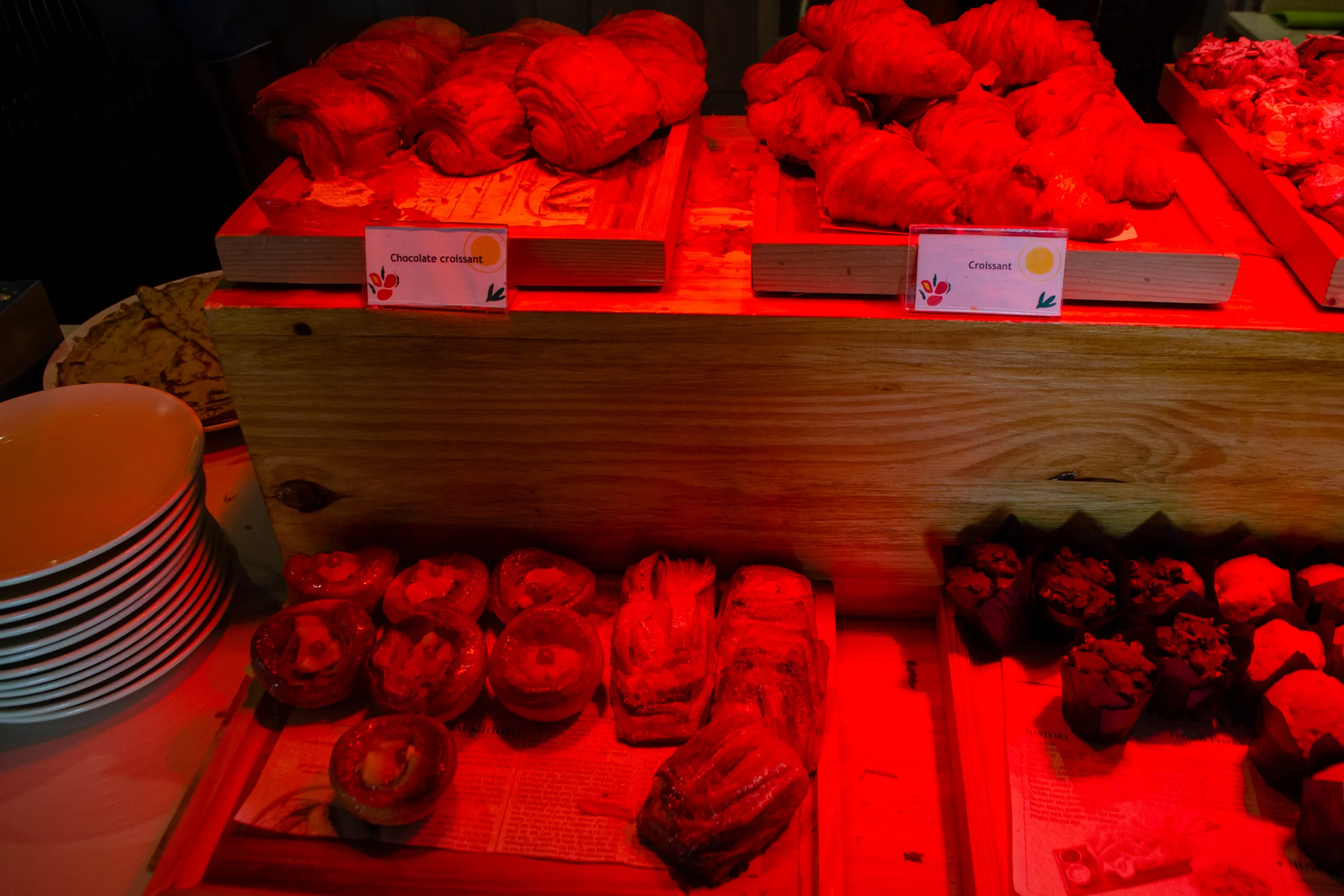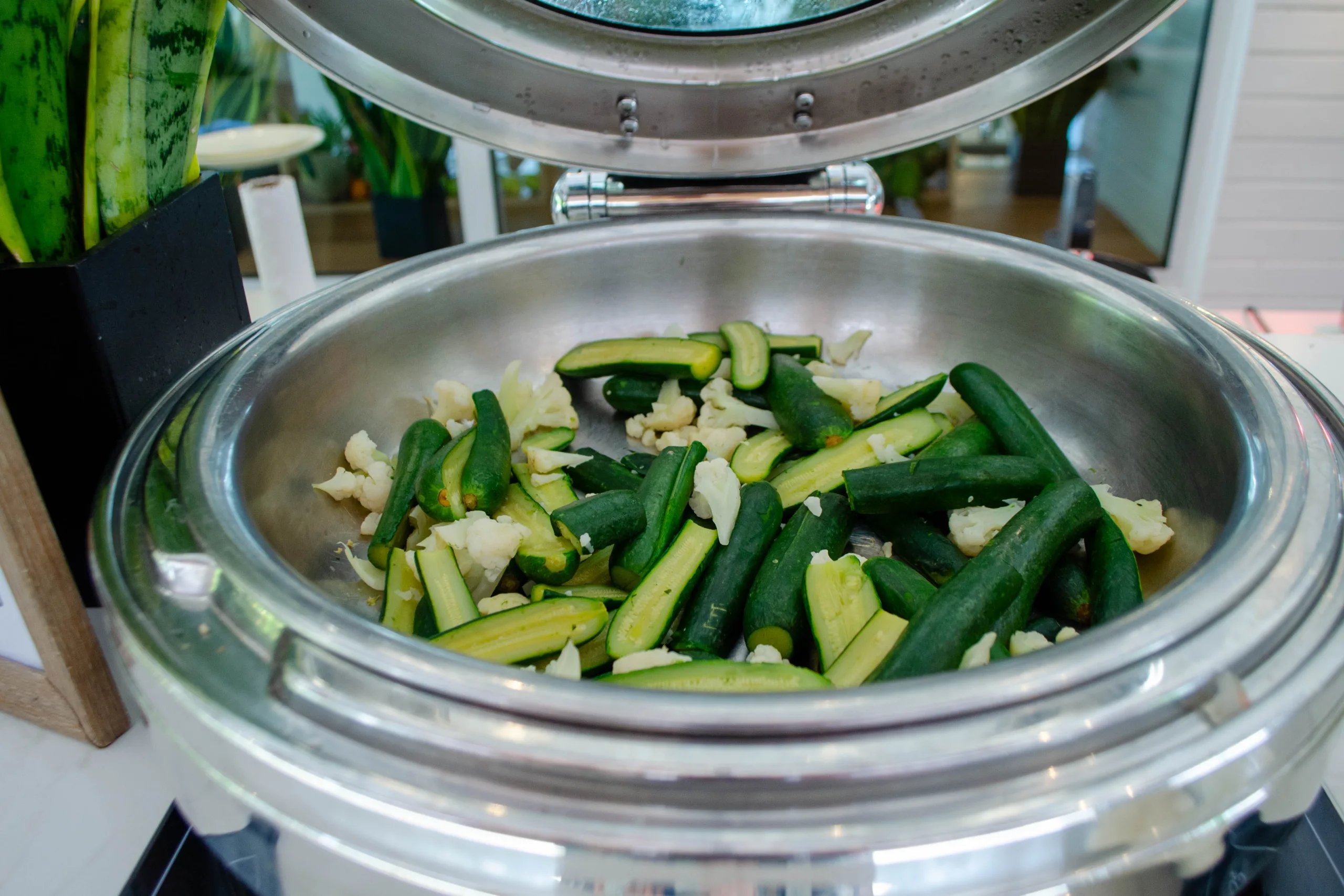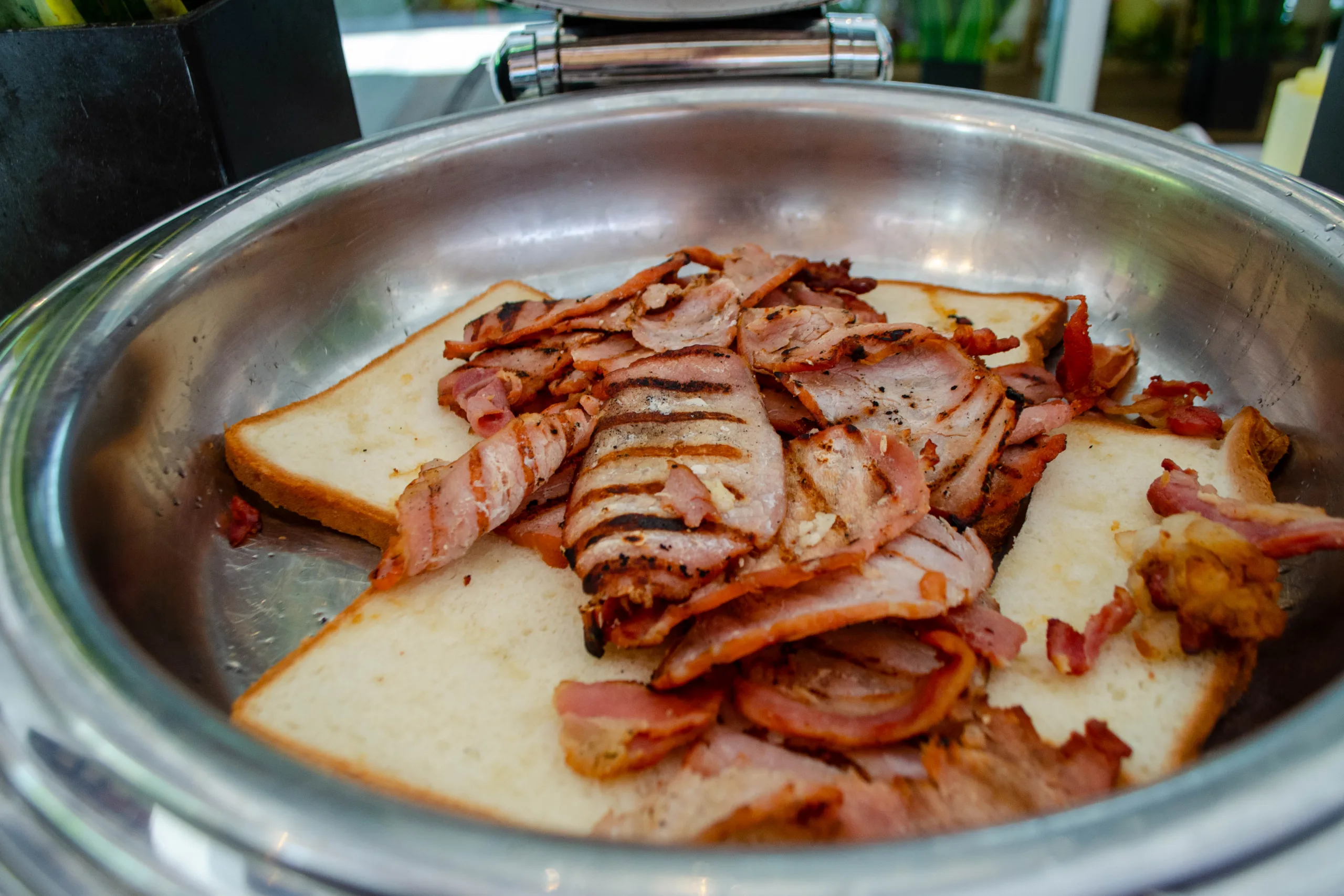 Hot items available at the buffet include soups, curry, lentils, ful-medames, and traditional breakfast staples such as porridge, bacon, sausages.