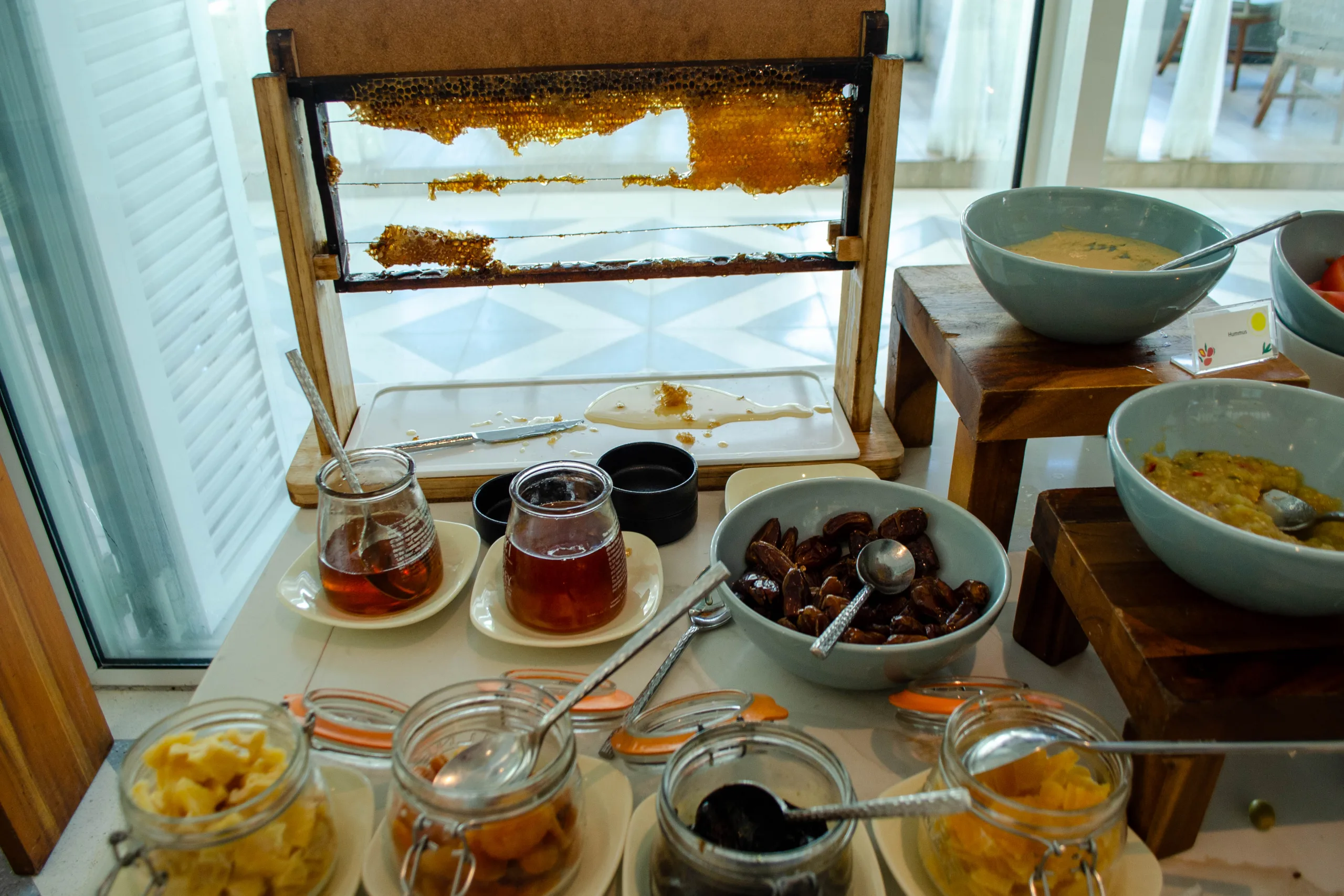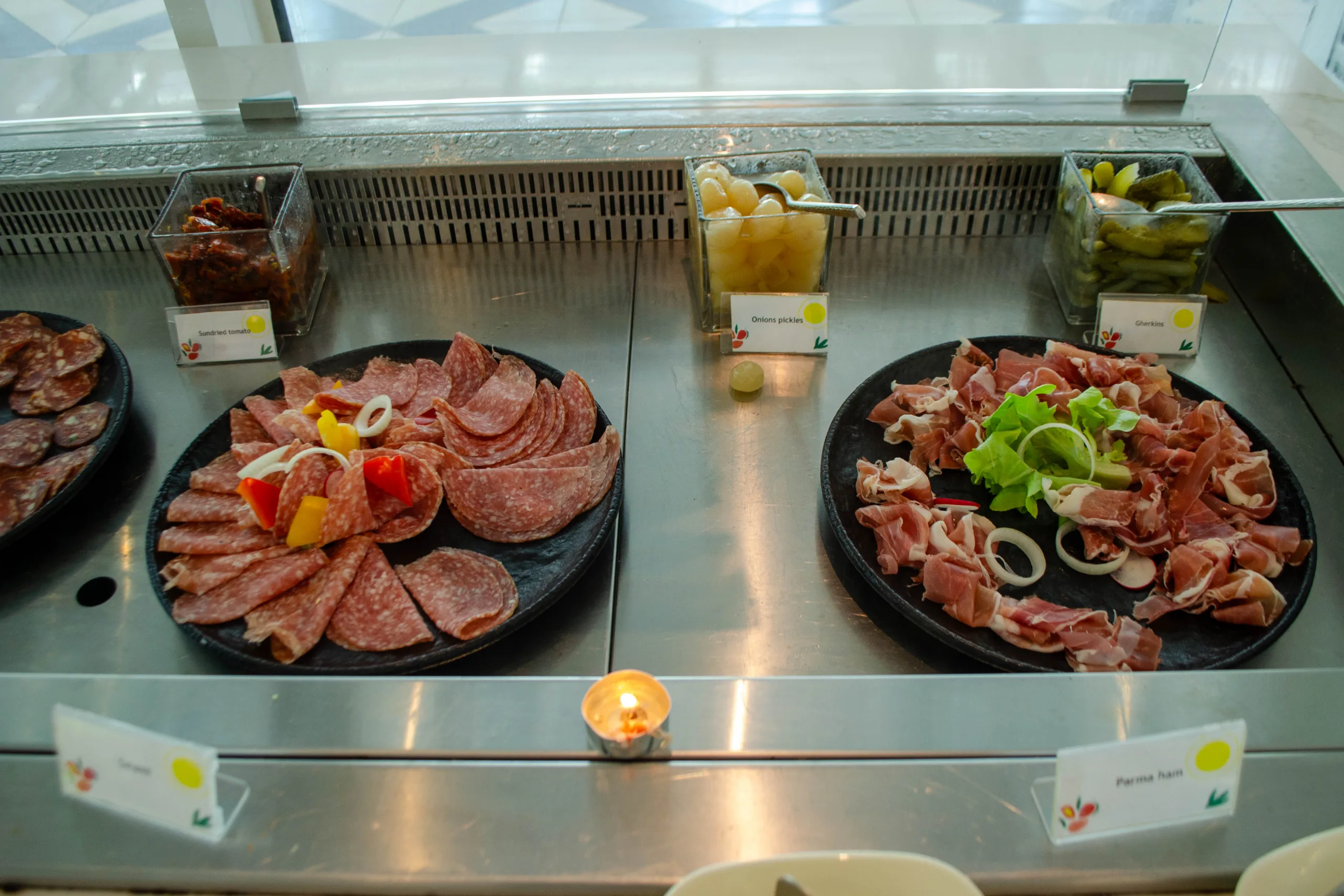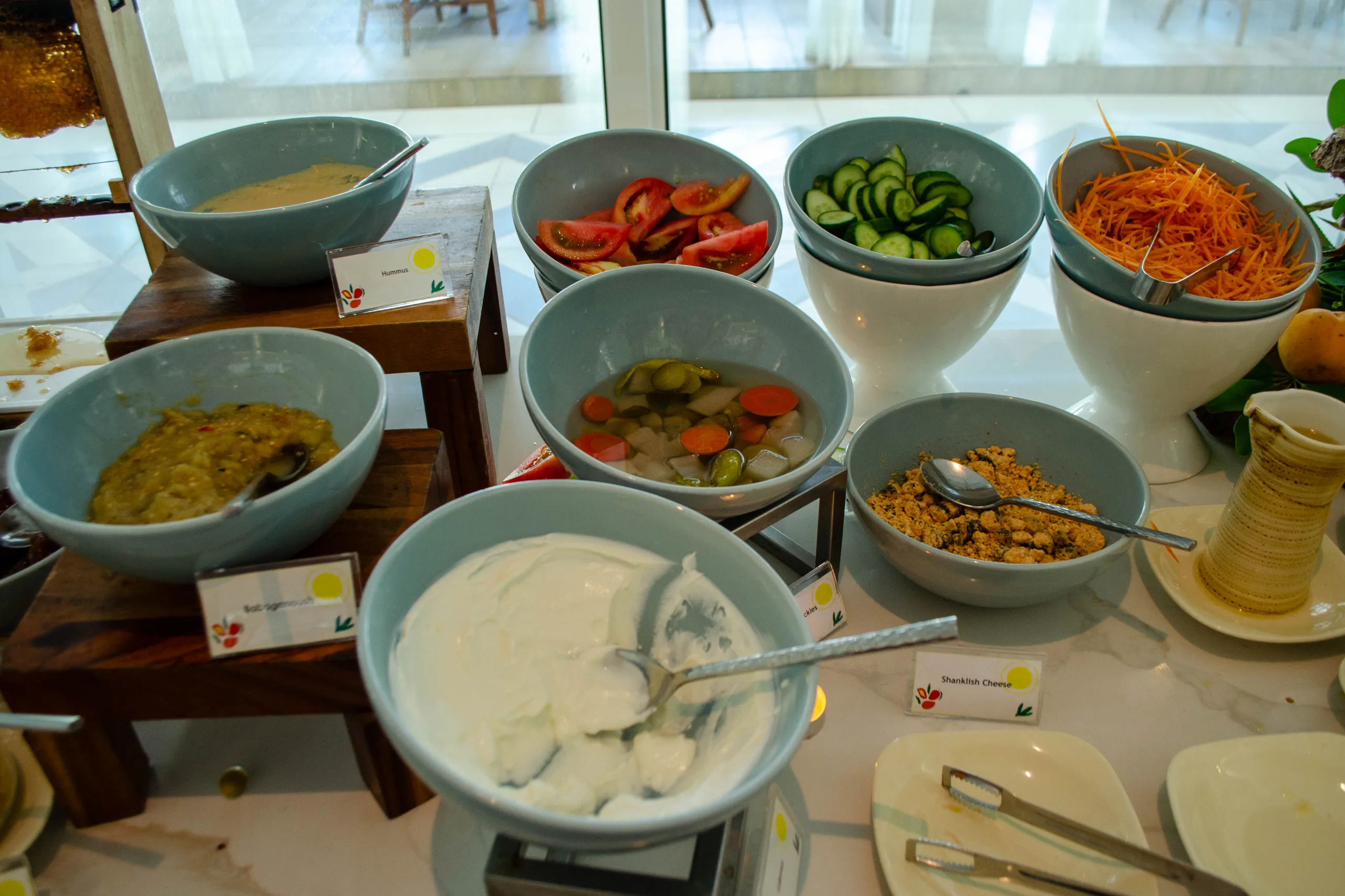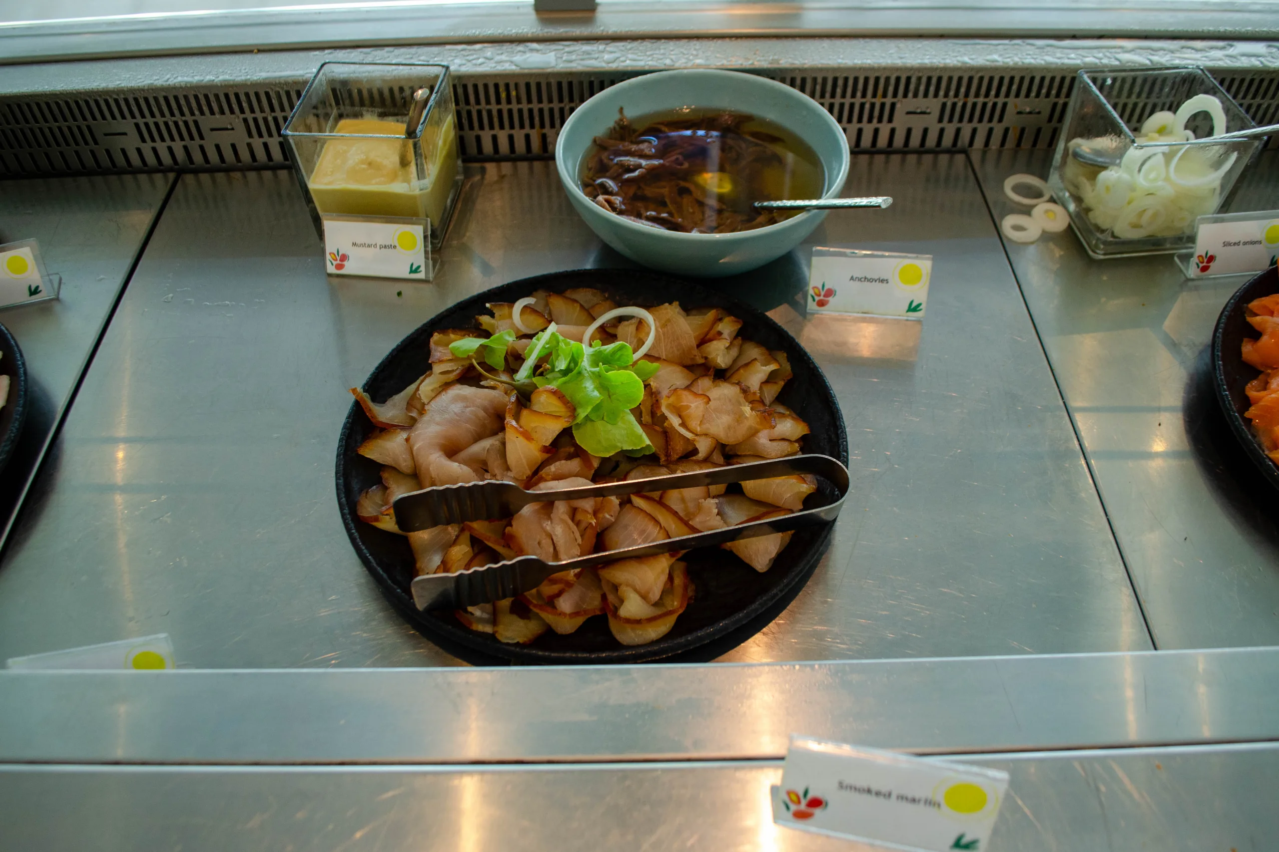 The cold section provides a cured meats platter, freshly sourced honey, salads, smoked fish, and a broad cheese selection.
