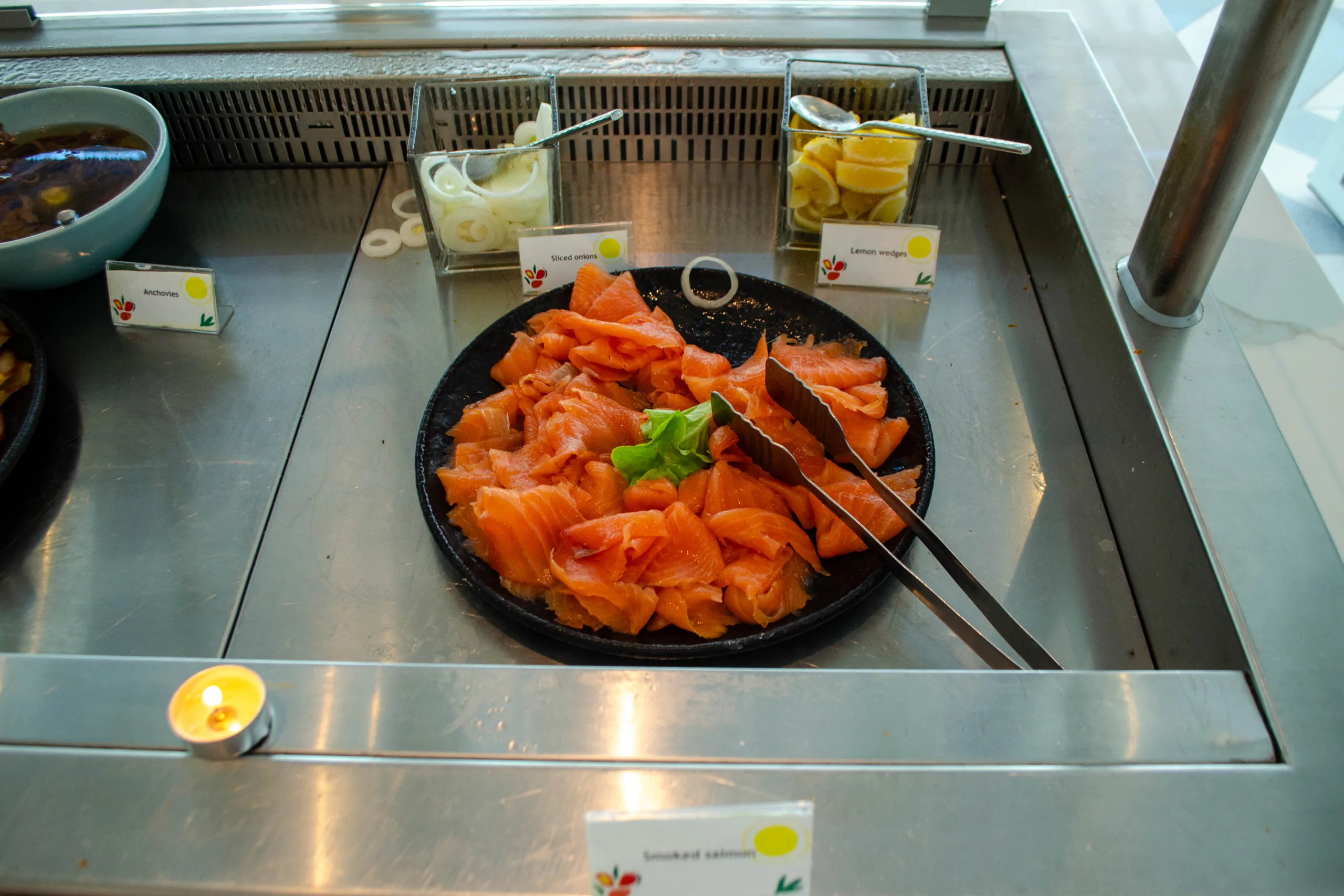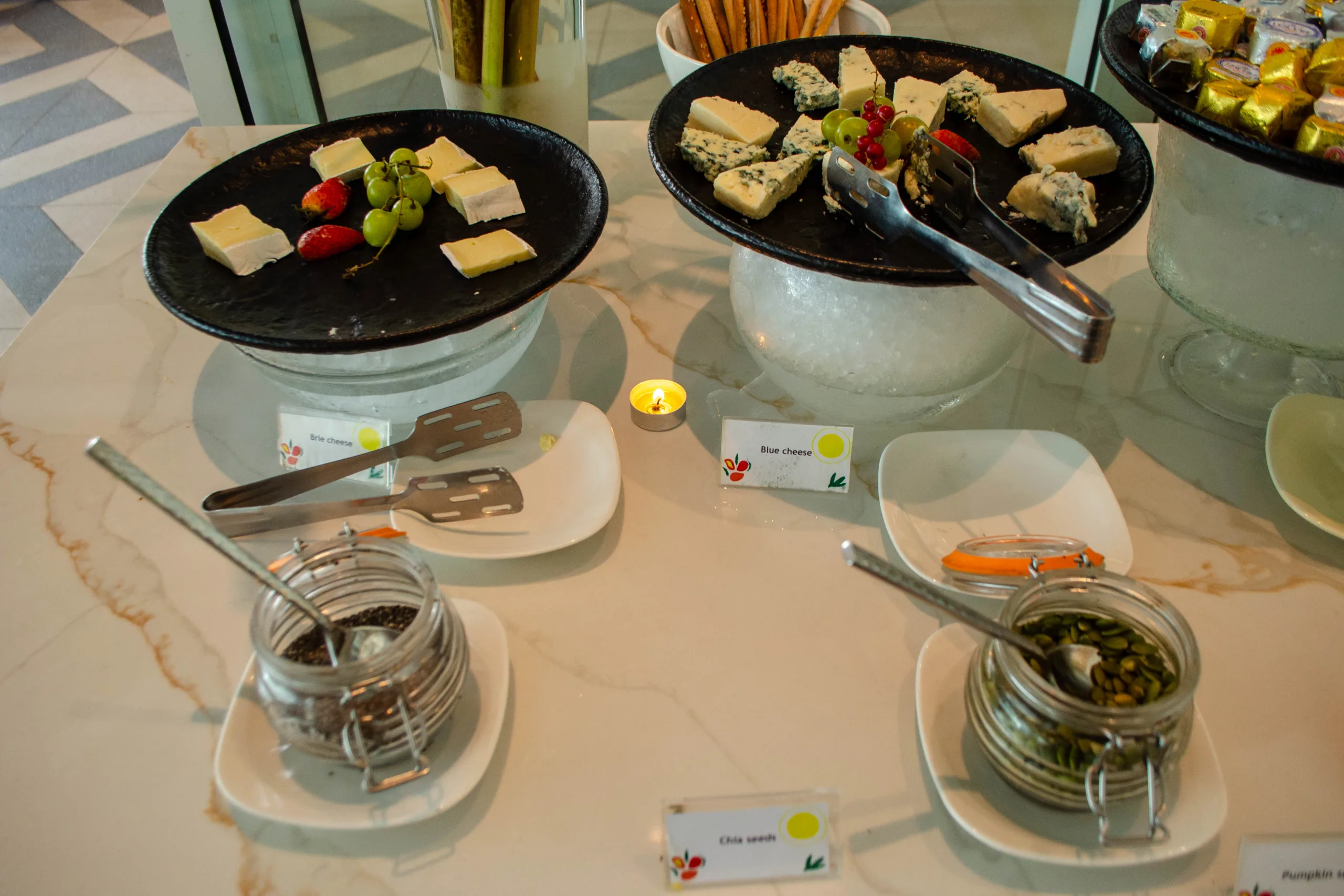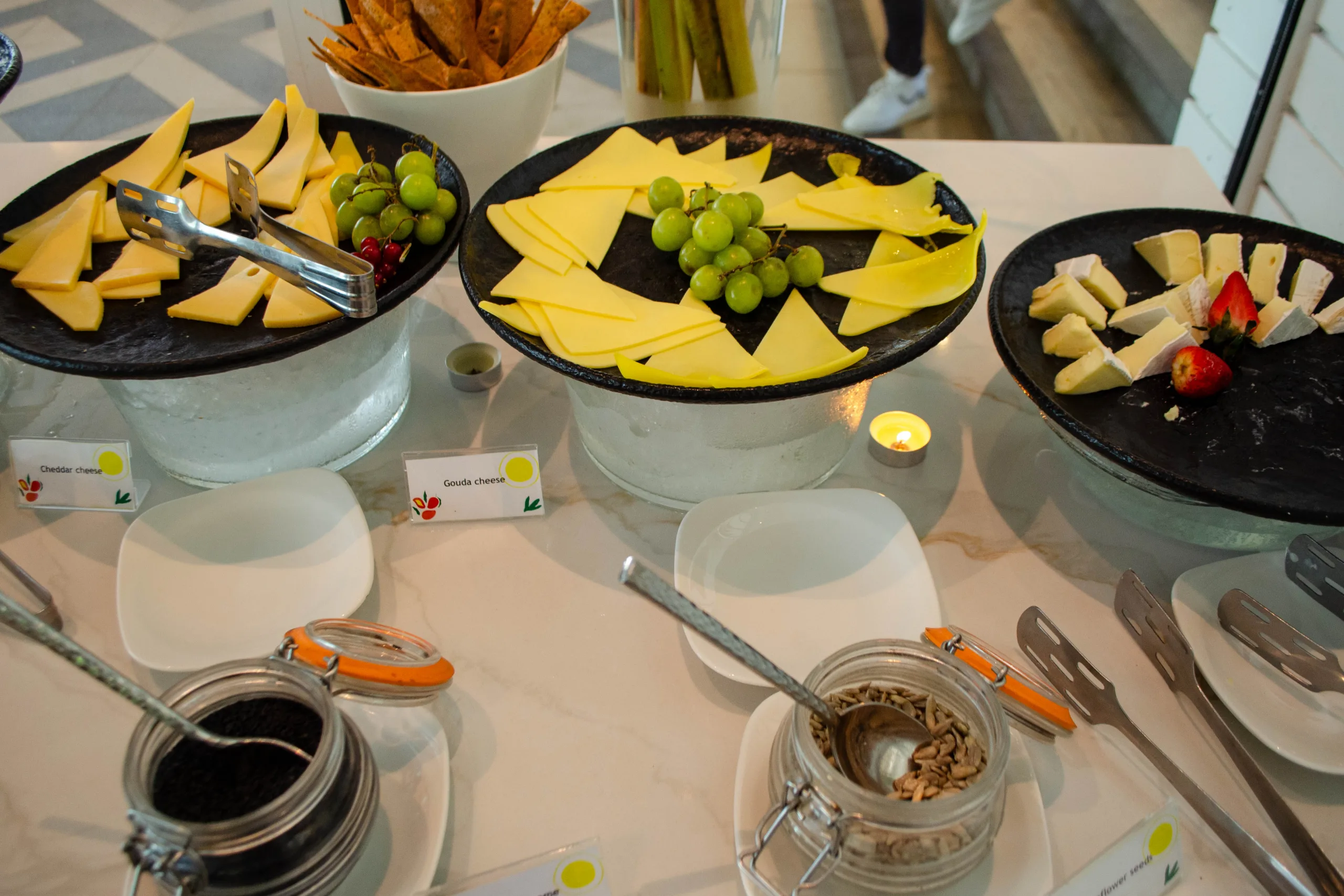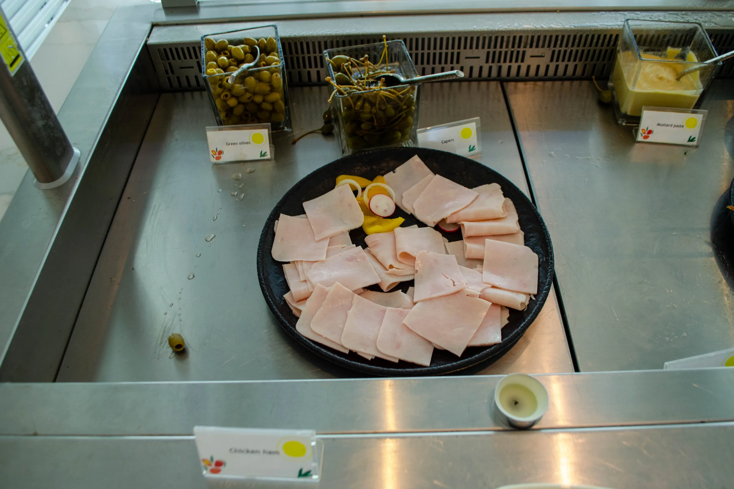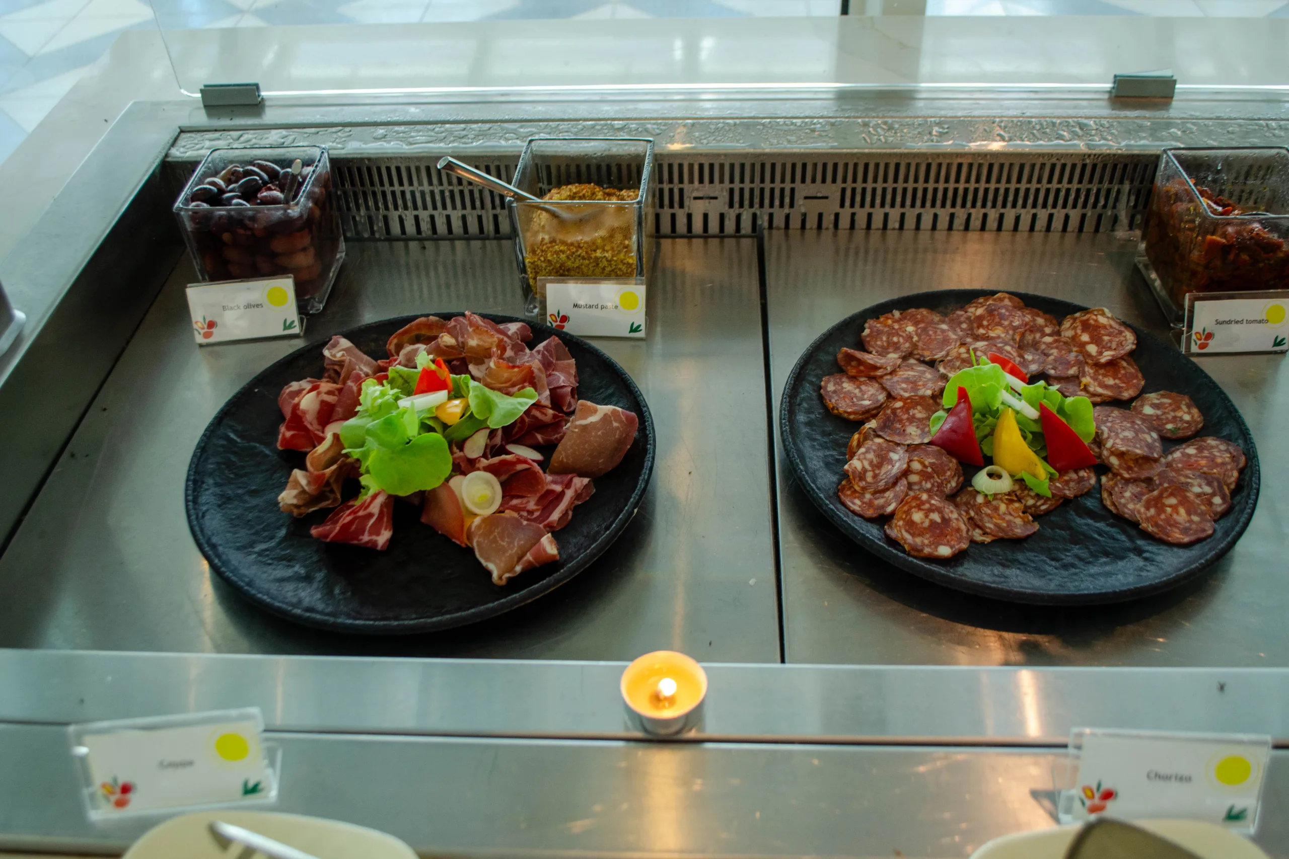 The cold section provides a cured meats platter, freshly sourced honey, salads, smoked fish, and a broad cheese selection.