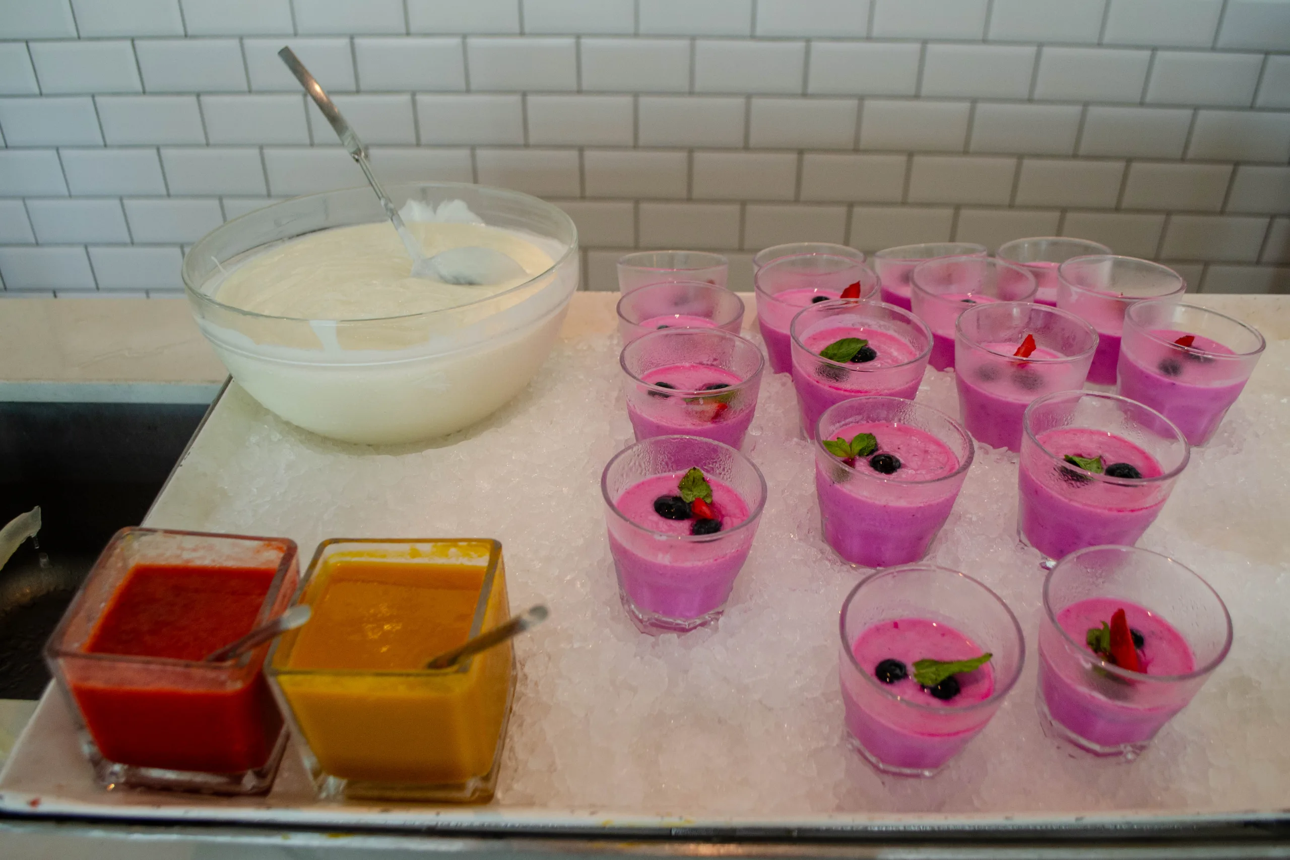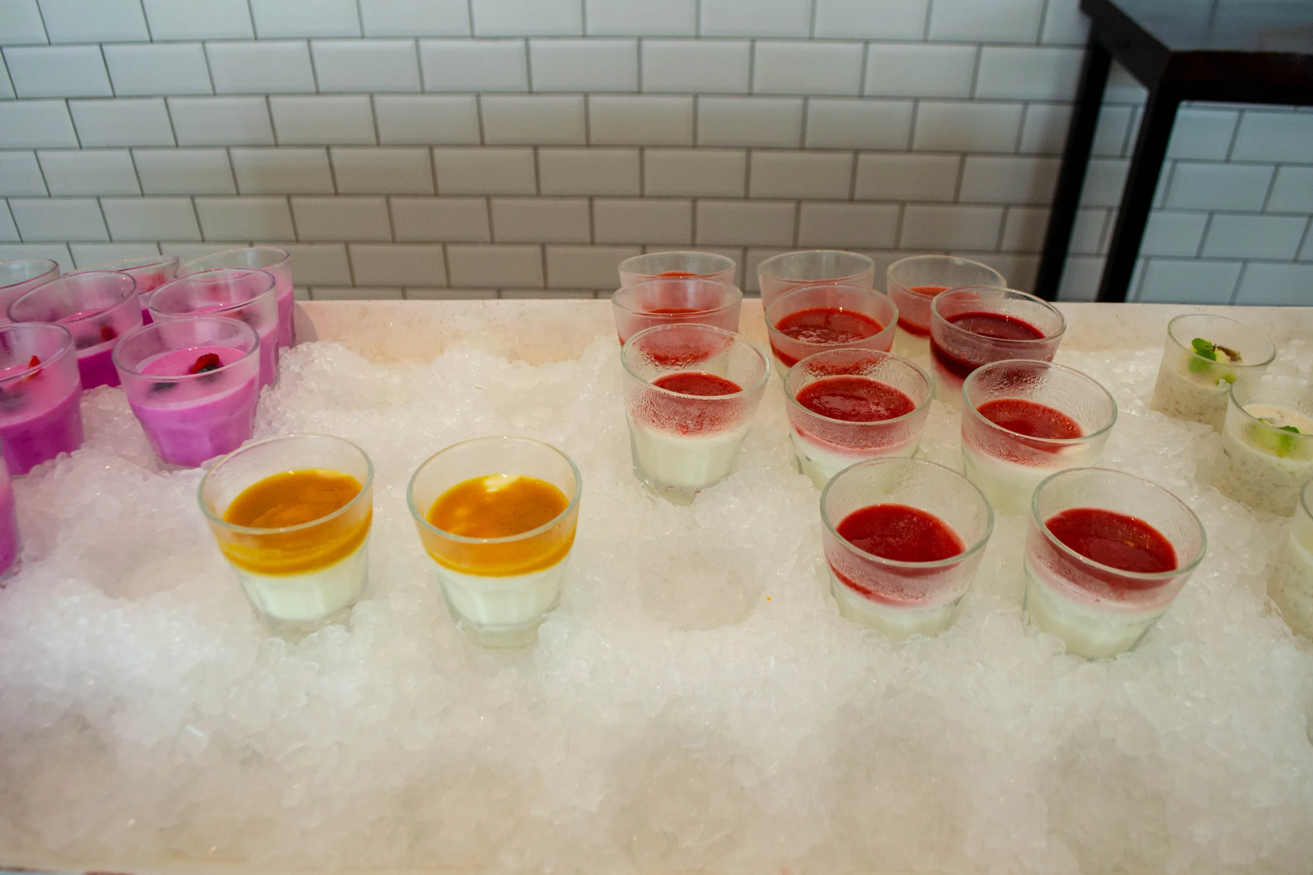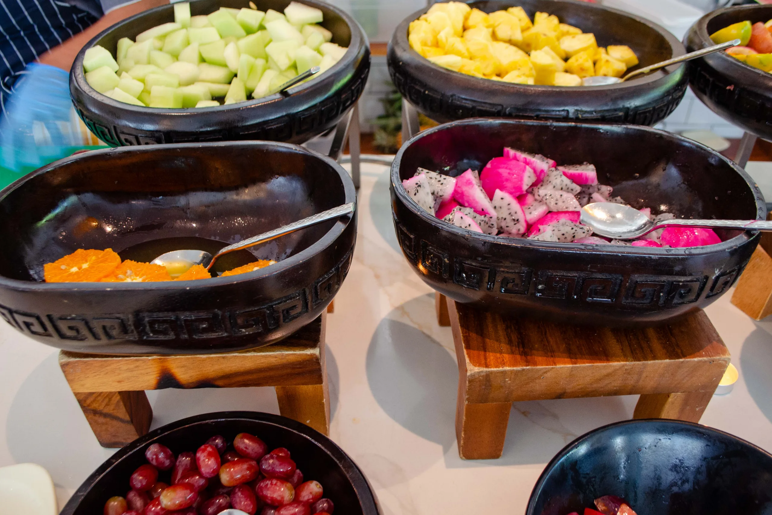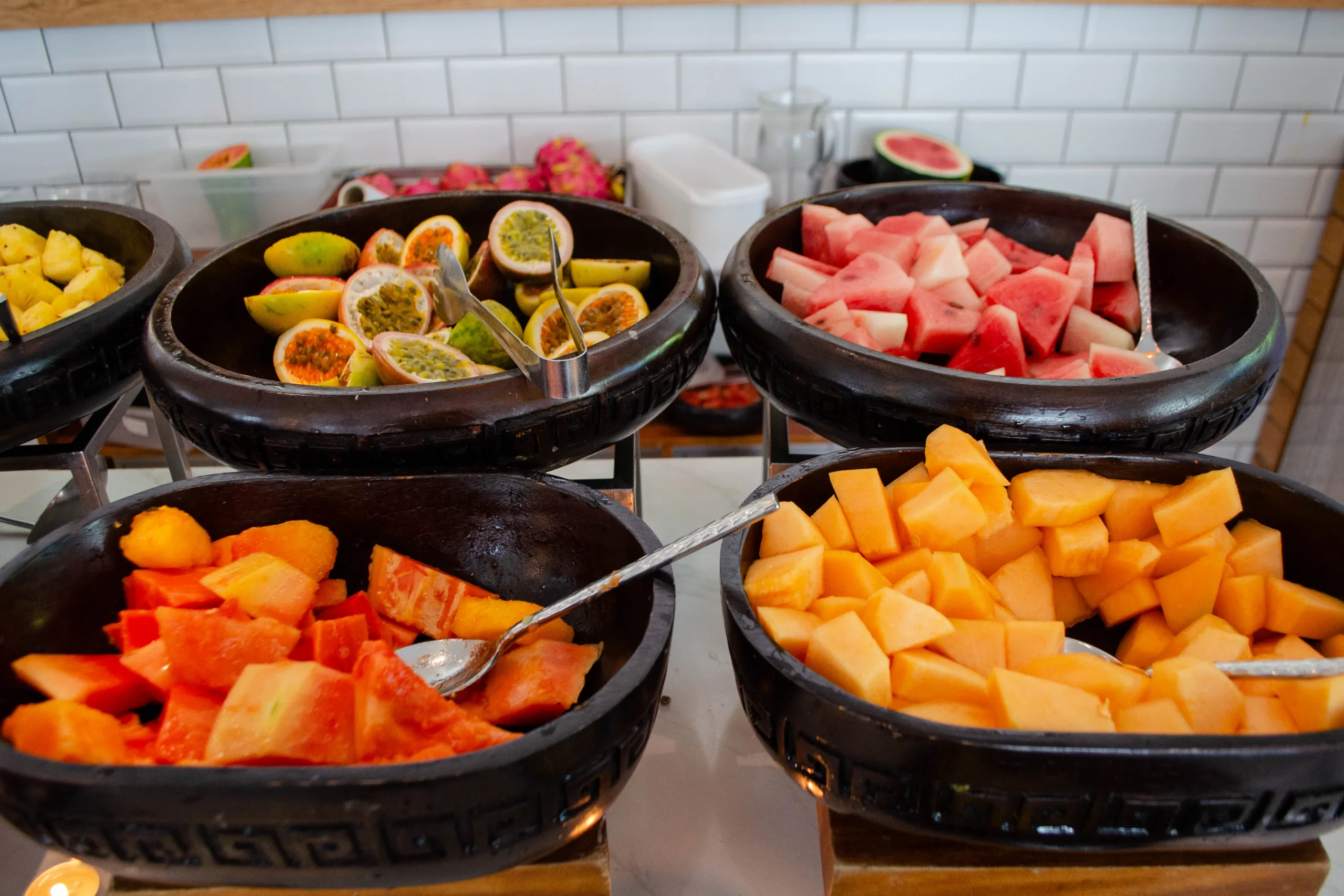 Lighter options like yogurt parfaits, panna cotta, and a variety of fresh fruits, including exotic choices, are also on offer.