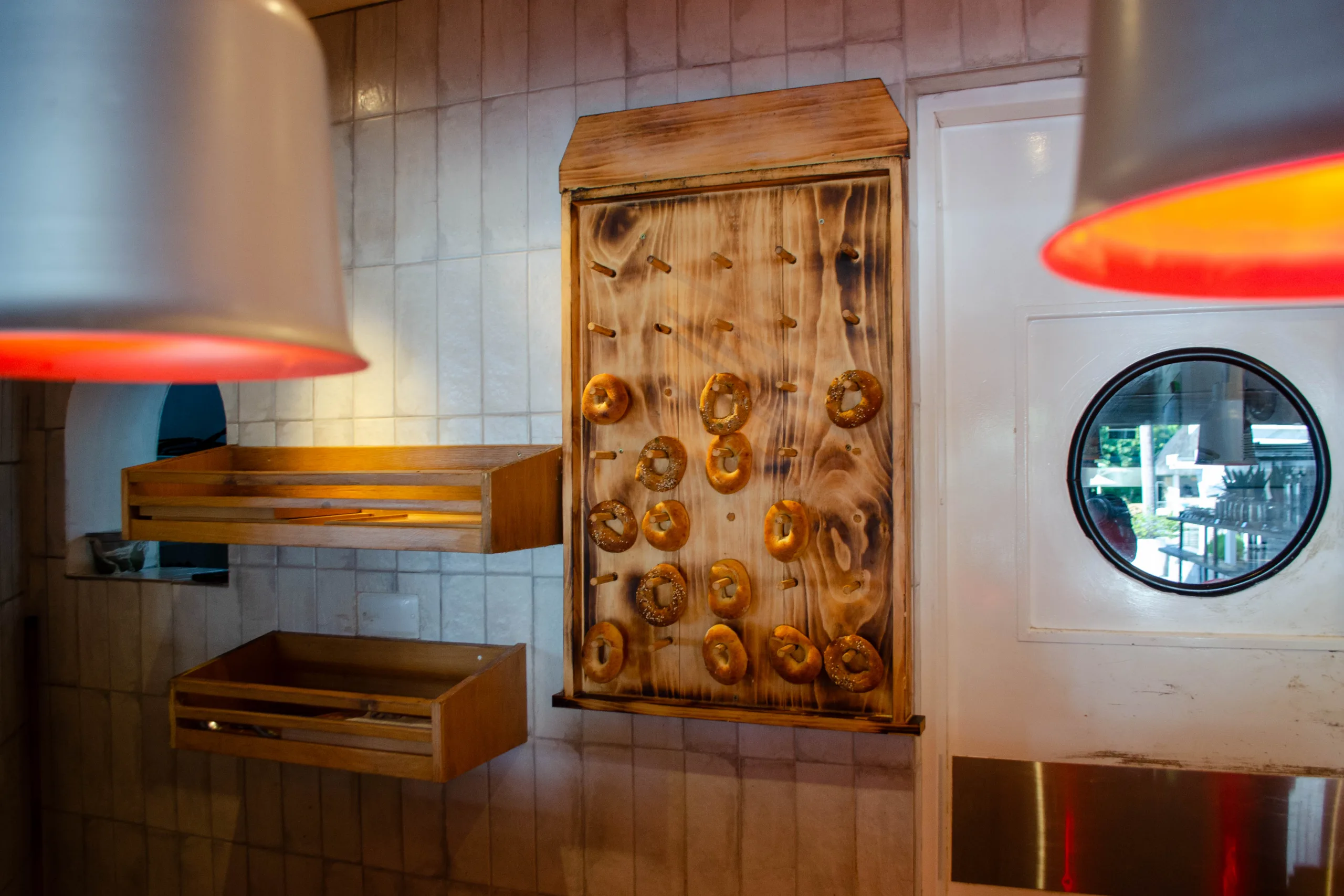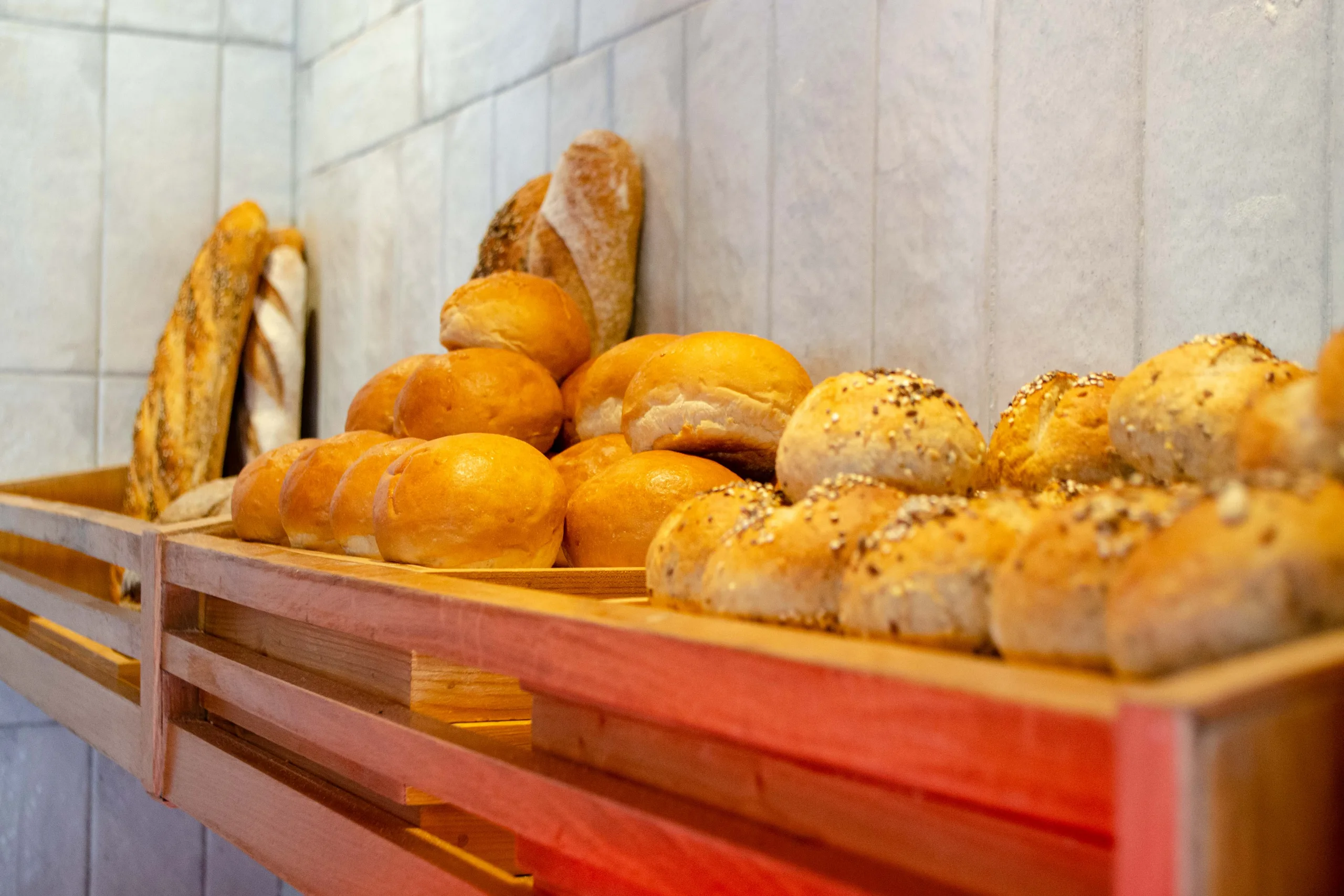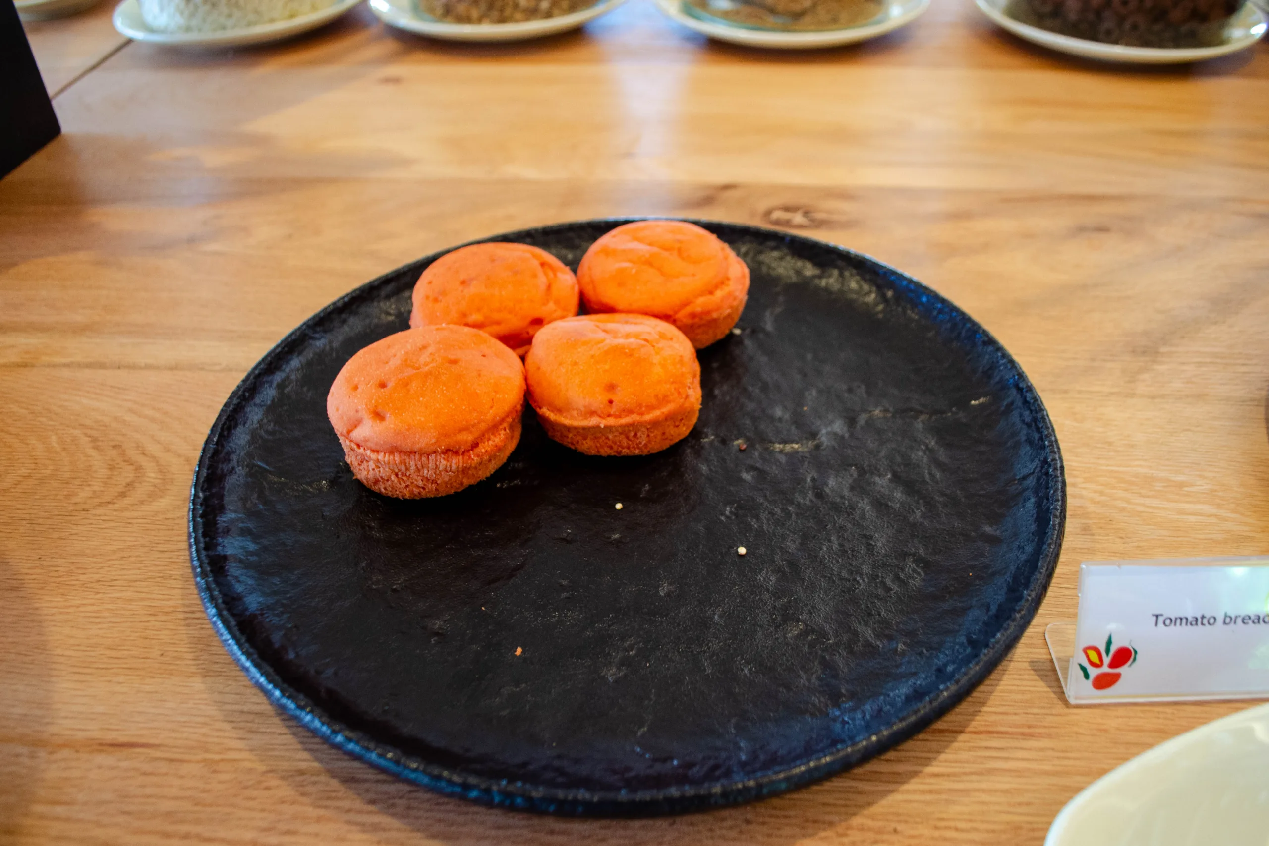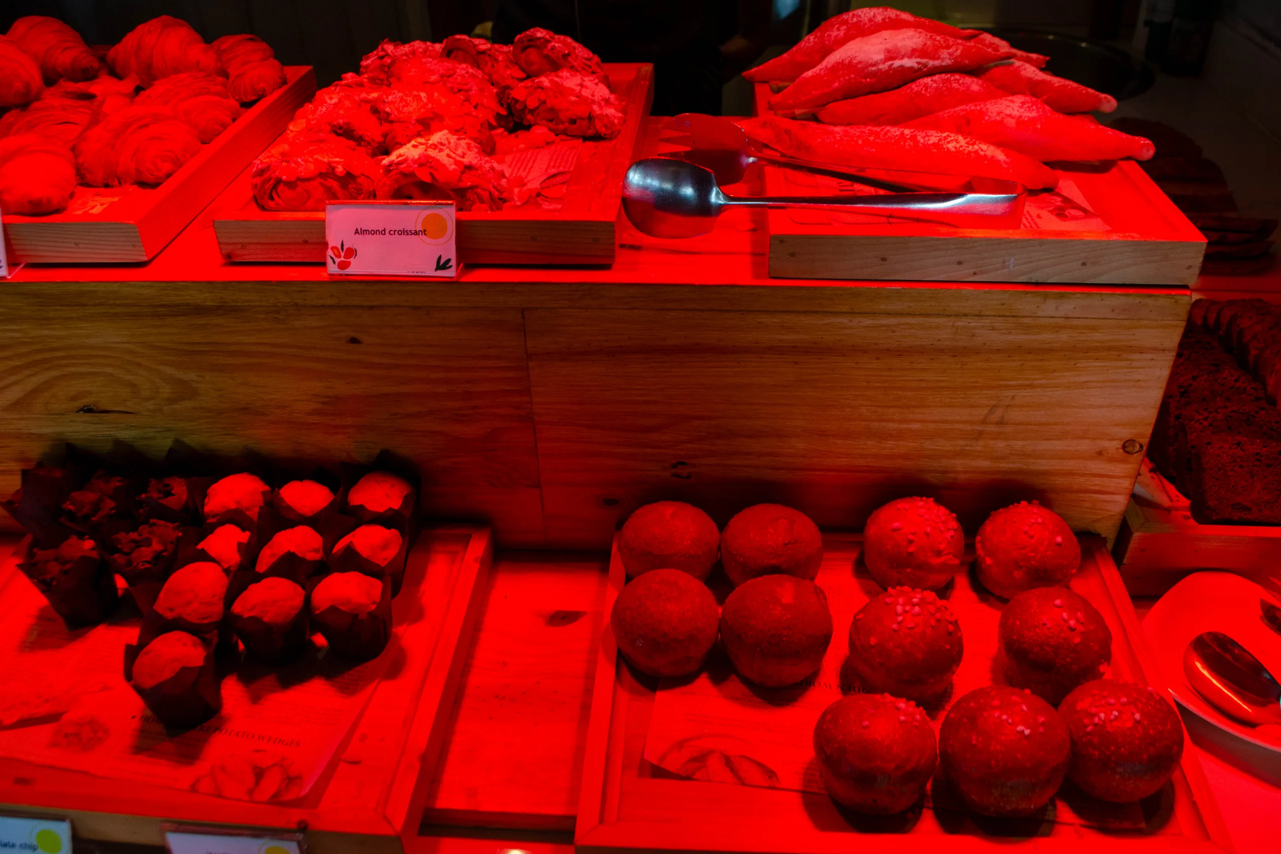 There was a wide assortment of freshly baked items, including a unique bagel display, various pastries, and cakes.