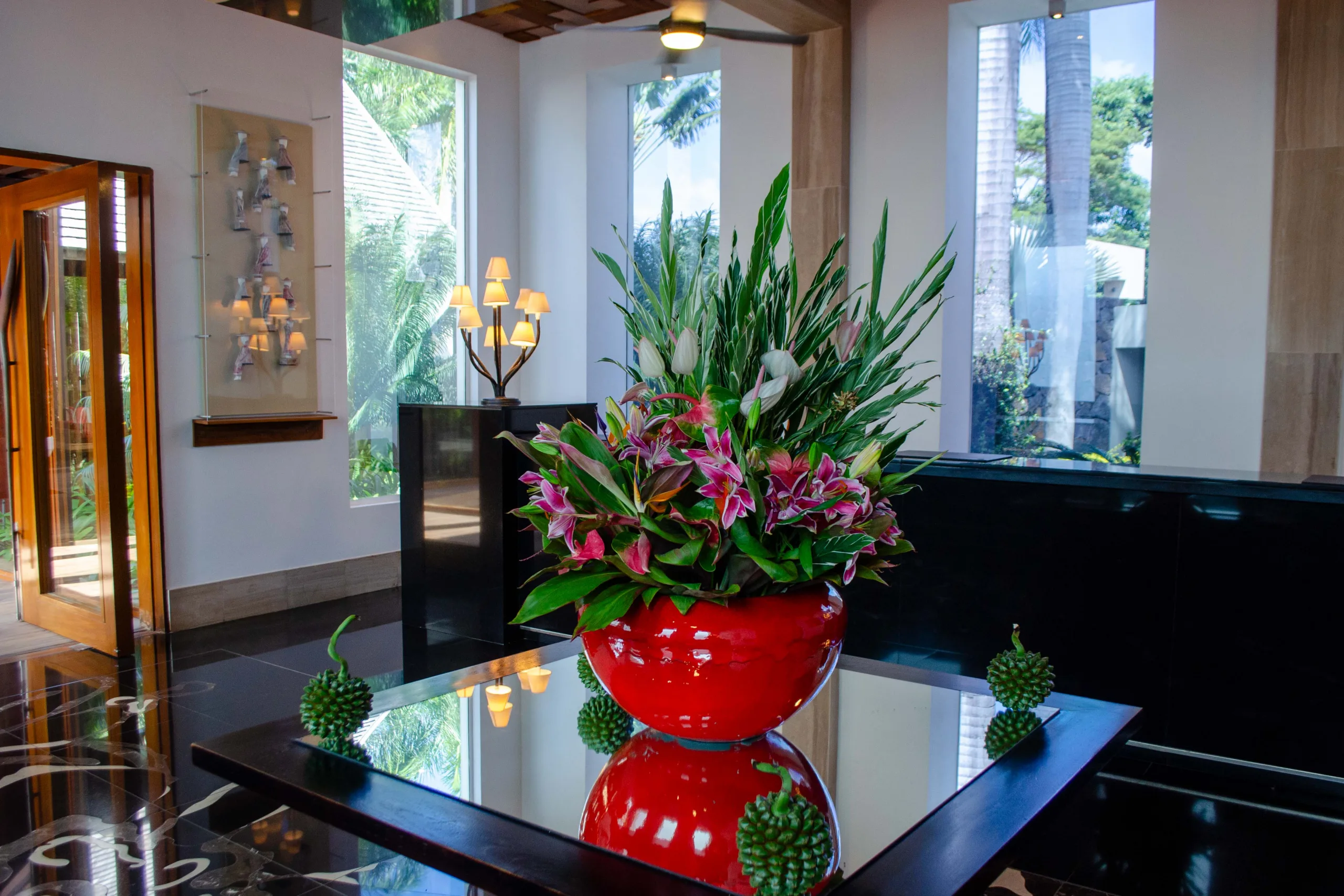 Central to the resort’s design is its focus on outdoor interaction. This is exemplified by the beautifully decorated tiered barachois, or fish breeding ponds, which are adorned with vibrant flowers.