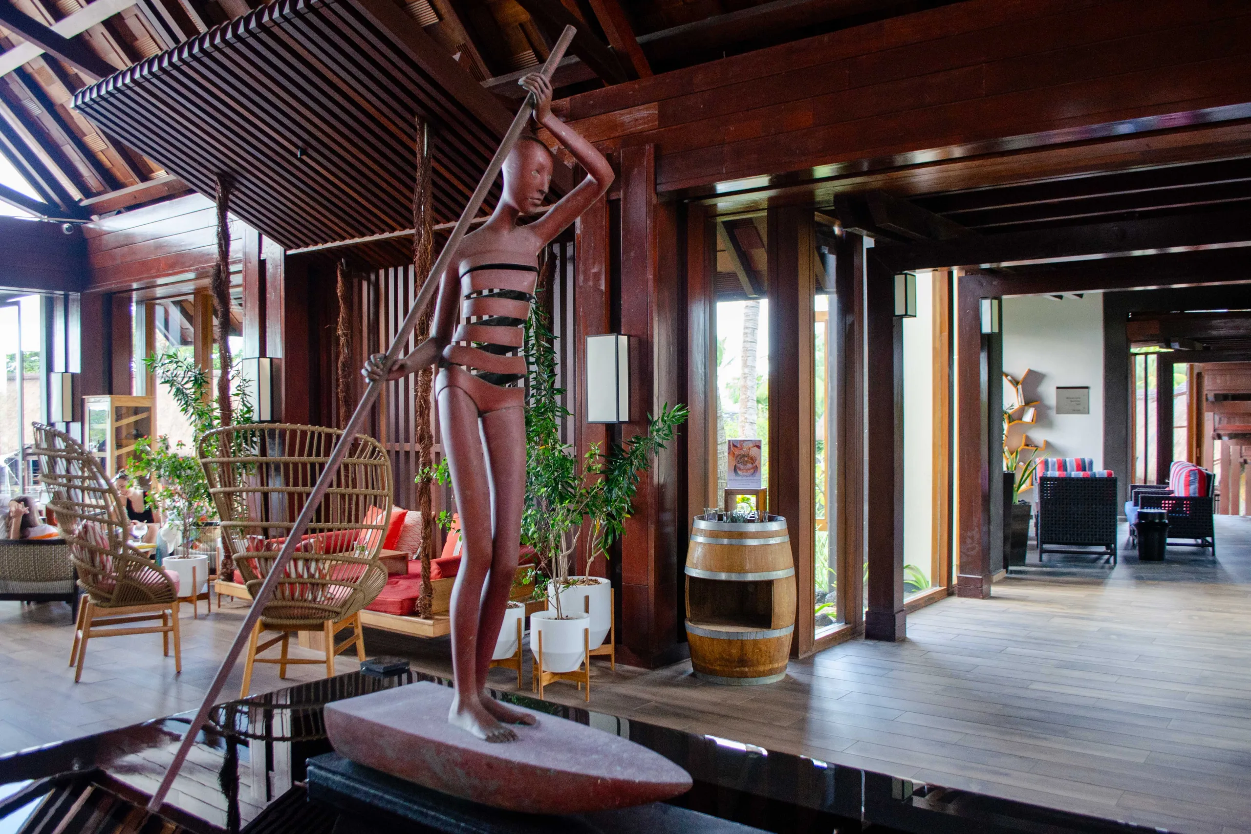 A remarkable sculpture of a paddler stands centrally, adding an artistic touch and infusing the space with a unique spirit.