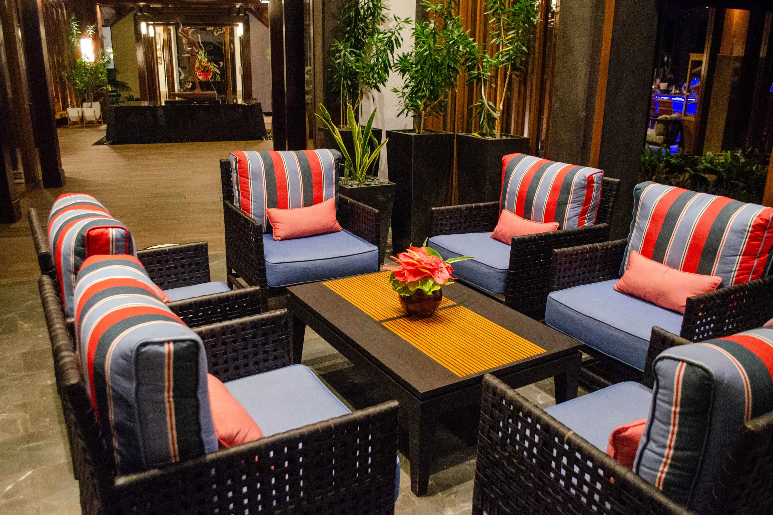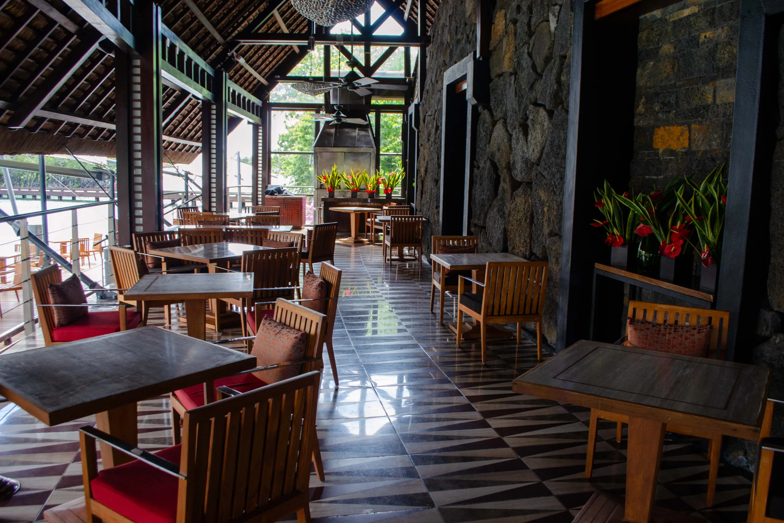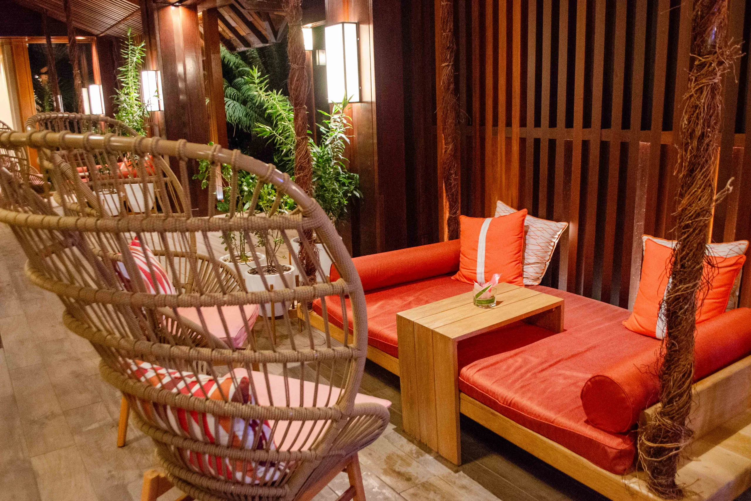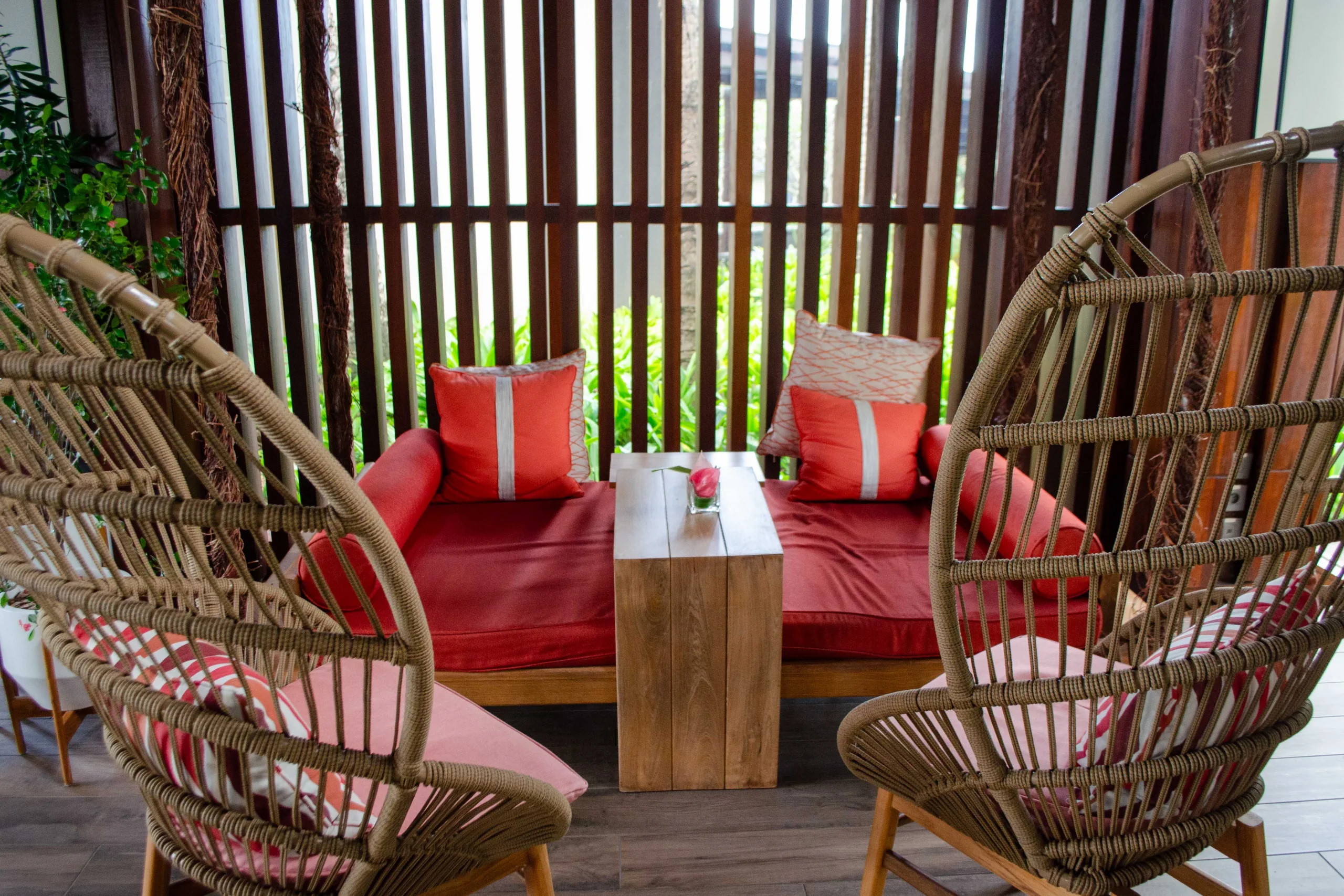 The seating arrangement complements this, with woven basket chairs and plush cushions creating cozy nooks, while the dark wooden benches with vibrant red cushions accentuate the warmth of the space.
