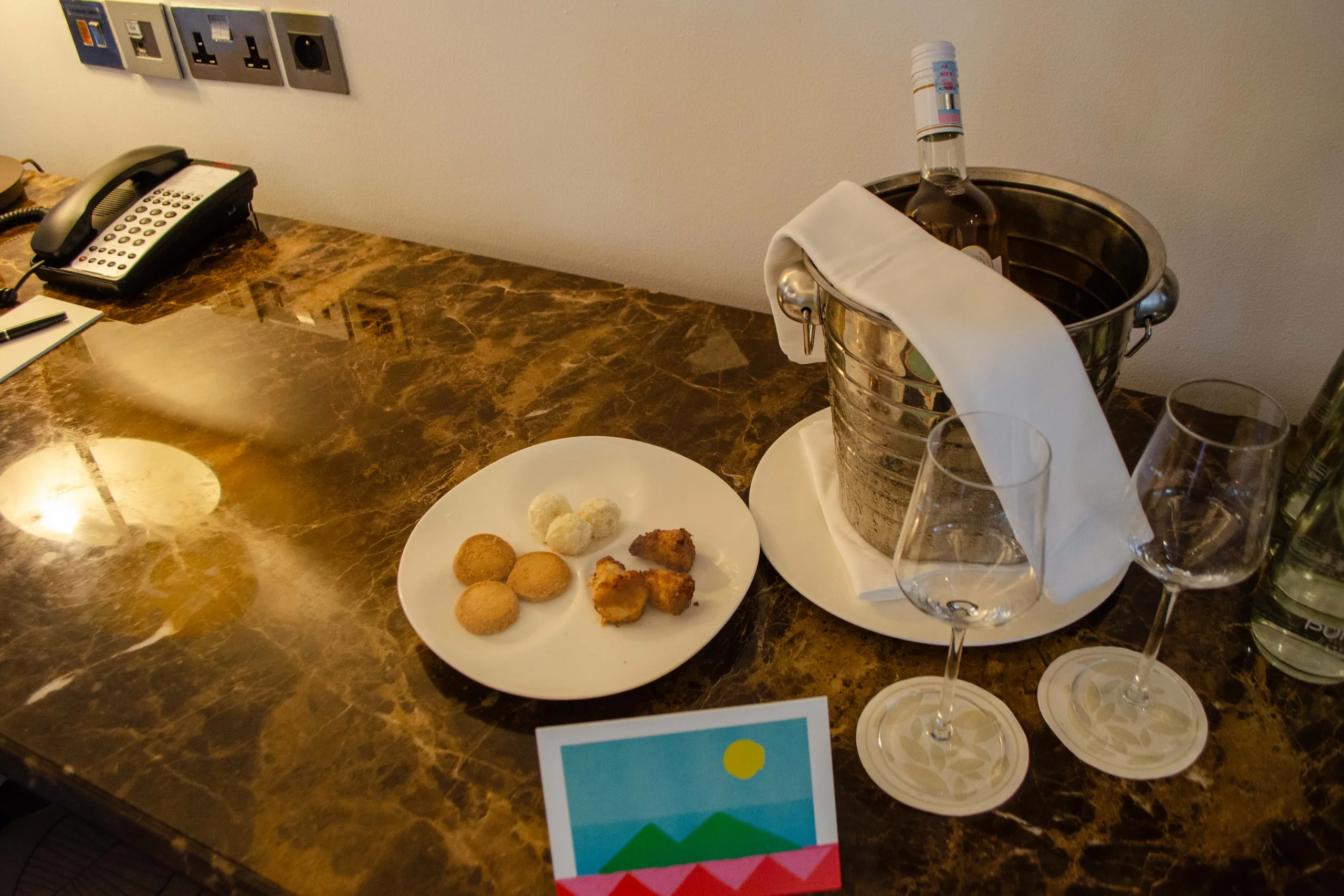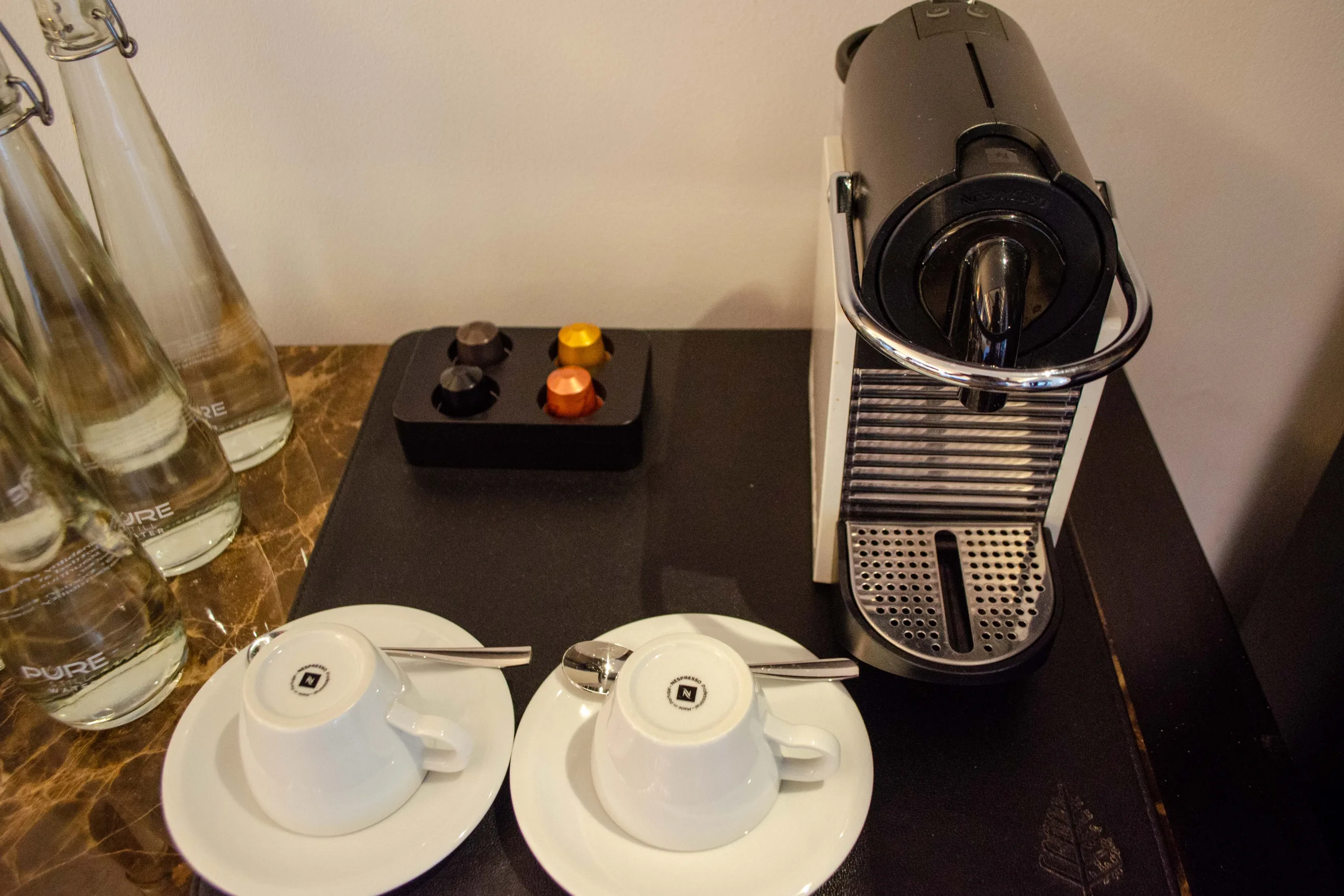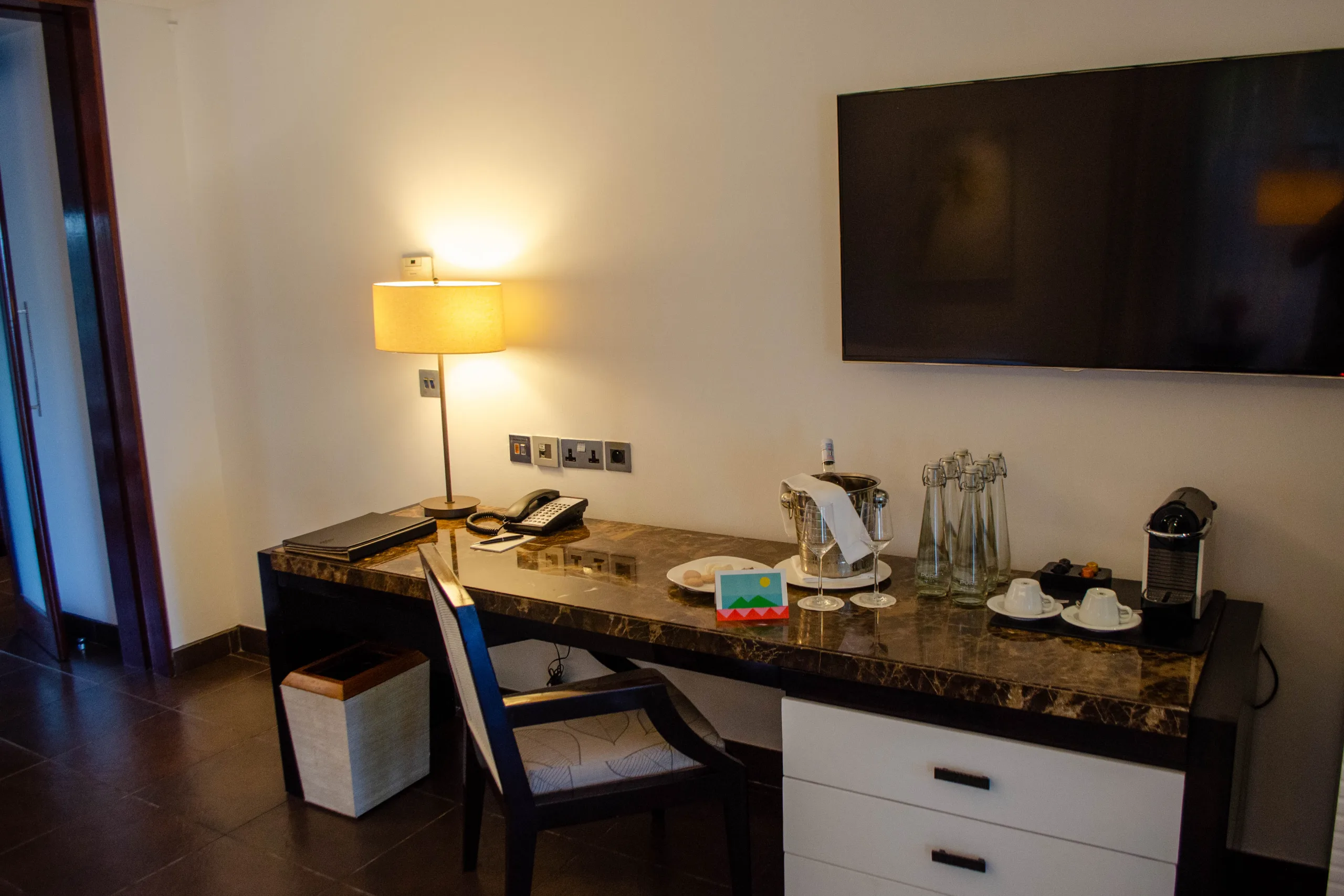 There’s a workspace with a marble-topped desk paired with a chair, and thoughtful touches like a welcome bottle of wine and a Nespresso coffee maker.