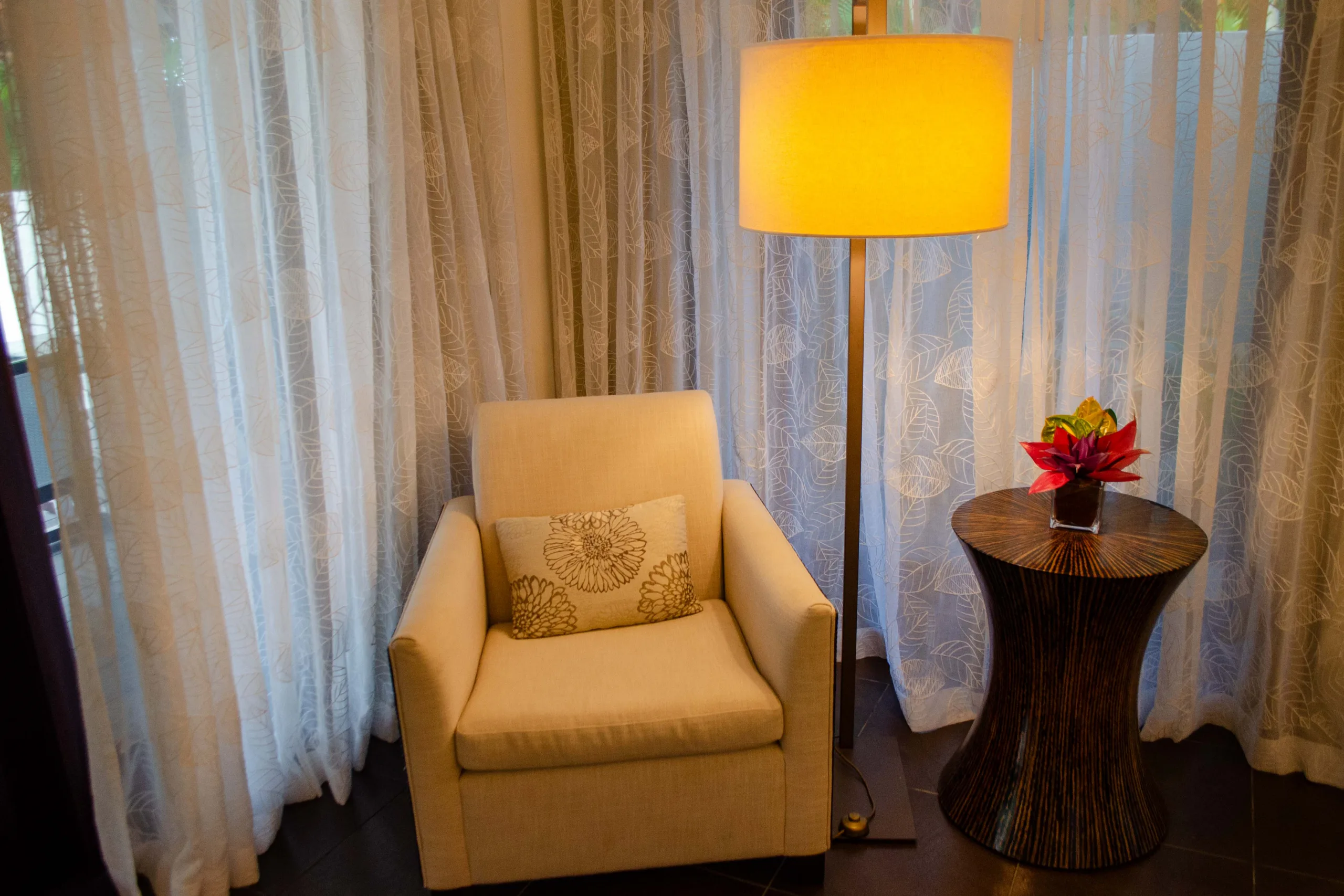 A nearby sitting area features a comfy armchair, a side table with a lamp, and a decorative flower arrangement.