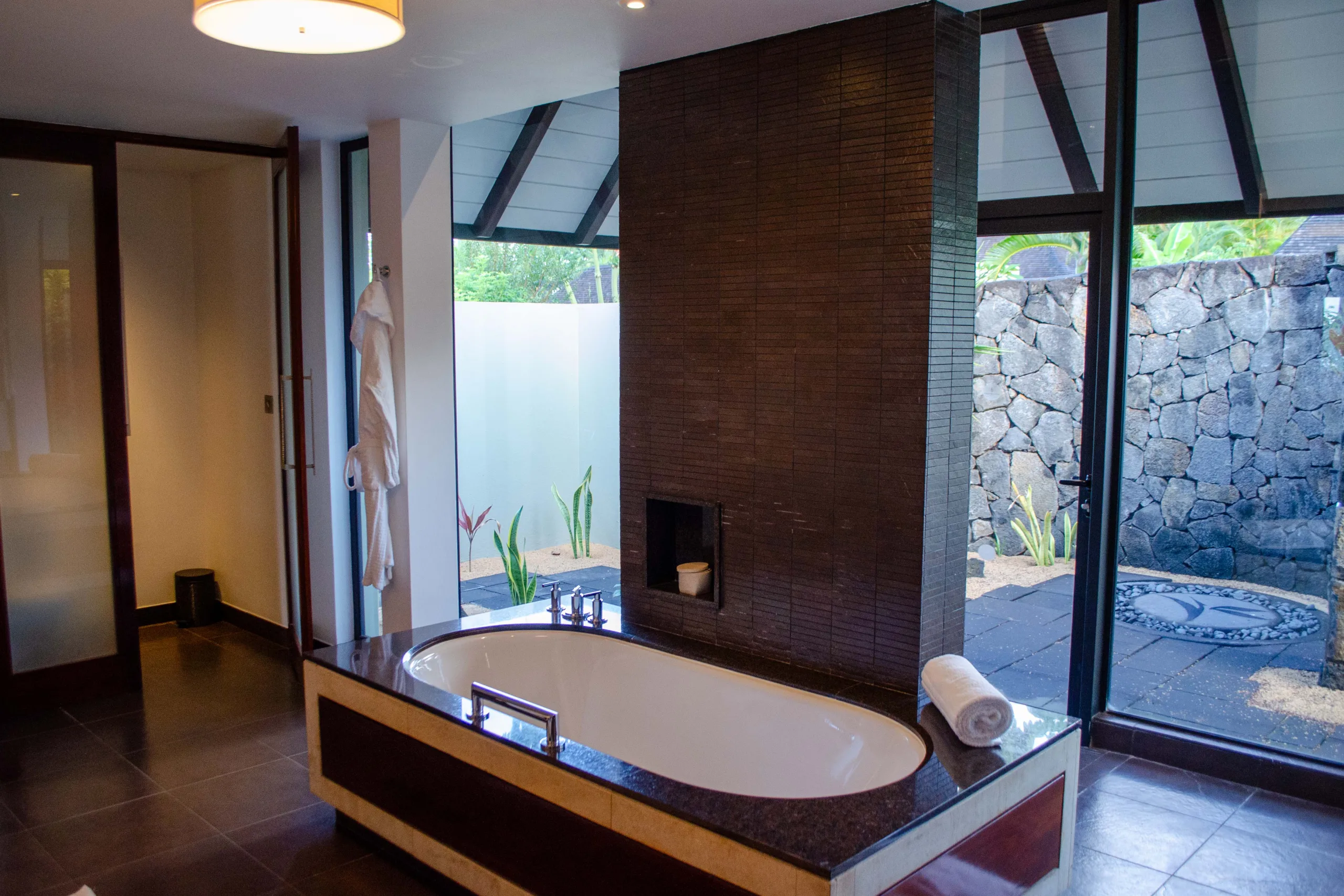 Stepping into the bathroom, you’re greeted by an oversized bathtub against a dark, textured wall, framed by a window overlooking a serene garden.