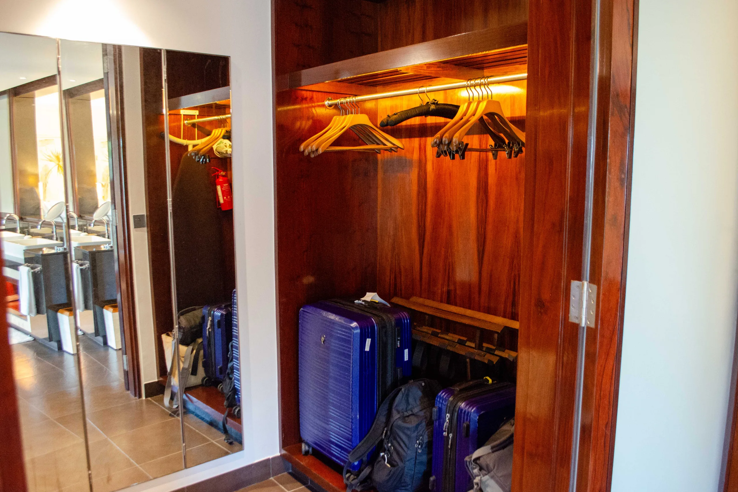A wardrobe includes rich wooden cabinetry, open shelves, and hangers for personal belongings.