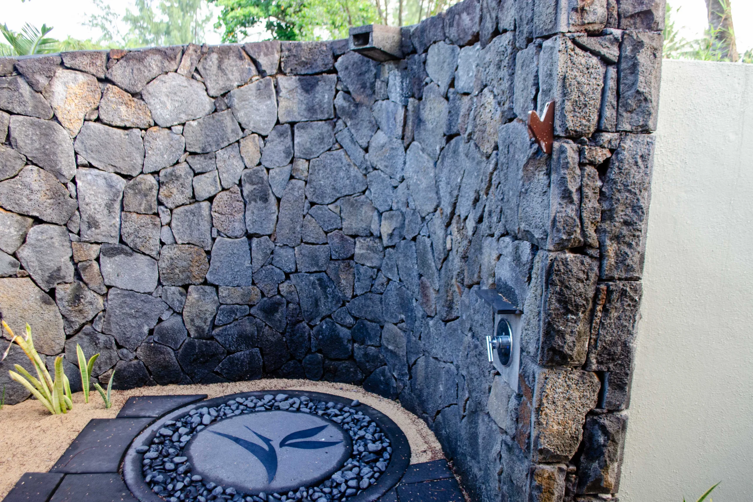 Right beside the shower, there’s a door that leads to a stunning outdoor shower and garden area.