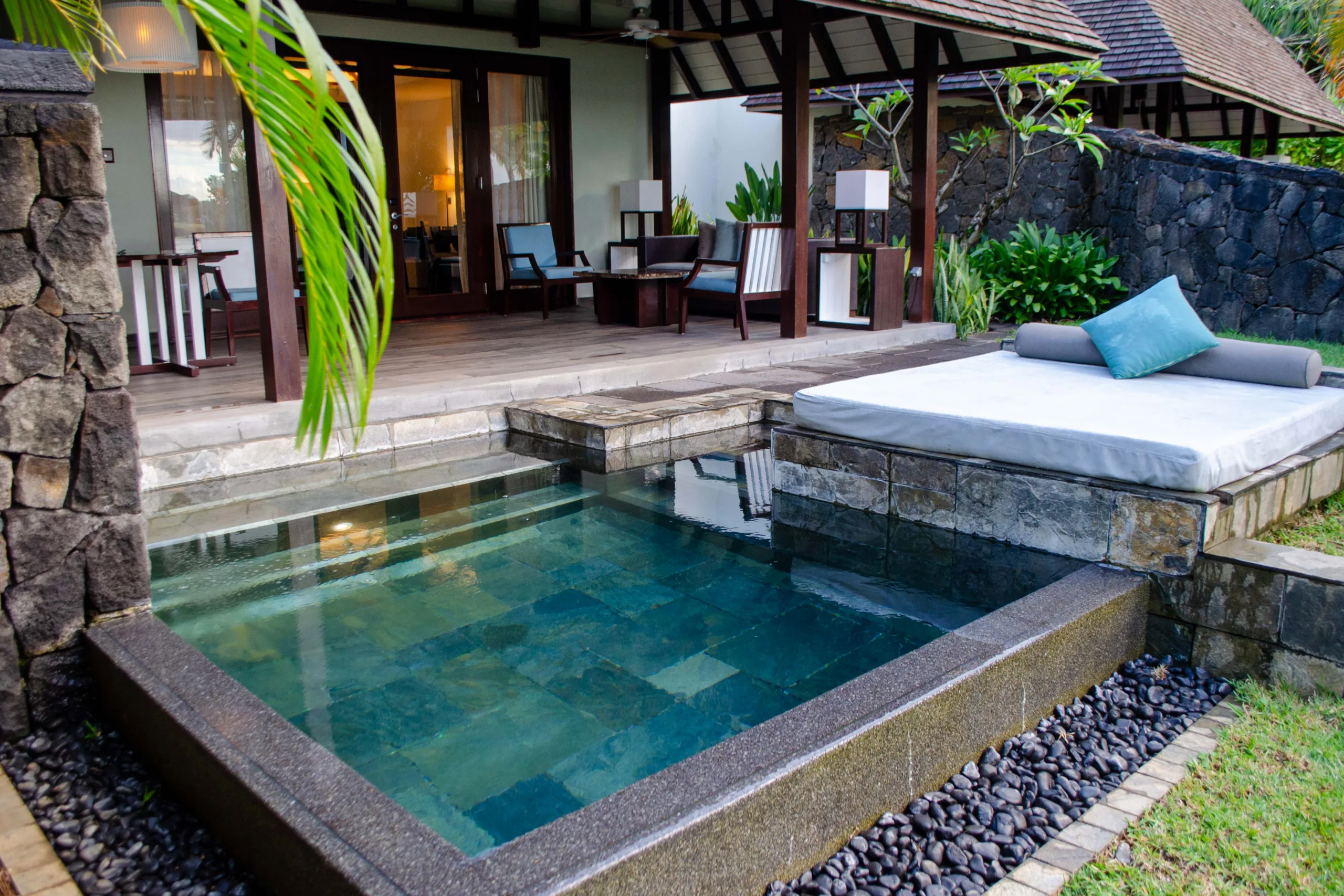 Outside, dark stone tiles and a bed of black pebbles border a rectangular plunge pool.