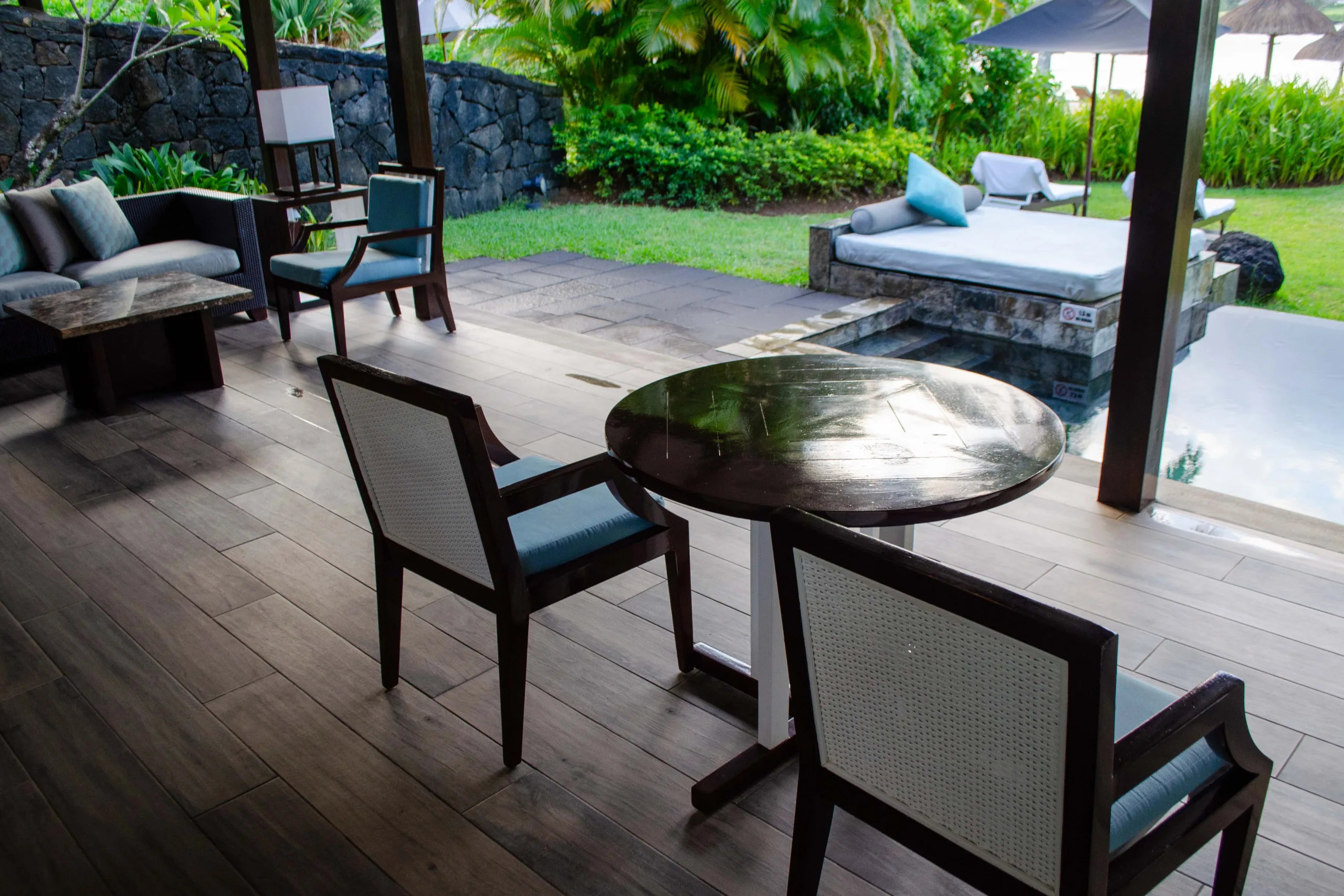 A wooden deck hosts a daybed and a set of armchairs, partially shaded and surrounded by lush vegetation.