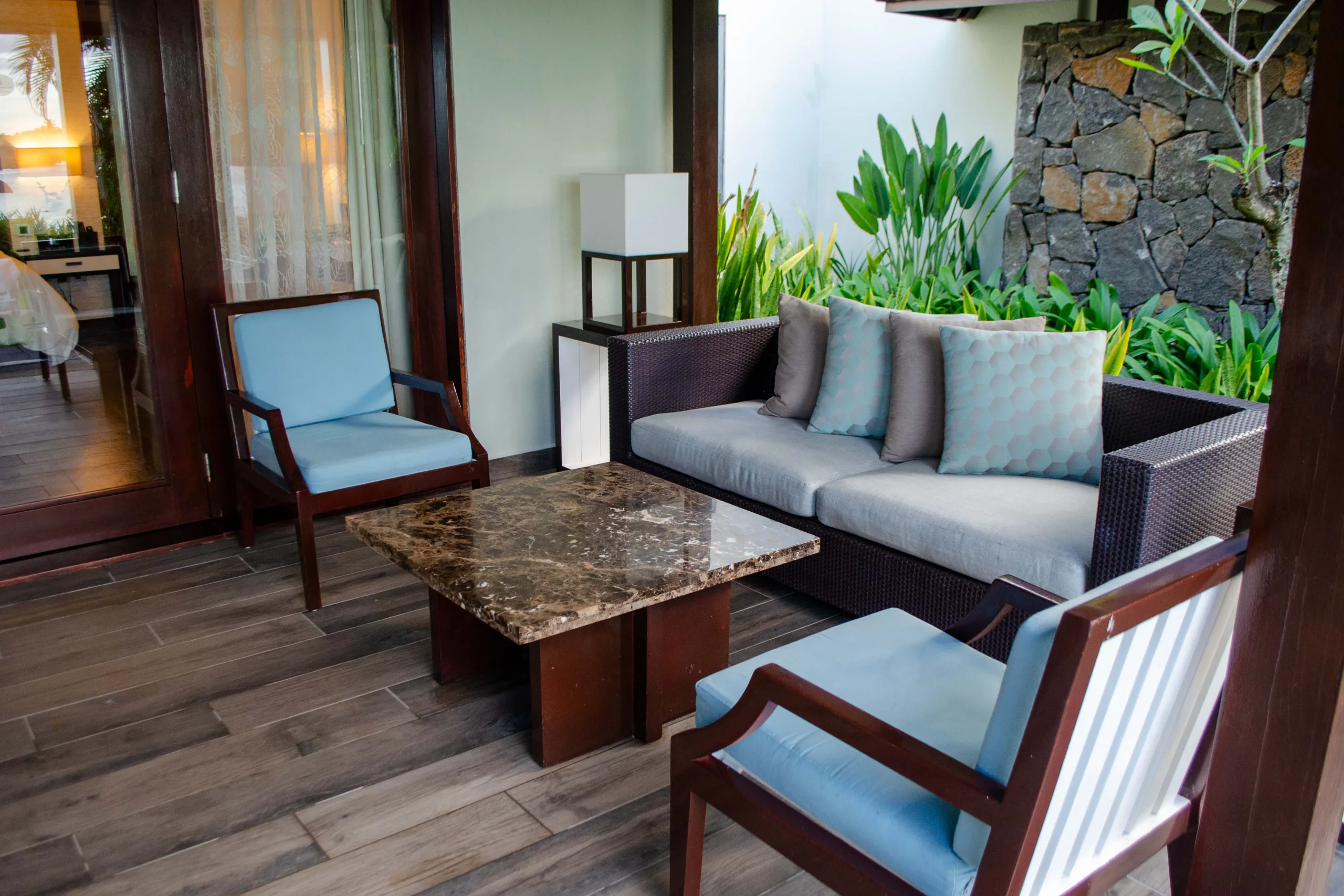 The room’s décor, with its light, flowing curtains and a mix of wood and marble elements, is simply beautiful. The colour scheme is thoughtfully chosen to echo the natural tones visible outside.