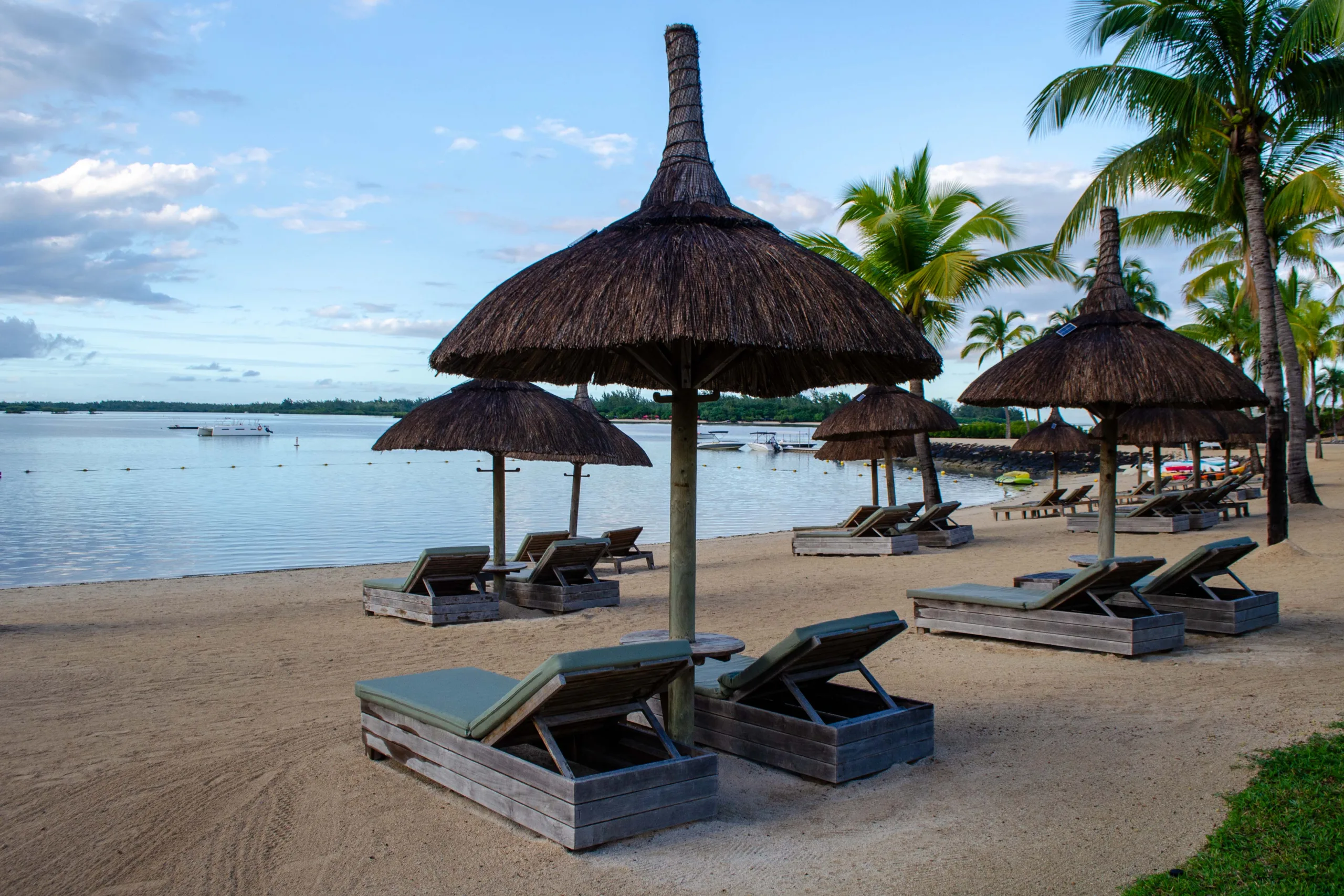 Loungers on a lawn lead to a beach with thatched umbrellas. The convenience of private access to the beach from each villa adds an element of exclusivity.