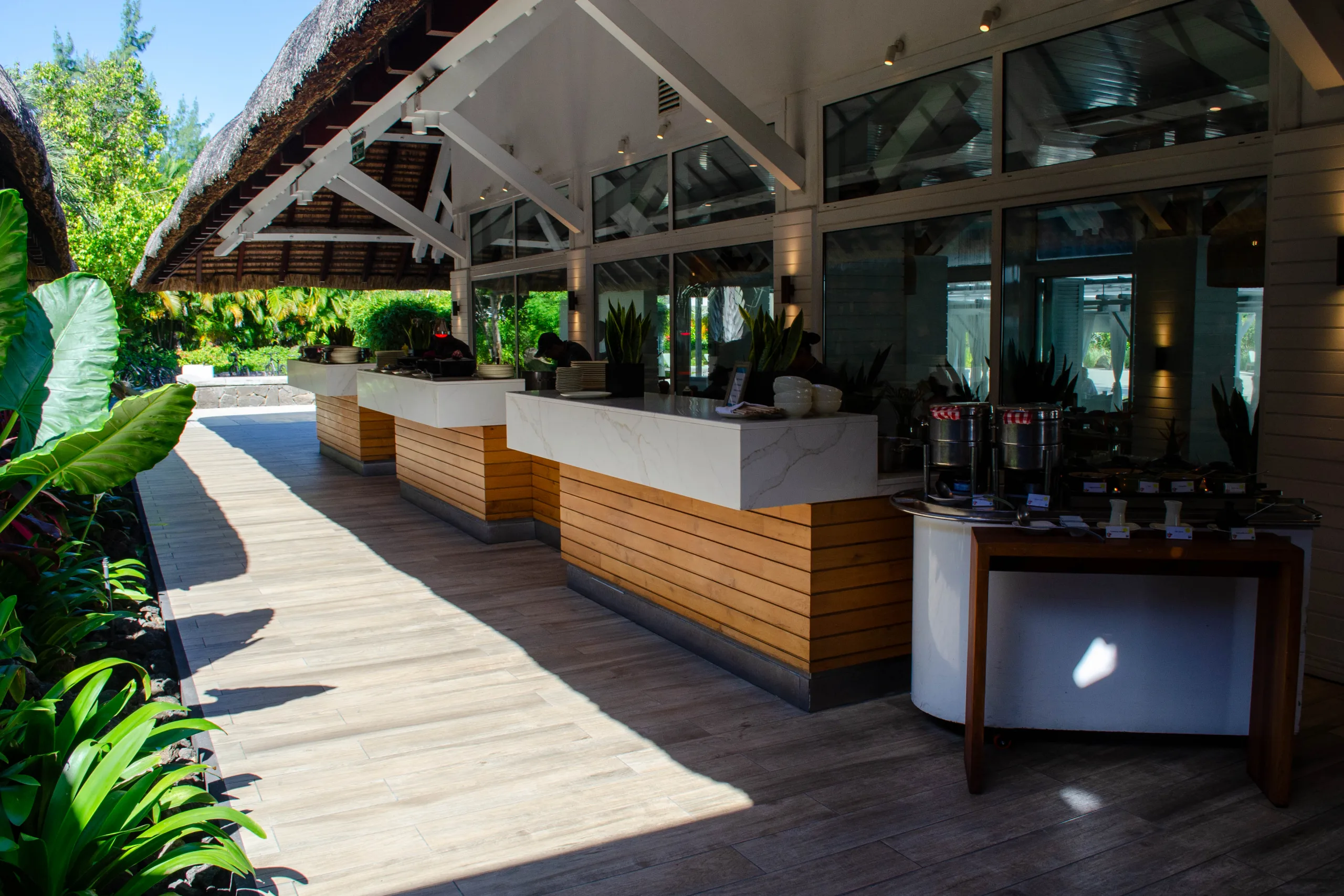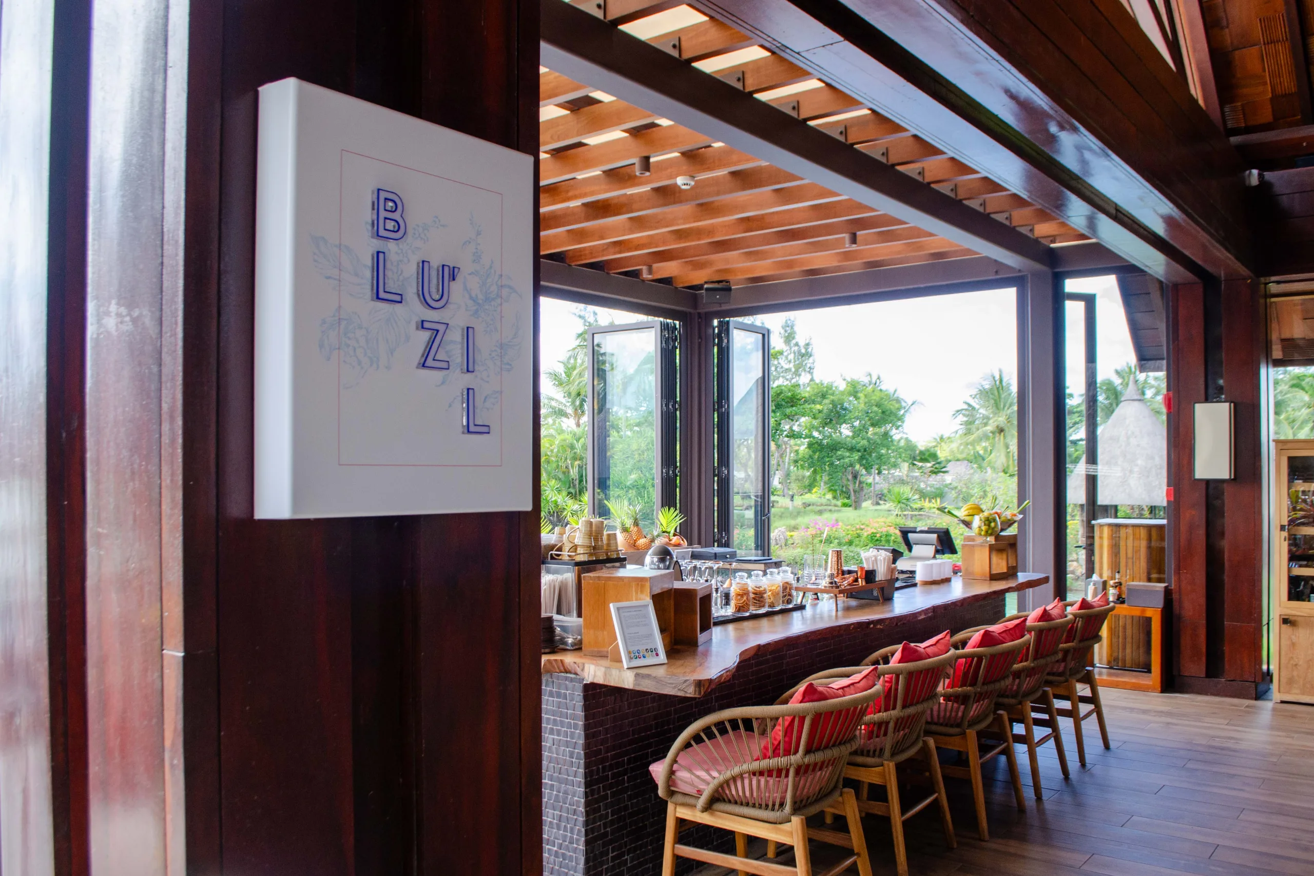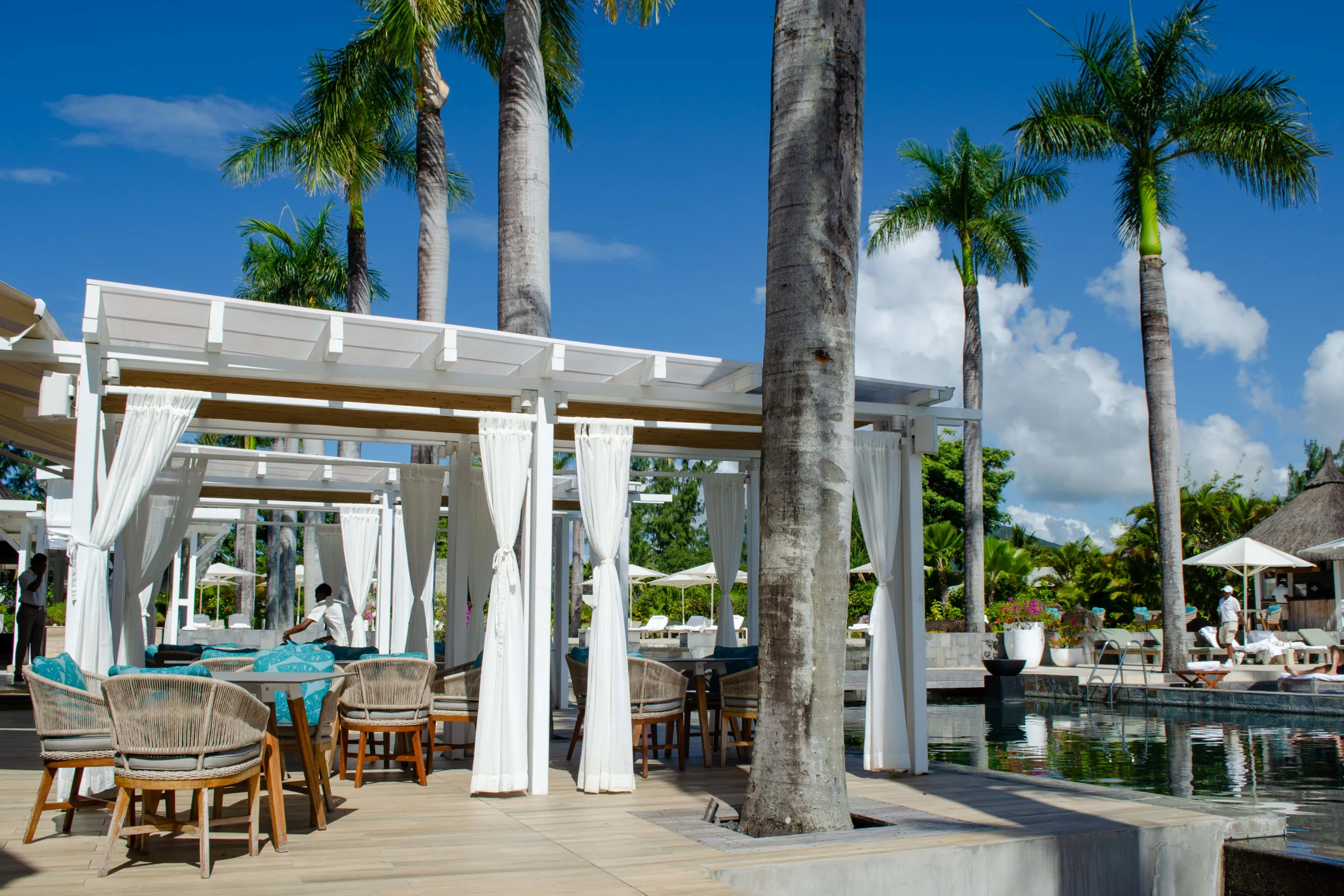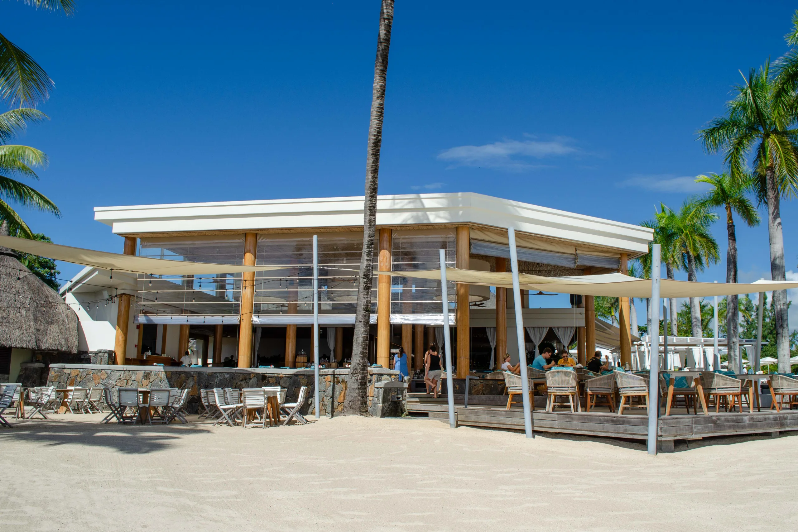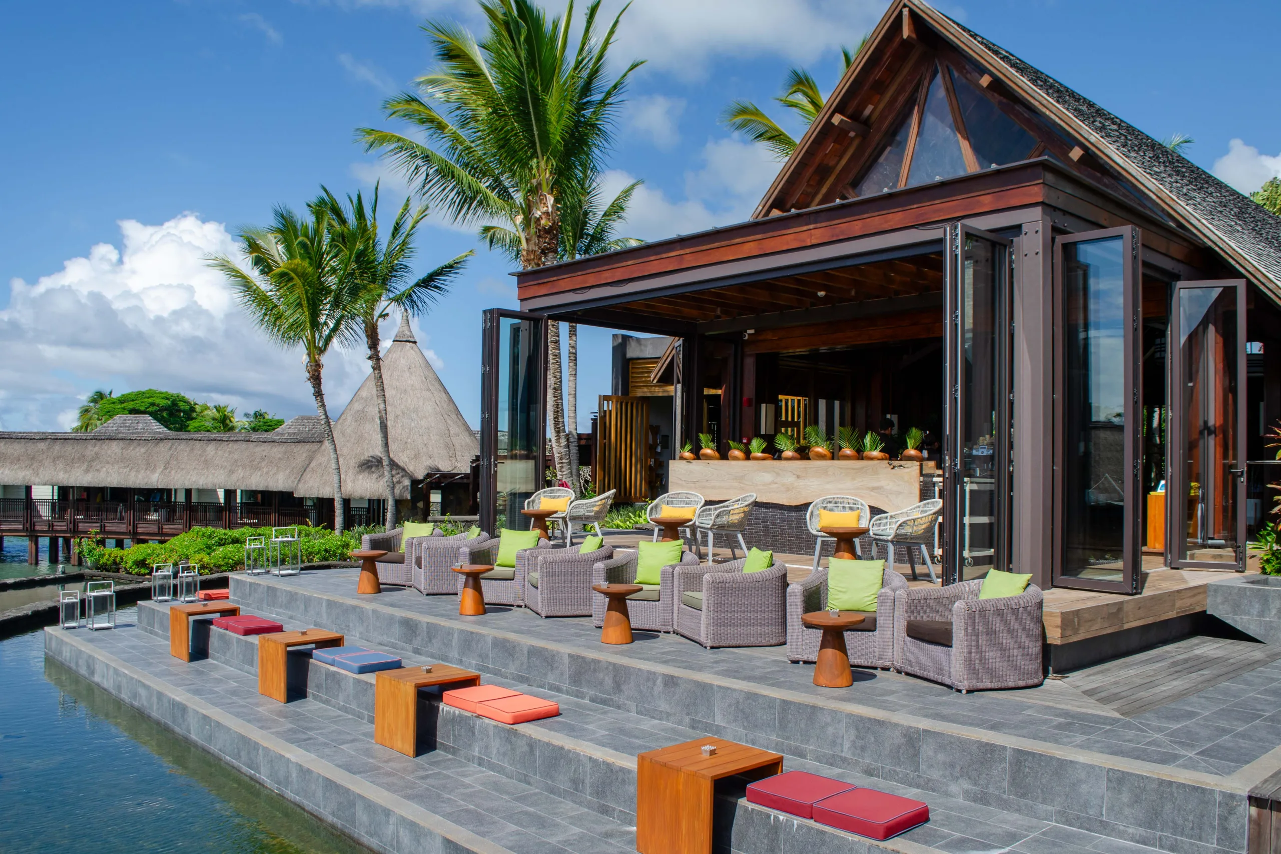 Established in 2008, the resort integrates contemporary Mauritian style with its natural surroundings through open-air architecture.