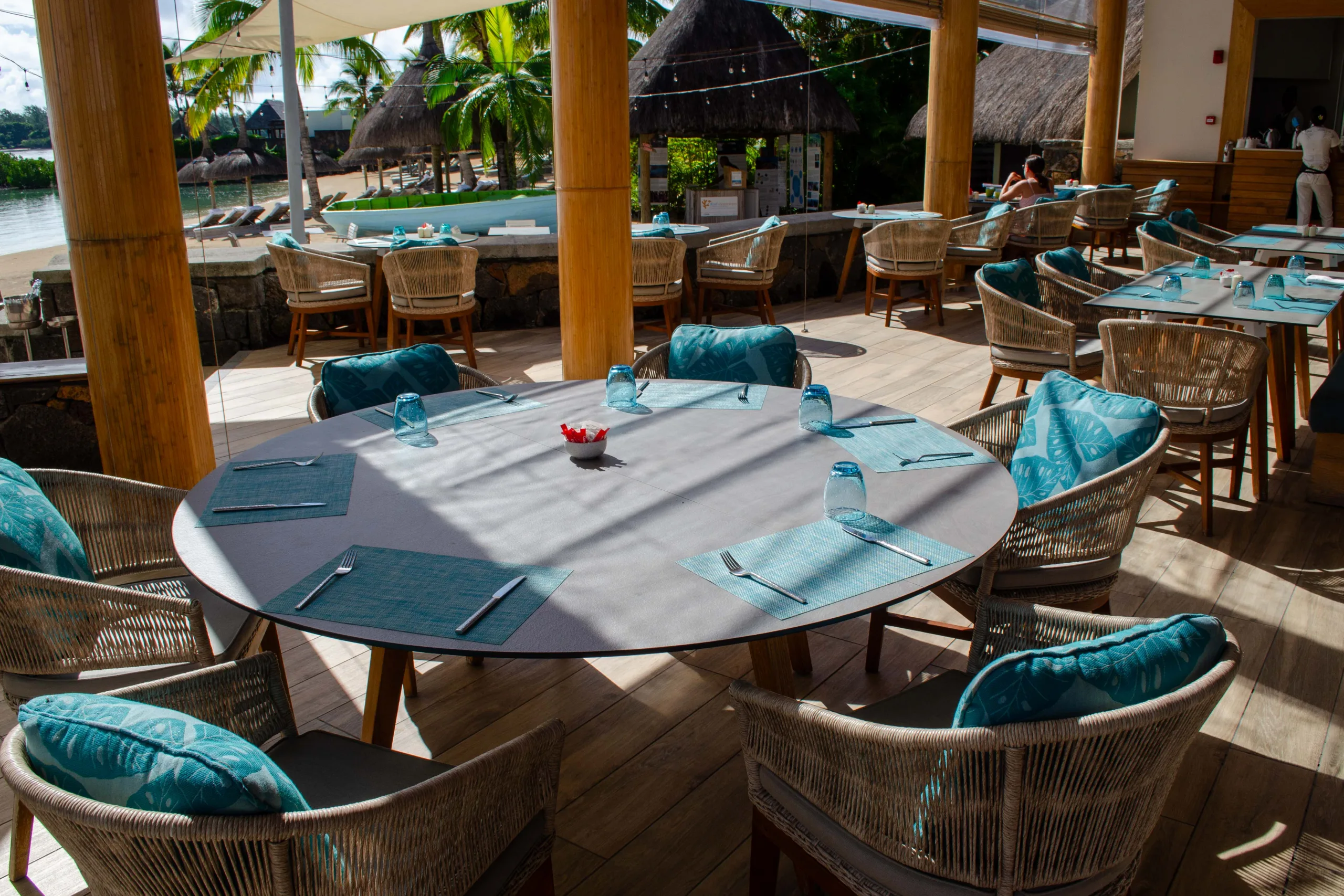 La Plaz Beach Grill is a casual beachfront grill on the exclusive beach at Ile aux Cerfs. It serves fresh seafood and light bites, accessible via a short speedboat ride from the main resort.