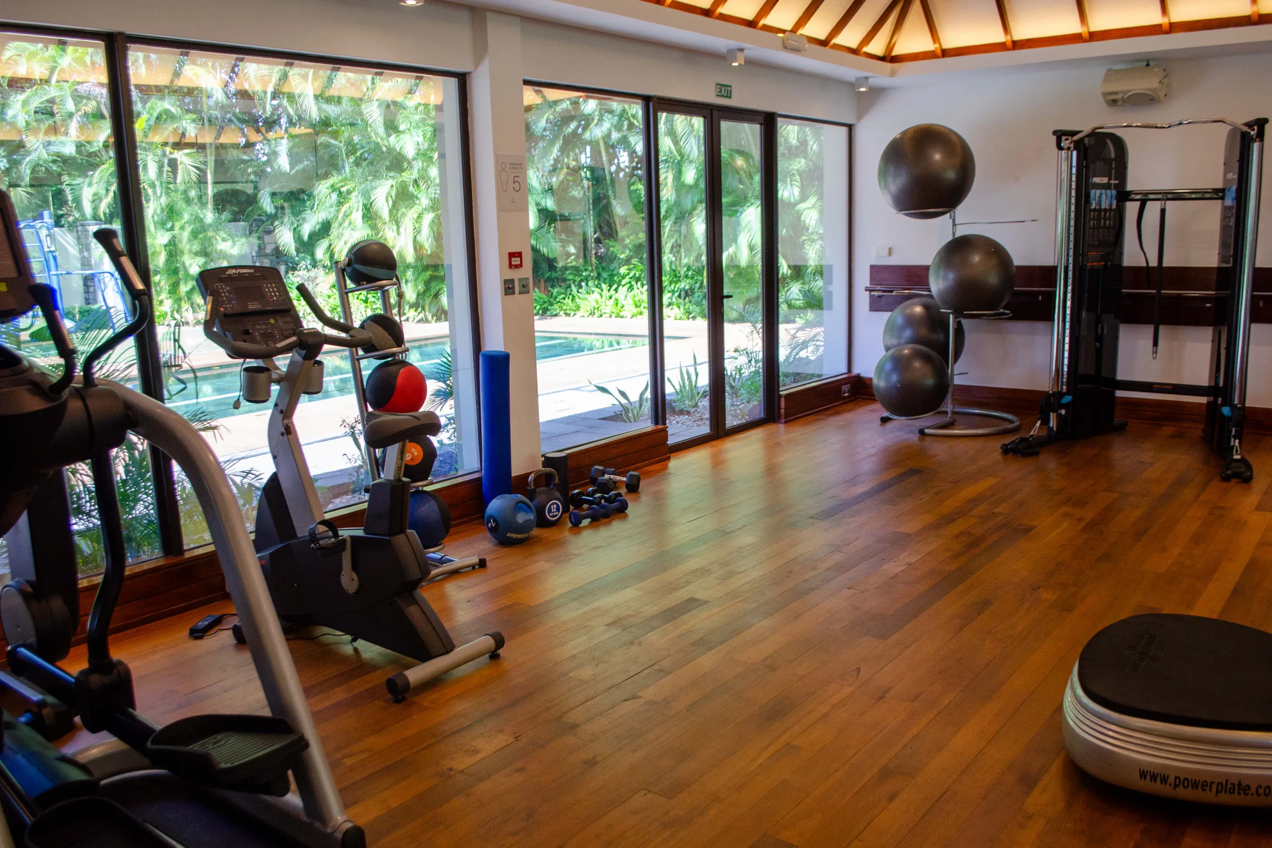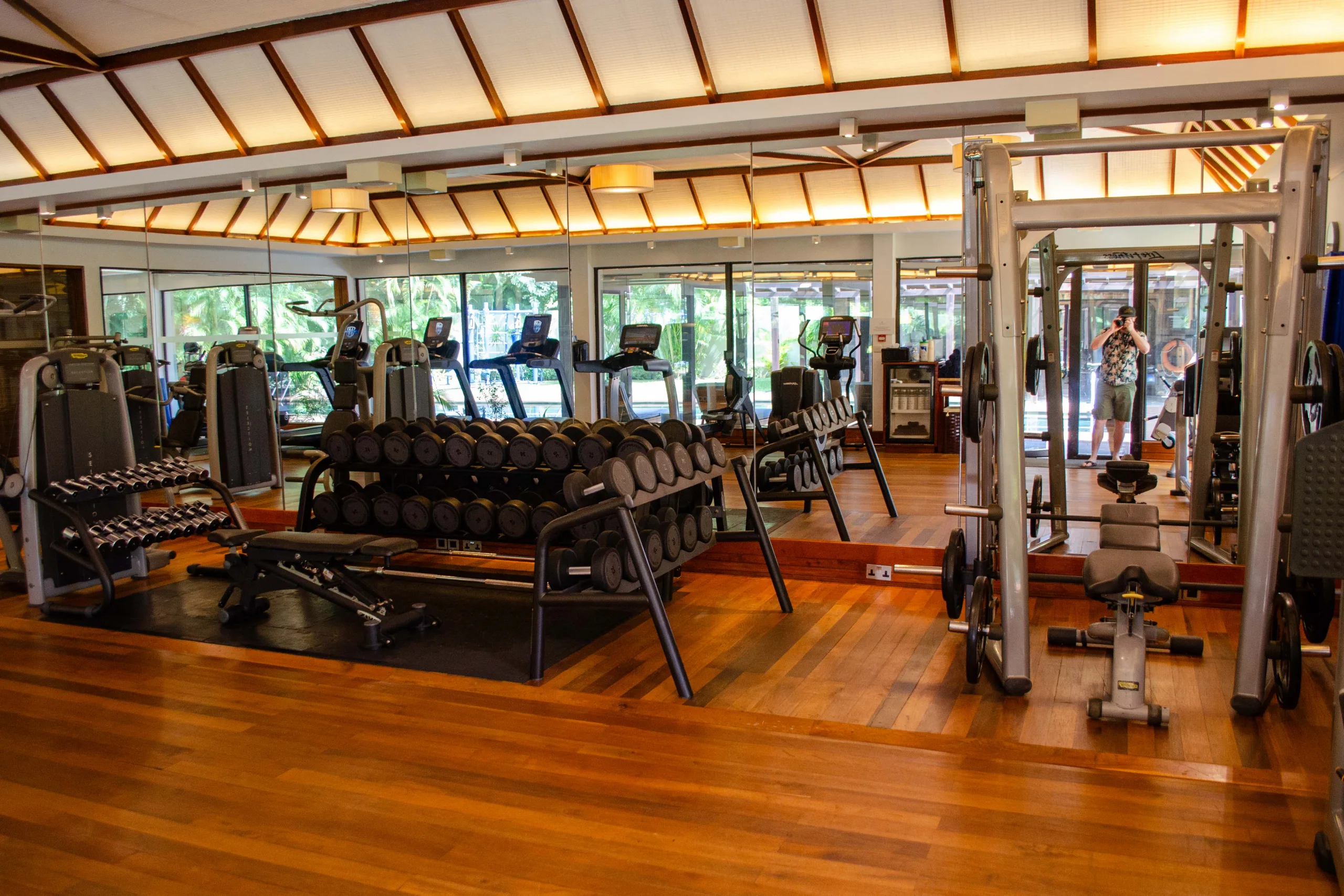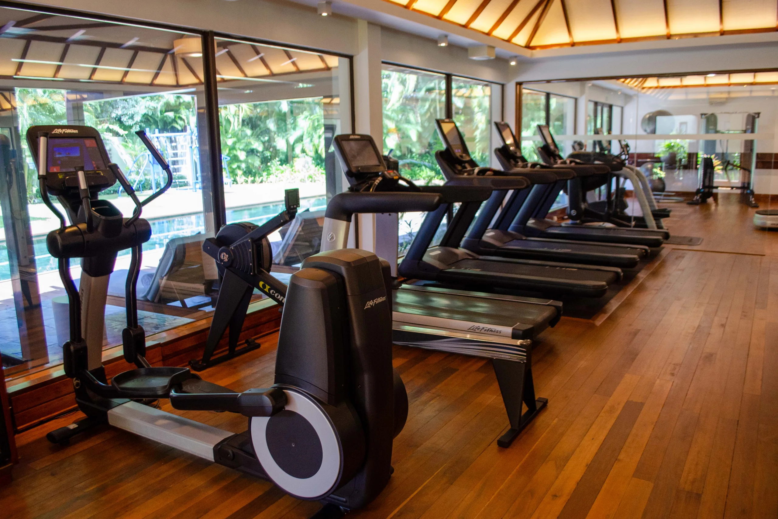 The fitness centre’s overall layout is spacious and well-organized. The wooden flooring adds warmth to the space, while lush greenery is visible through the ample windows.