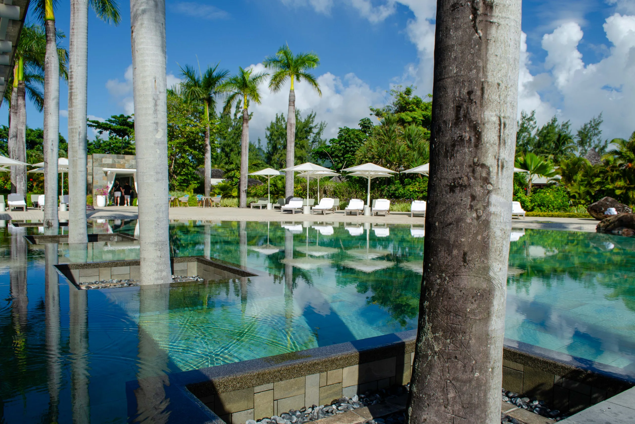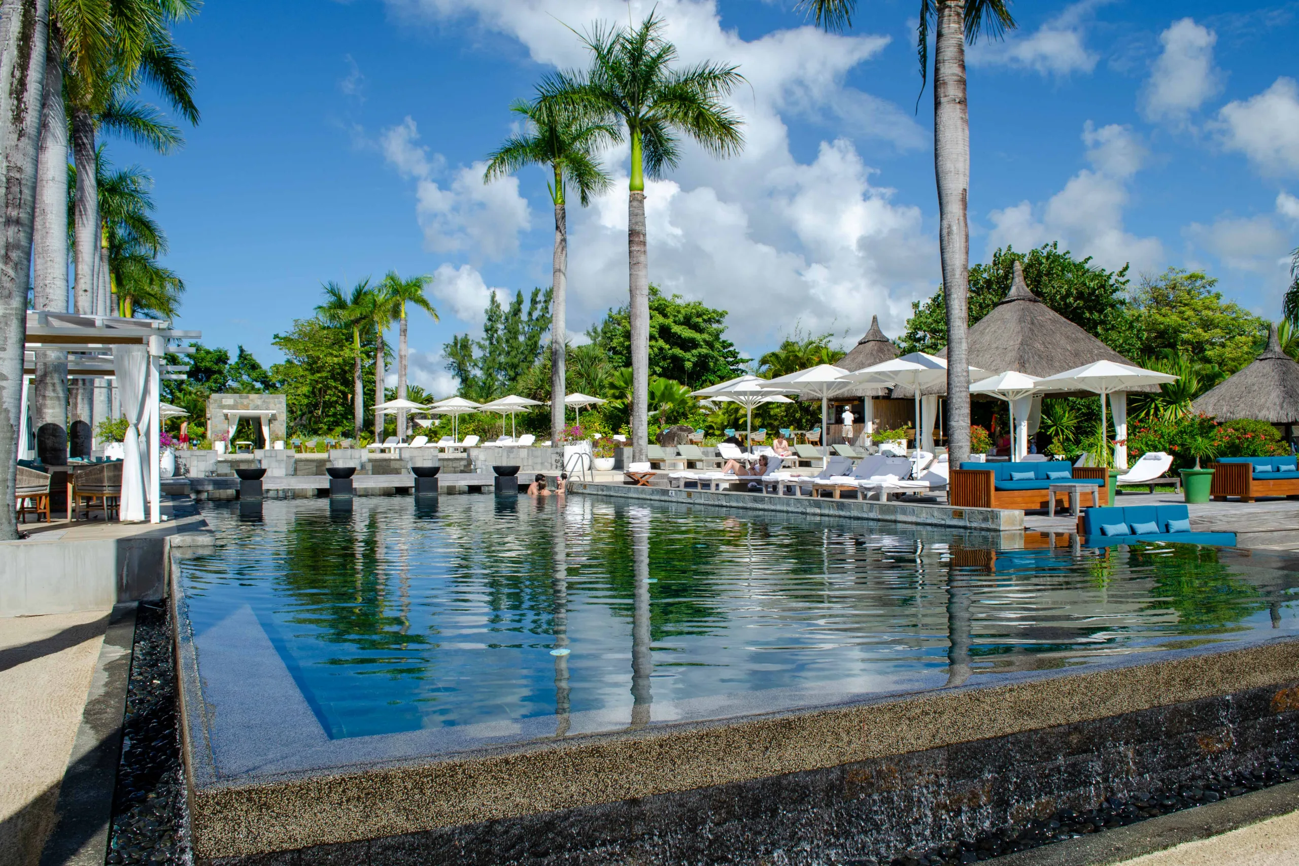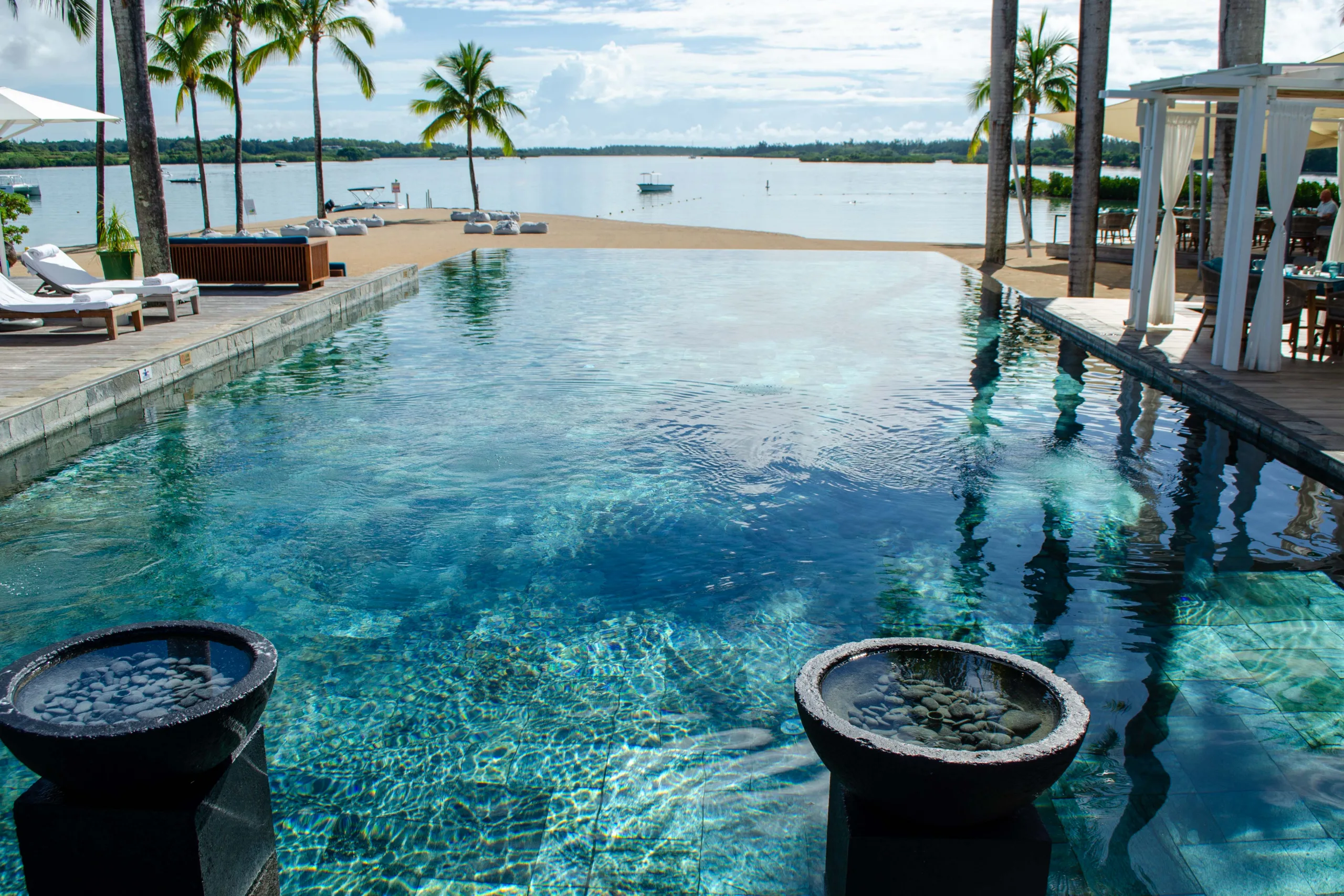 Surrounded by lush palm trees and stylish loungers, this pool area offers stunning views over the main beach, extending towards the Indian Ocean lagoon.