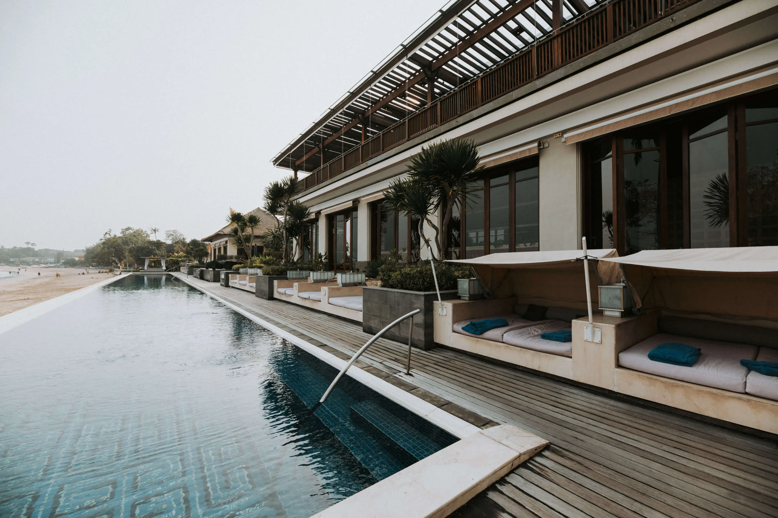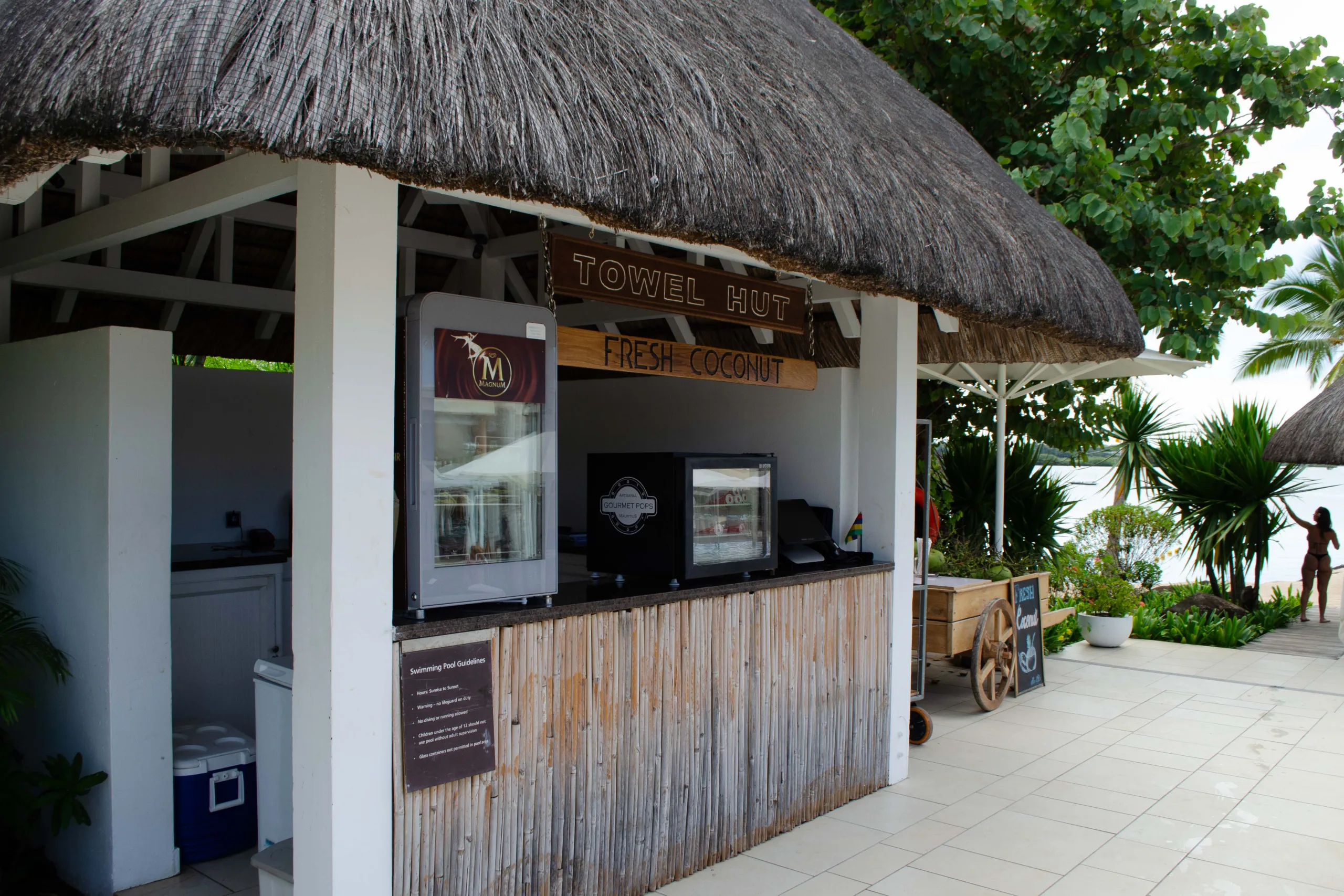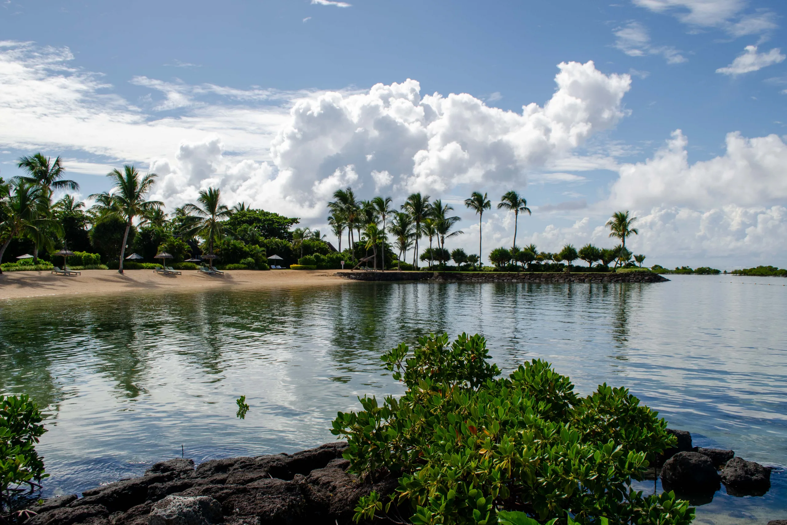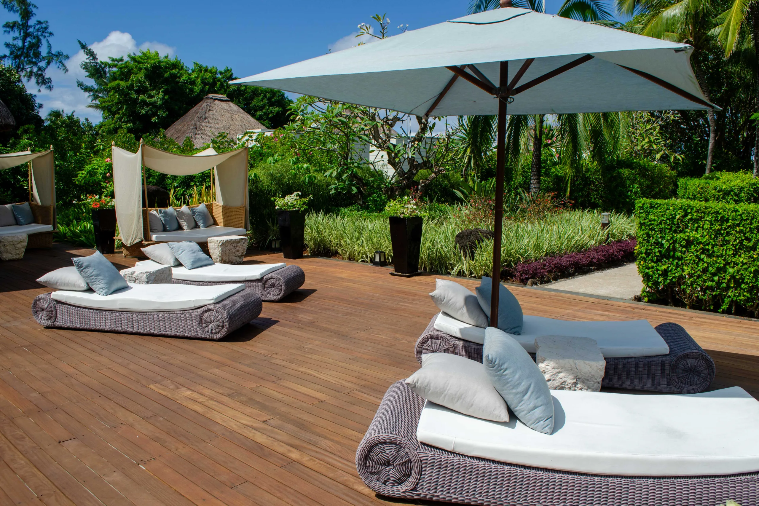 Surrounded by lush palm trees and stylish loungers, this pool area offers stunning views over the main beach, extending towards the Indian Ocean lagoon.