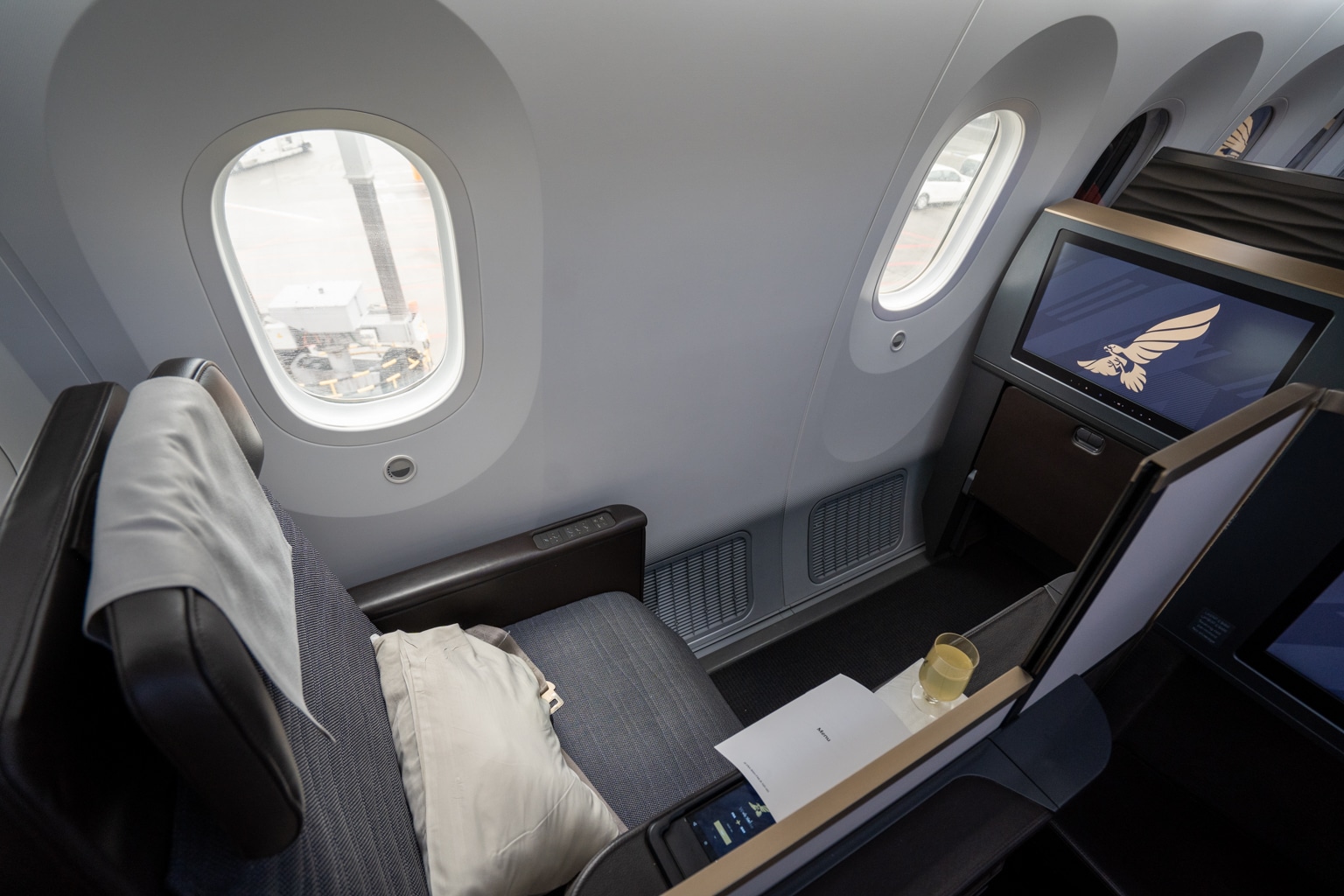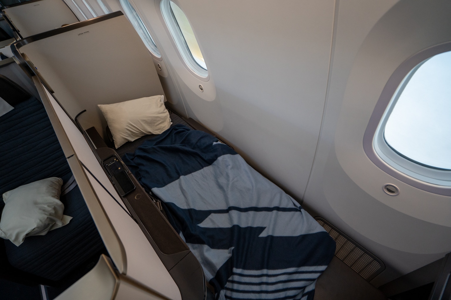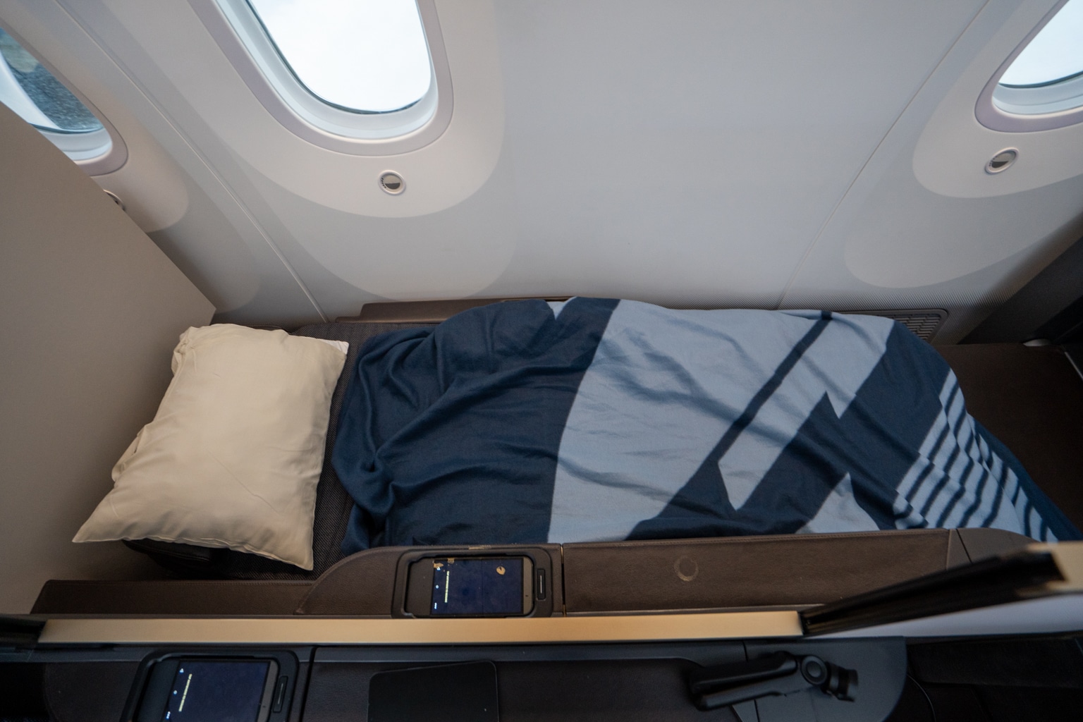 A blanket and pillow were placed at each seat prior to boarding. Every seat was also pre-stocked with the amenity kit, a small bottle of water, and noise-cancelling headphones in the storage nooks.
