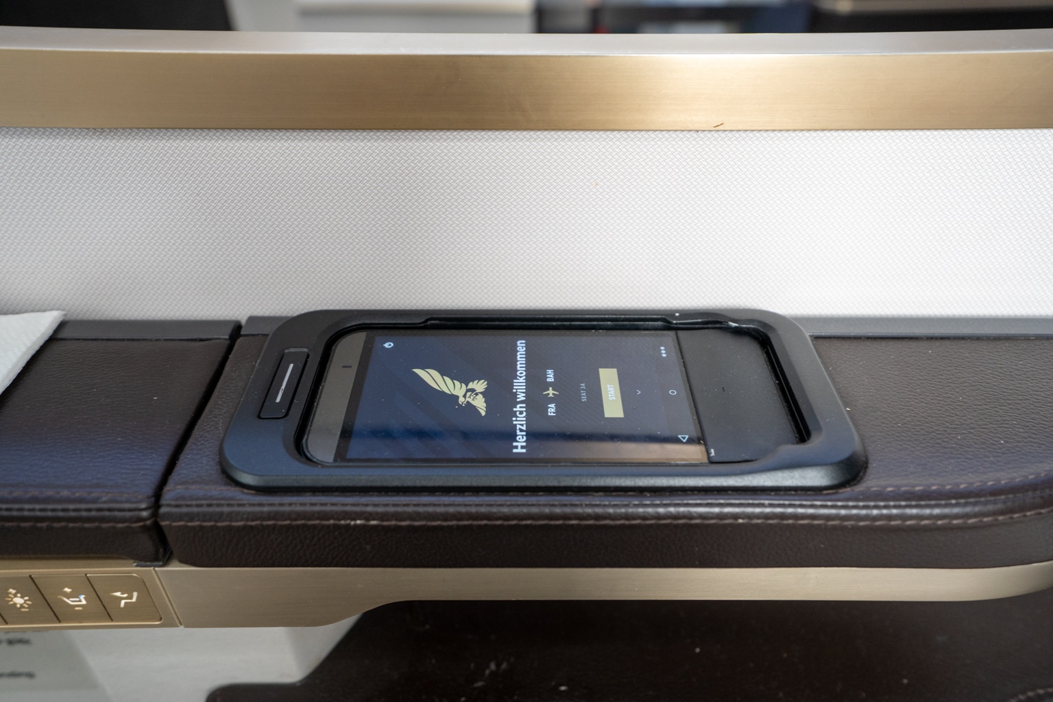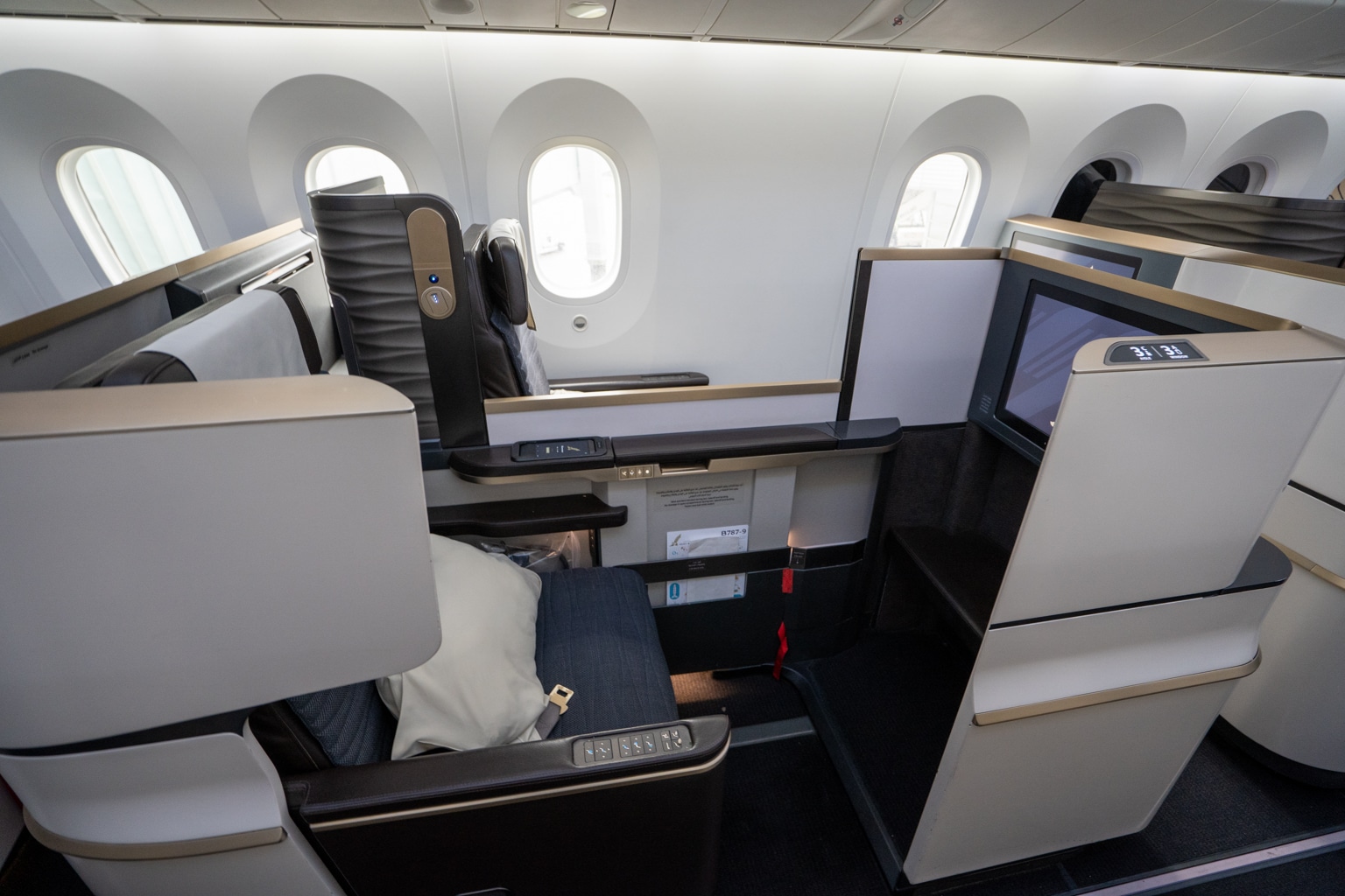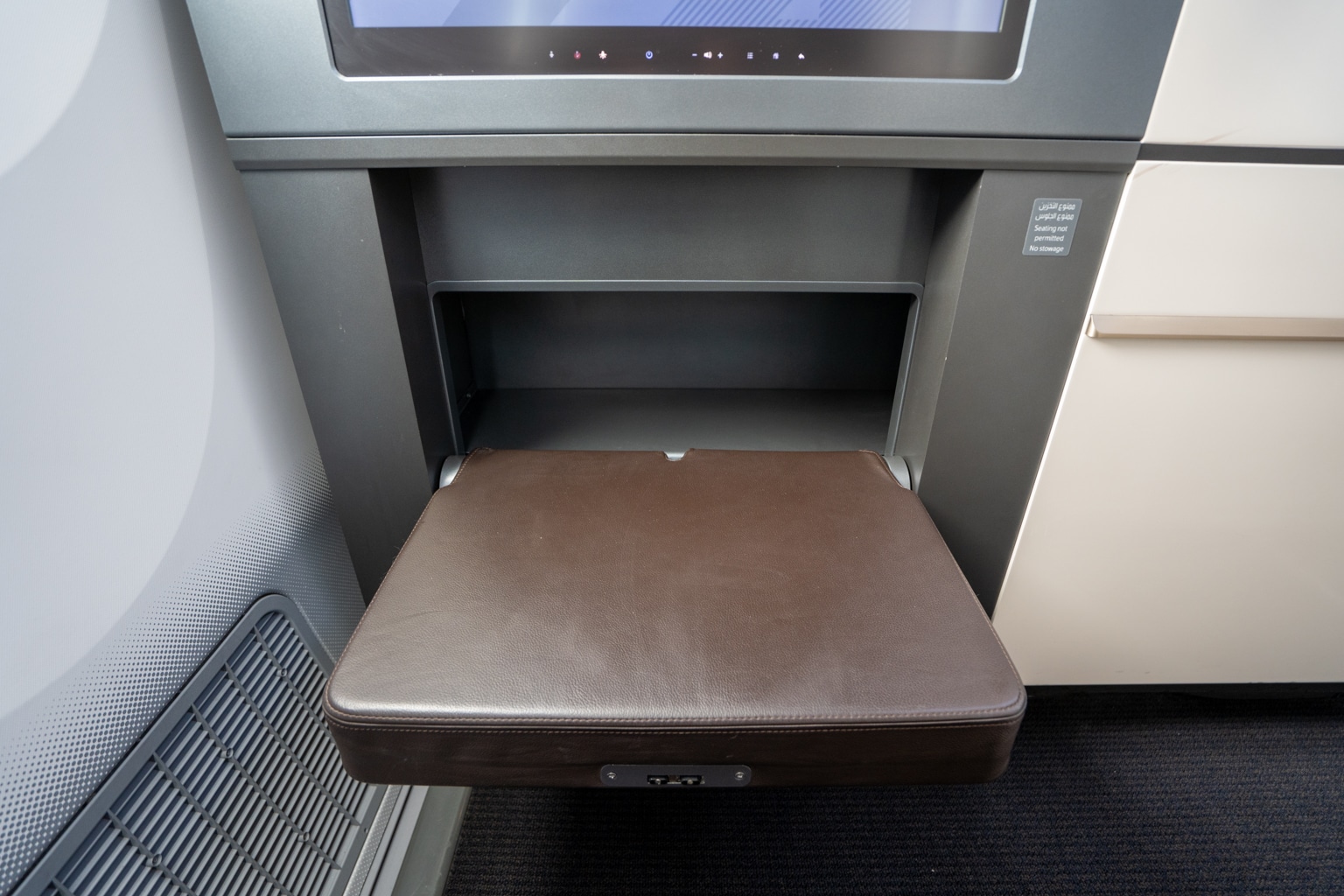 The touch-screen entertainment remote is just above, and can be used to power most of the seat’s electronic features, including the Do Not Disturb indicator on the outer seat shell and the Boeing 787’s window shades.