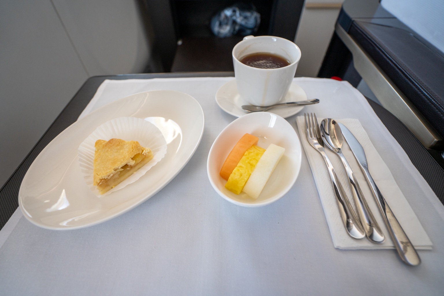 The meal service concluded with a rather average slice of cake, a fruit dish, and some black tea.