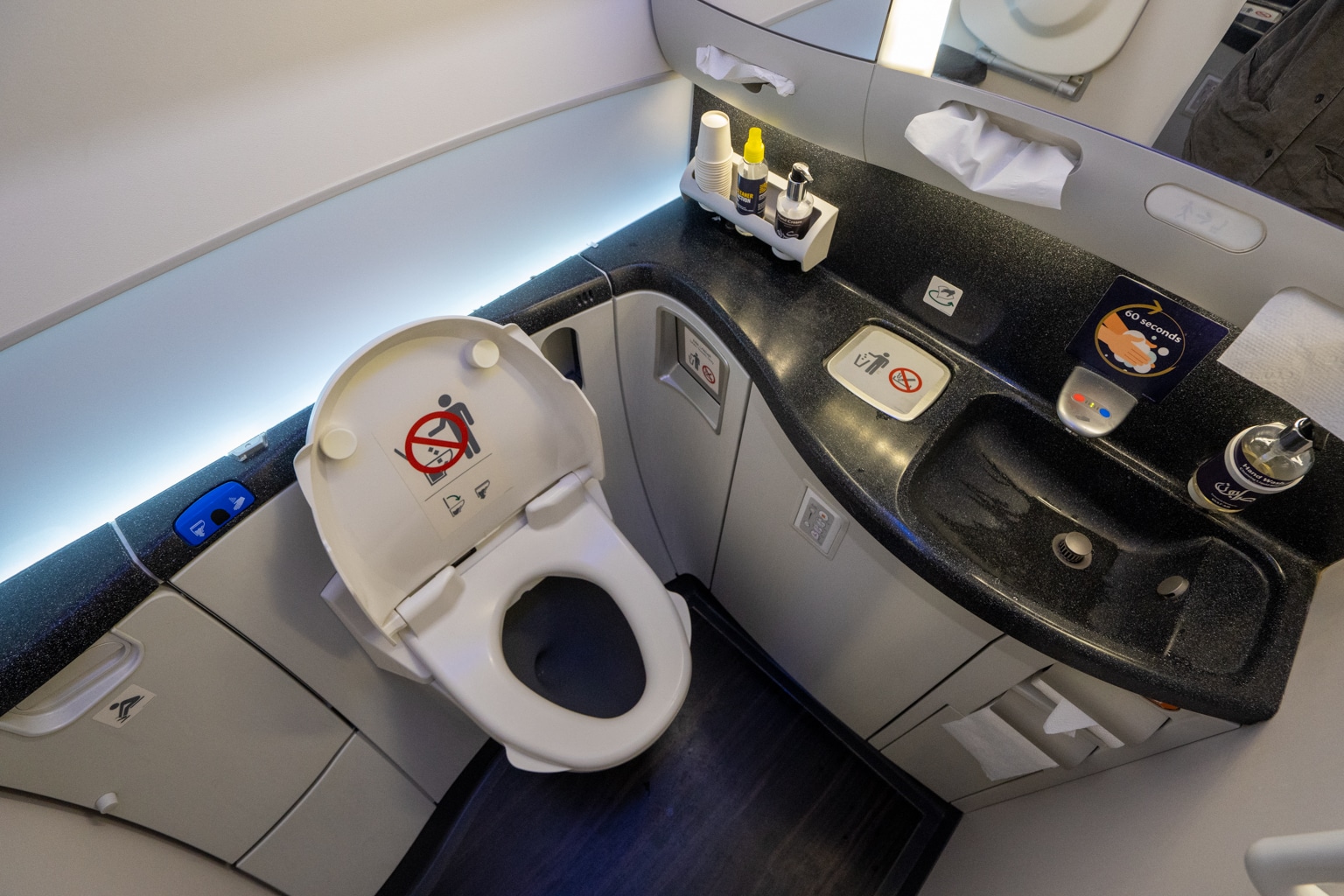 The business class restroom was a fairly standard size for a Boeing 787 Dreamliner, with a couple of amenities and a baby changing table.