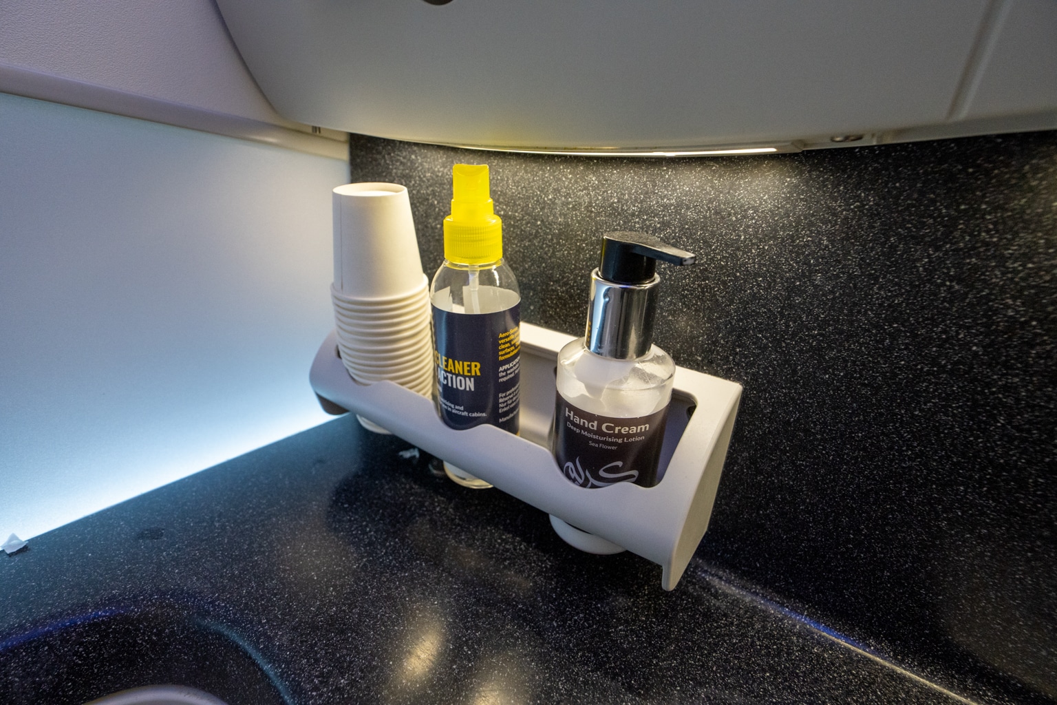 These restrooms are designed to be touchless, aside from the water temperature control, amenities, and paper cups. Additionally, Gulf Air’s onboard restrooms come with a bidet feature, in line with Islamic hygiene principles.