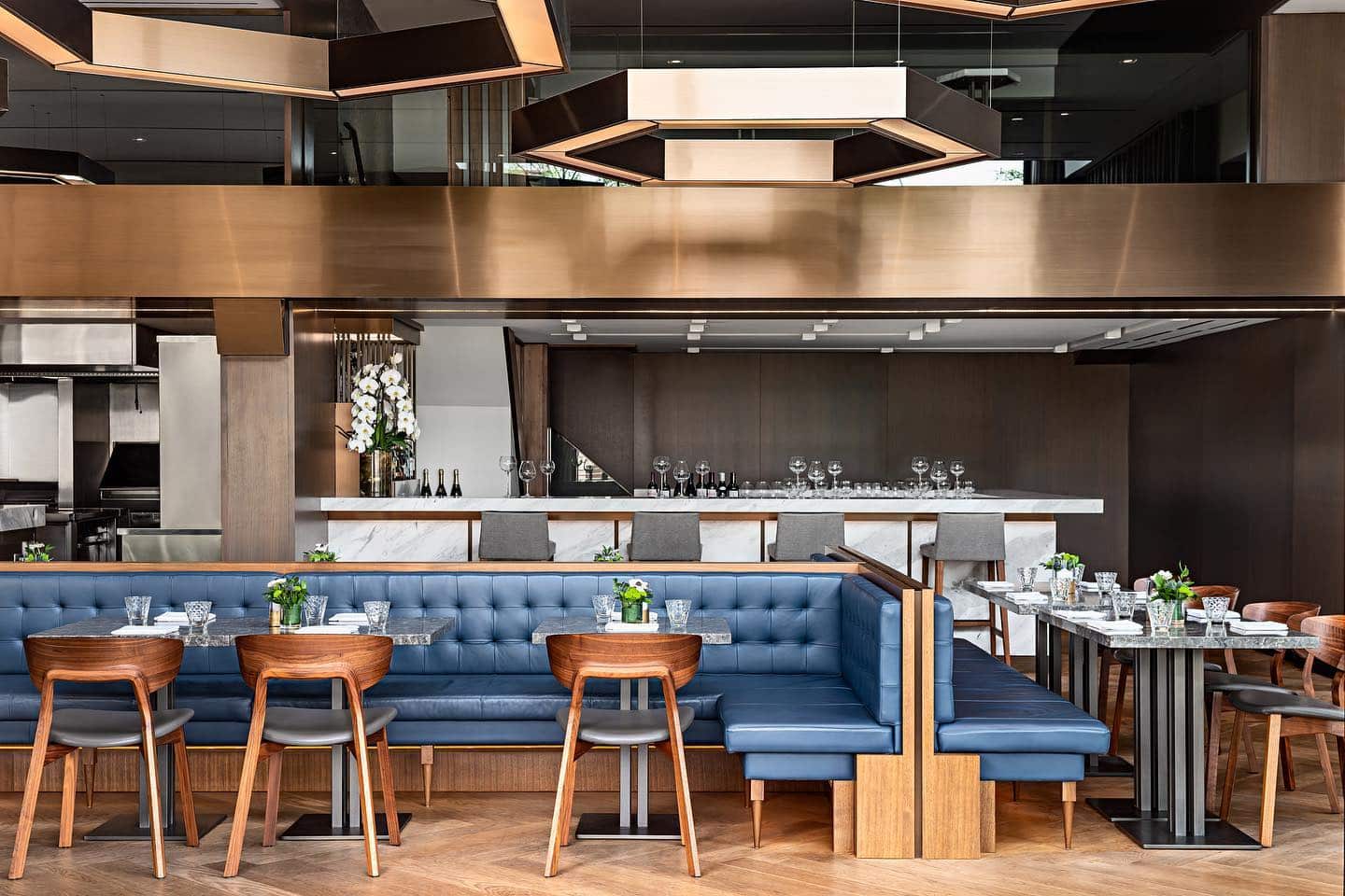 Walking through the restaurant, you pass by modern granite tables, with crafty dark wooden chairs and benches adorned with royal blue leather.