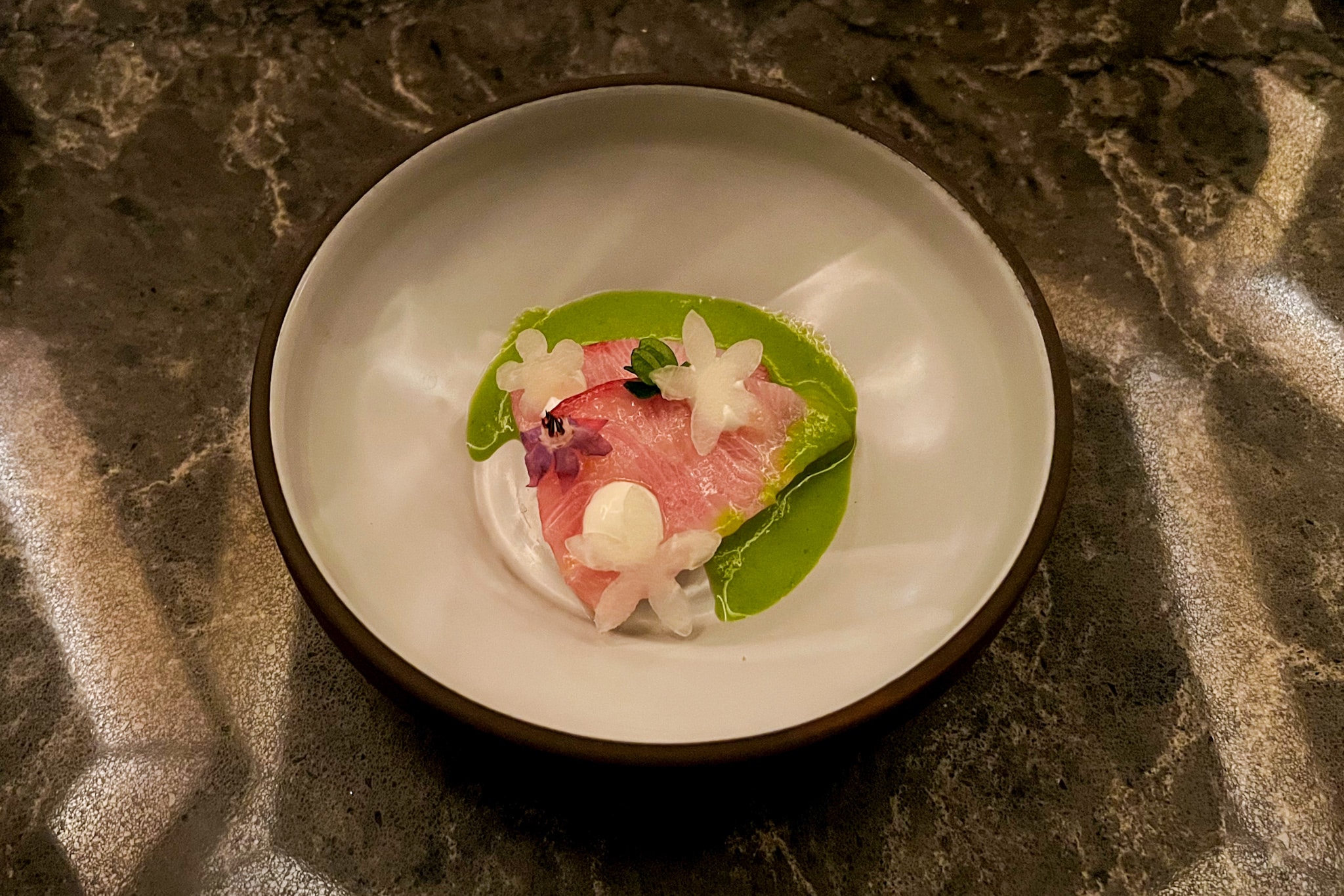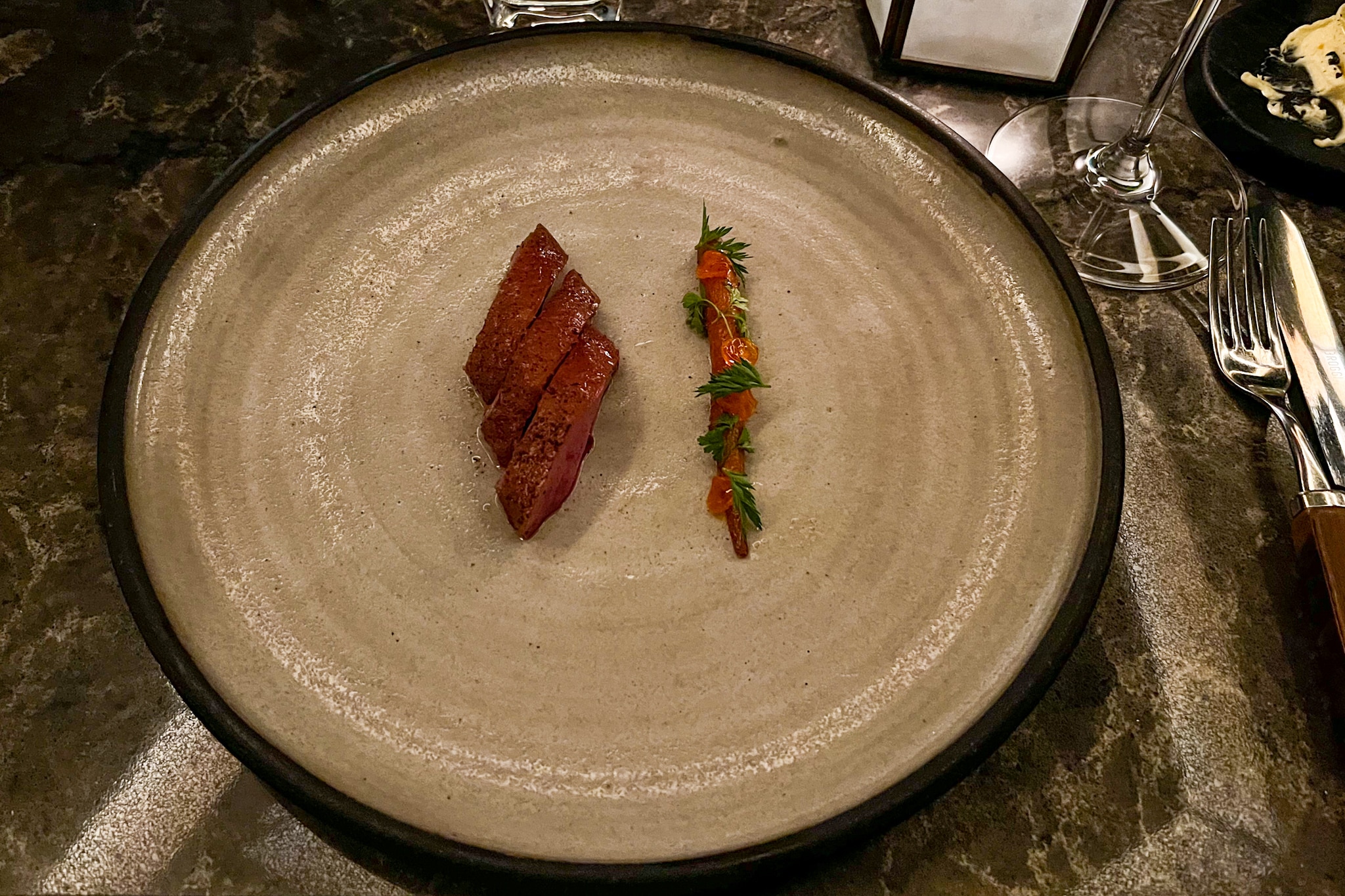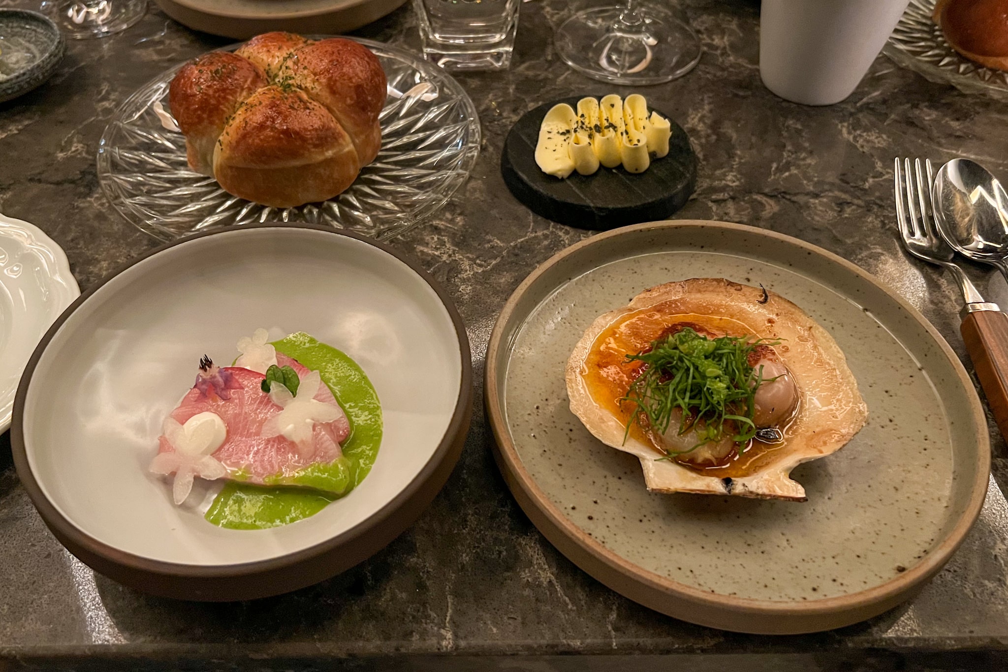 Once seated at the table, our server for the evening introduced themselves, took our water orders, and quickly confirmed that we were booked in for the tasting menu. The server also took the time to understand the dietary notes on our reservation.