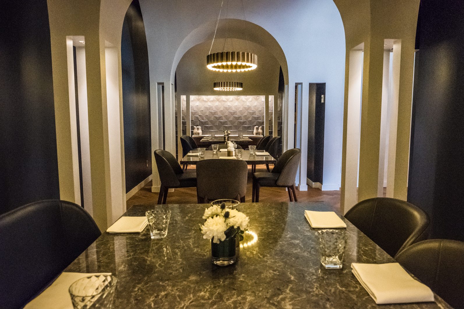 Moving further in you find a floating bio-fuel fireplace and an open concept kitchen, giving views to the team of chefs gracefully preparing the dishes for the evening.