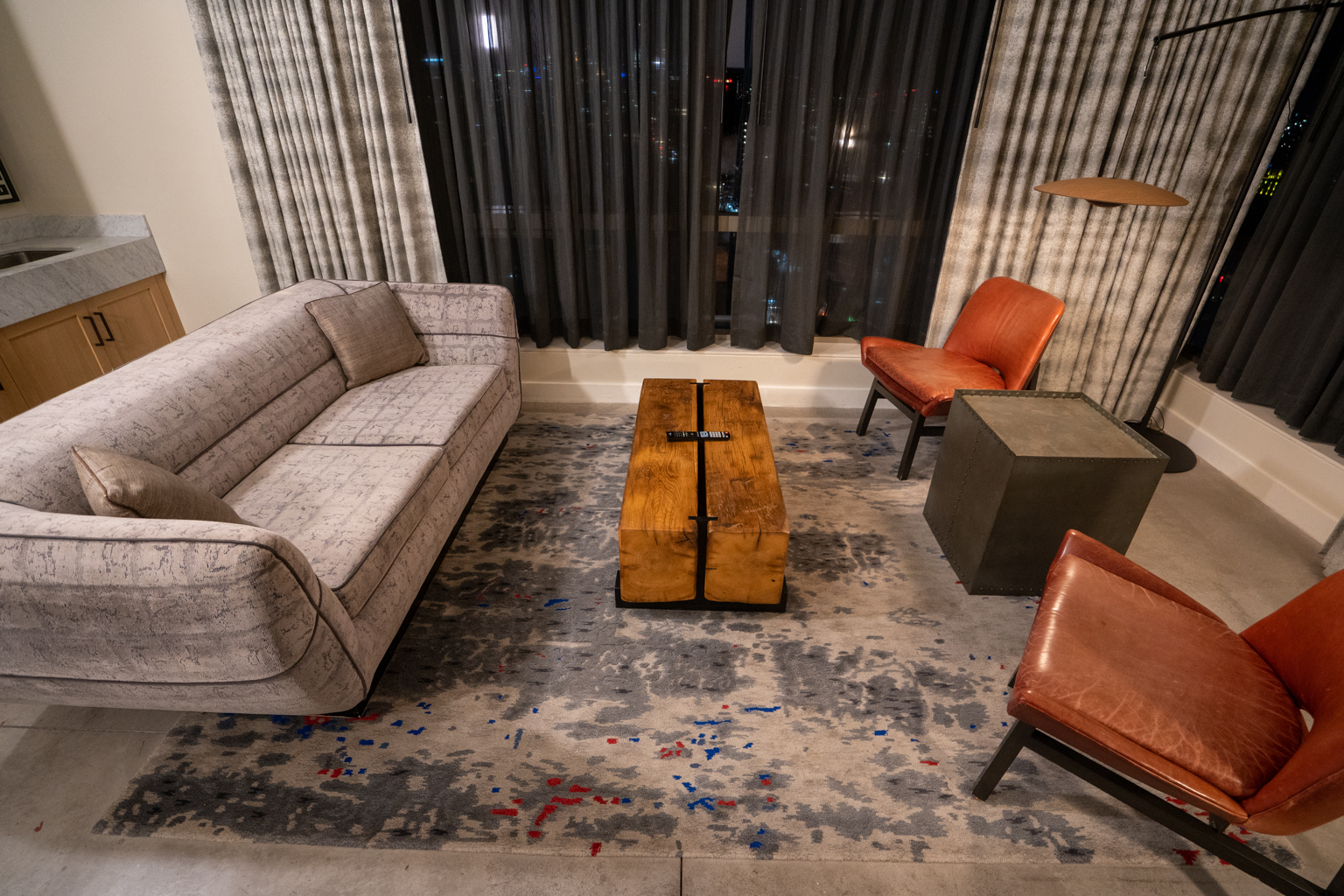 The living space includes a wide plush sofa facing two leather slipper chairs and a work desk against the wall. The room features hues of grey, orange, and subtle blues.
