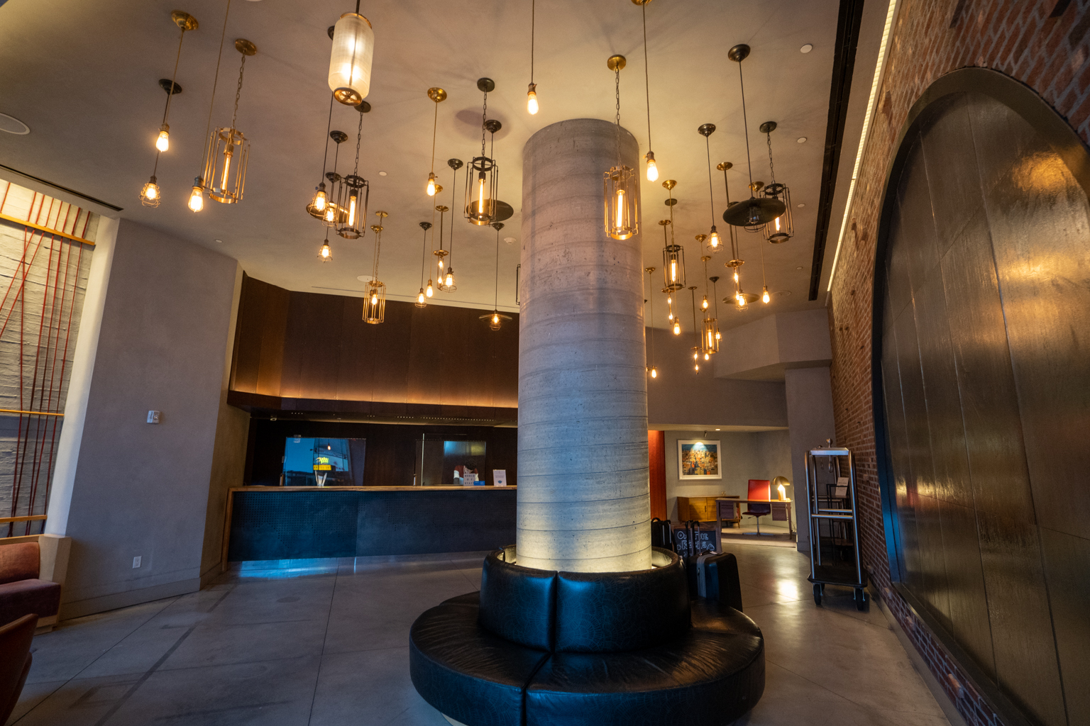 The lobby featured an array of modern light fixtures that hung from the ceiling and plenty of seating for incoming guests. A brick accent wall pays tribute to the city, while fine details within the artwork incorporate elements of Chinatown.