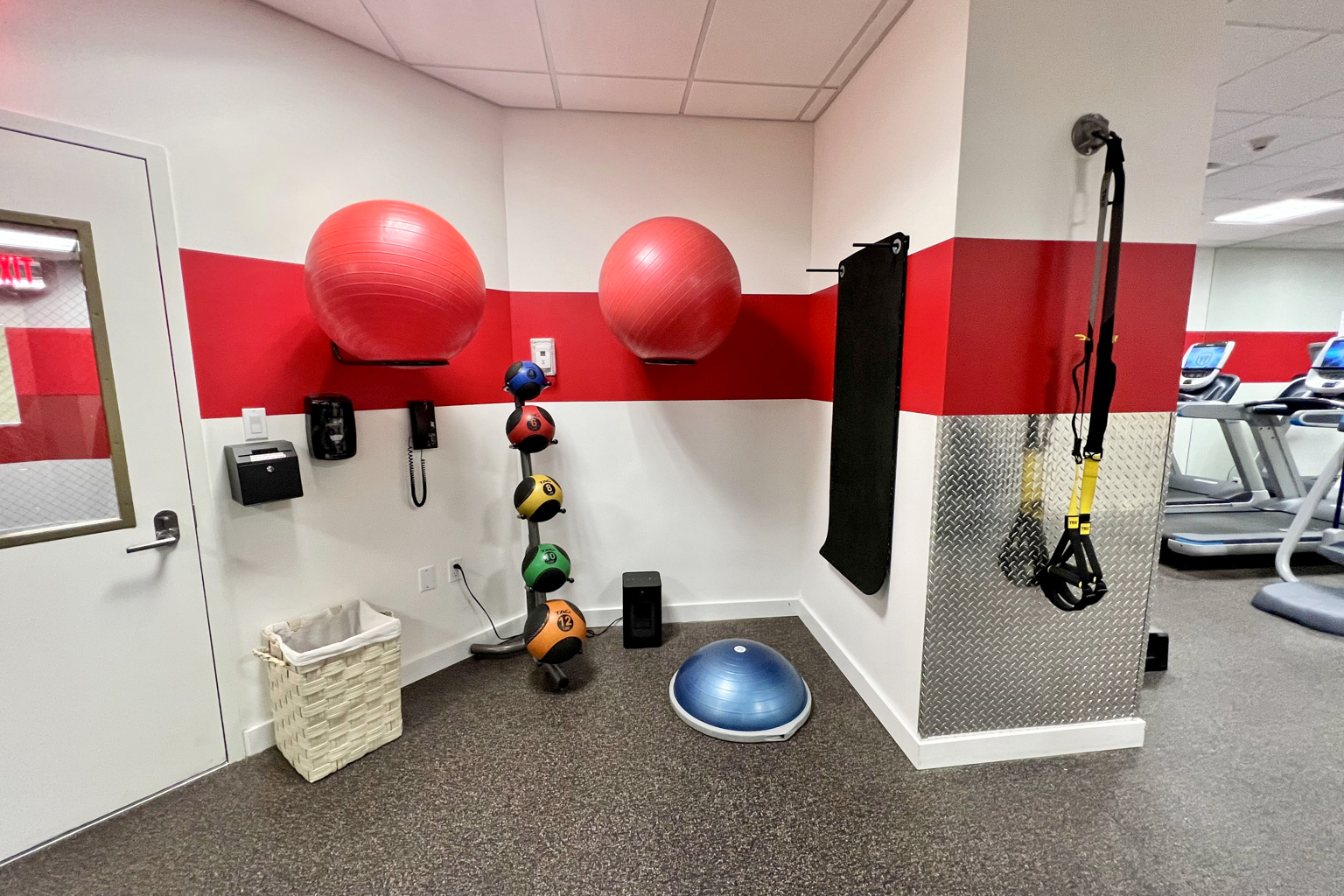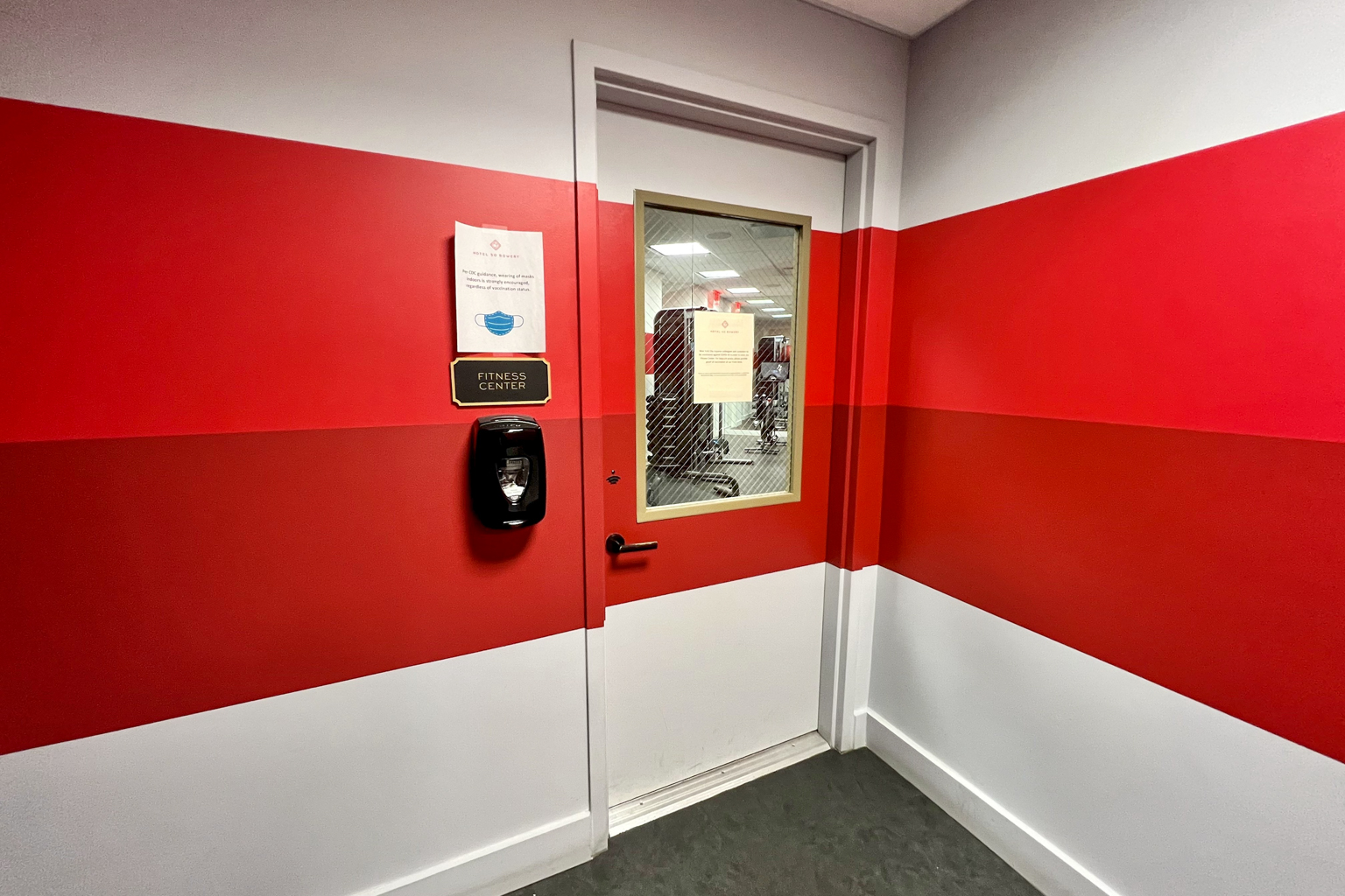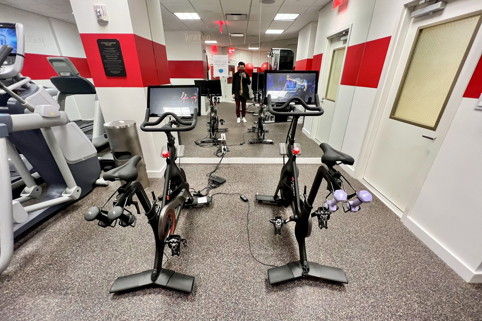 The facility can be accessed via key card. It’s jam-packed with equipment considering its small size, offering ellipticals, treadmills, Peloton bikes, and free weights.