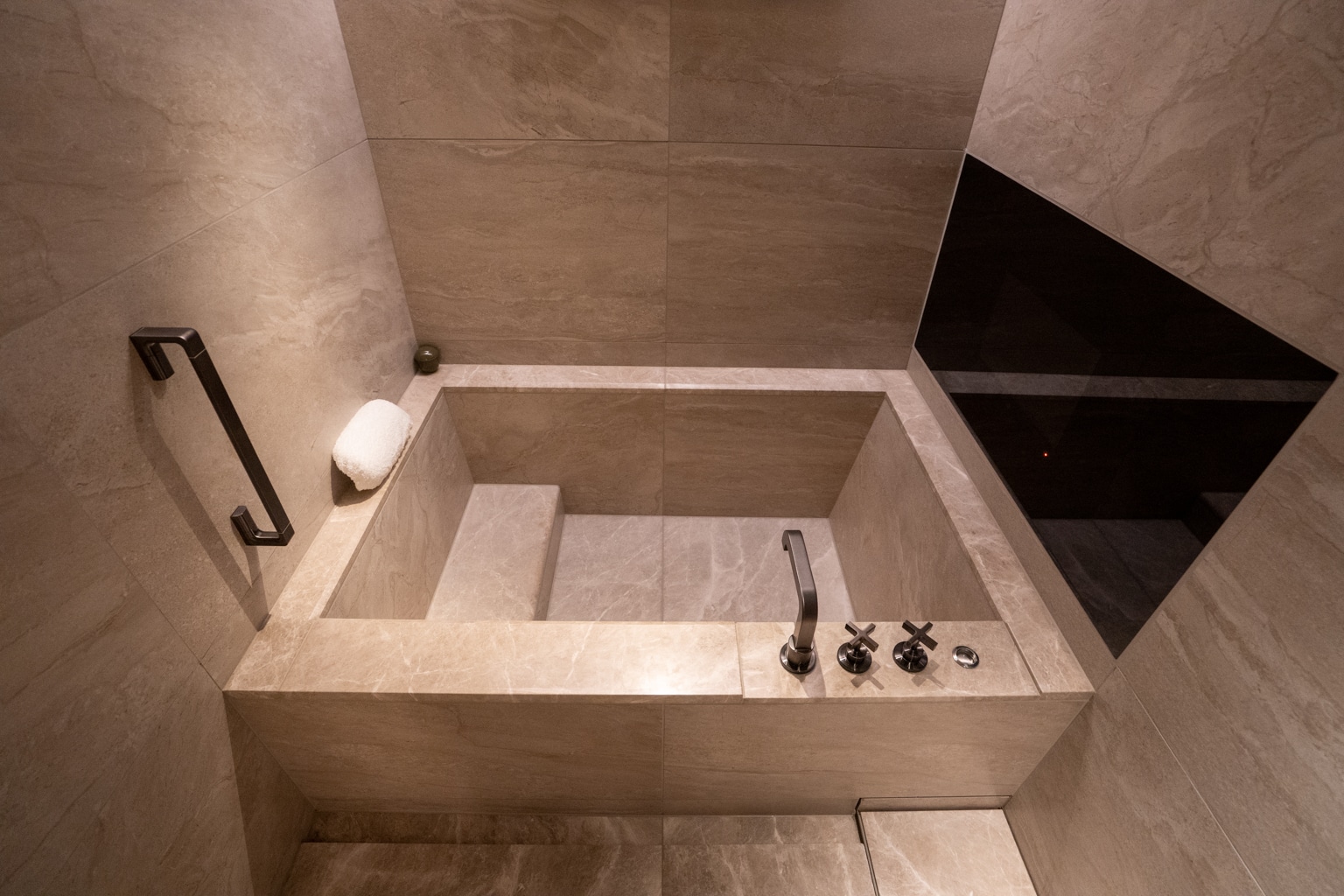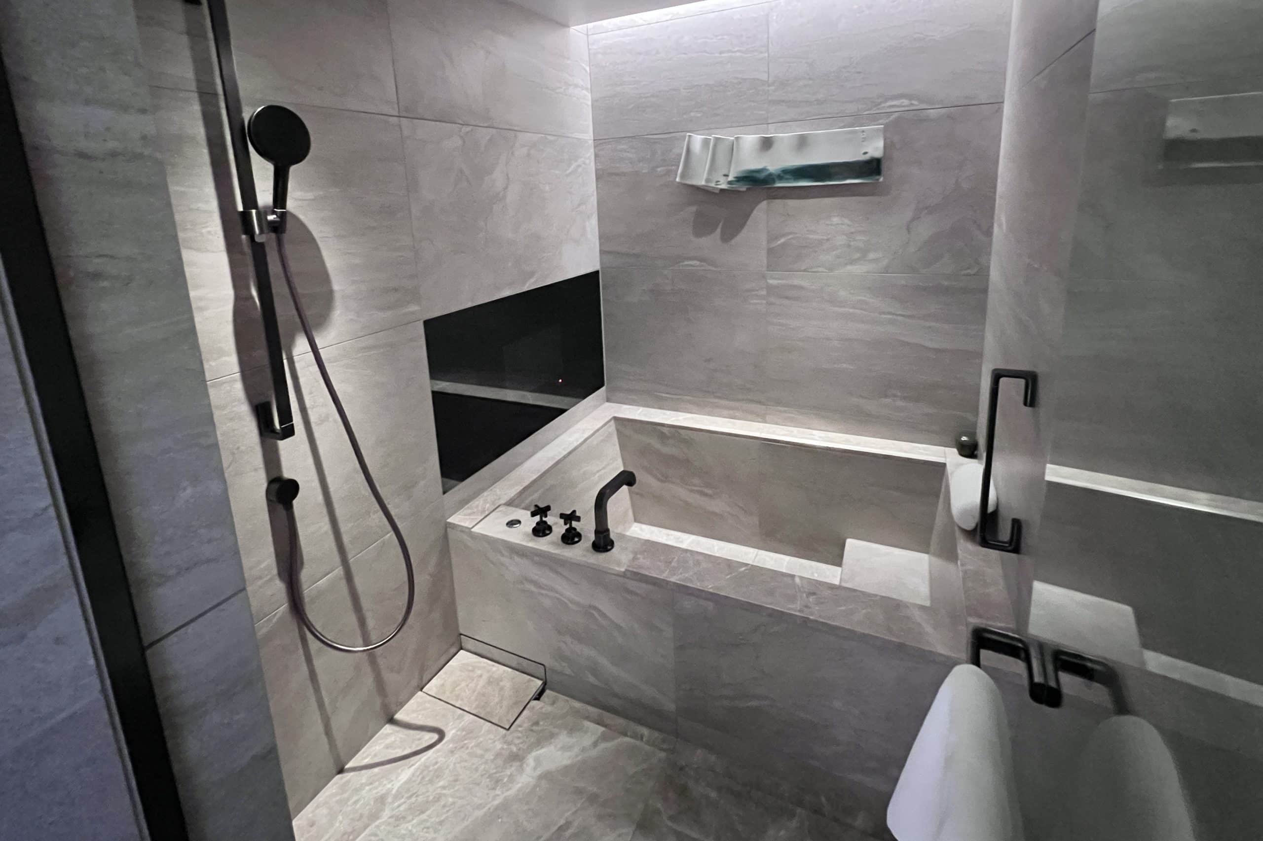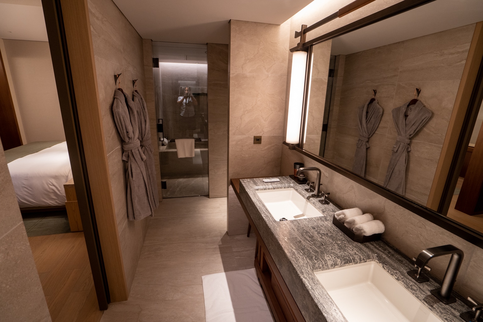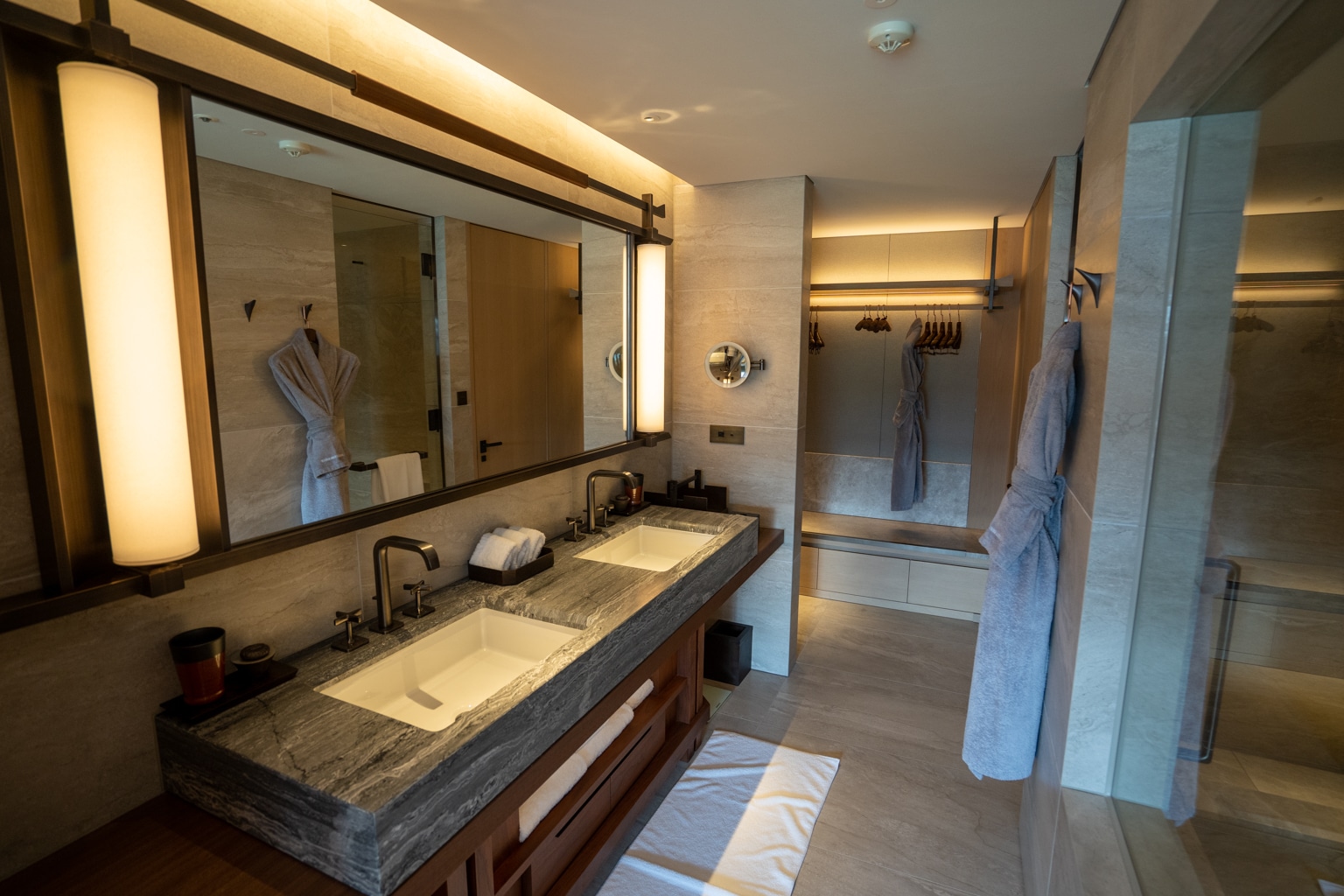The bathrooms in the base-level rooms connect the entrance and the bedroom via a set of sliding doors. It’s just as elegant as the bathroom in the Deluxe Suite.
