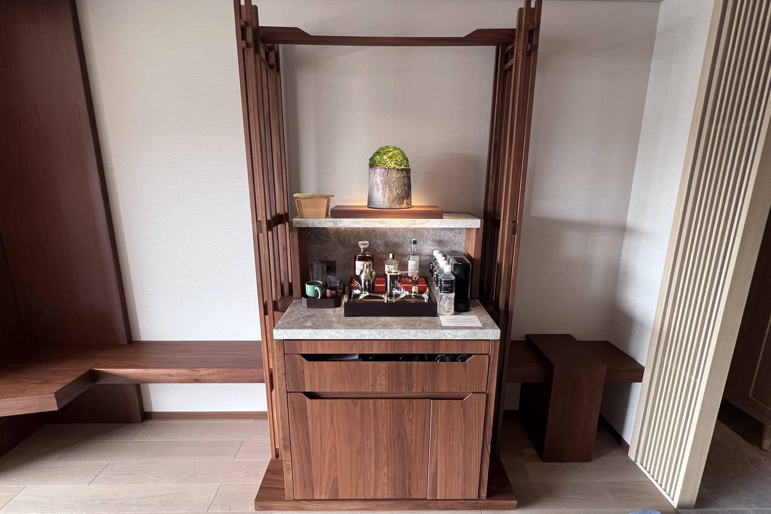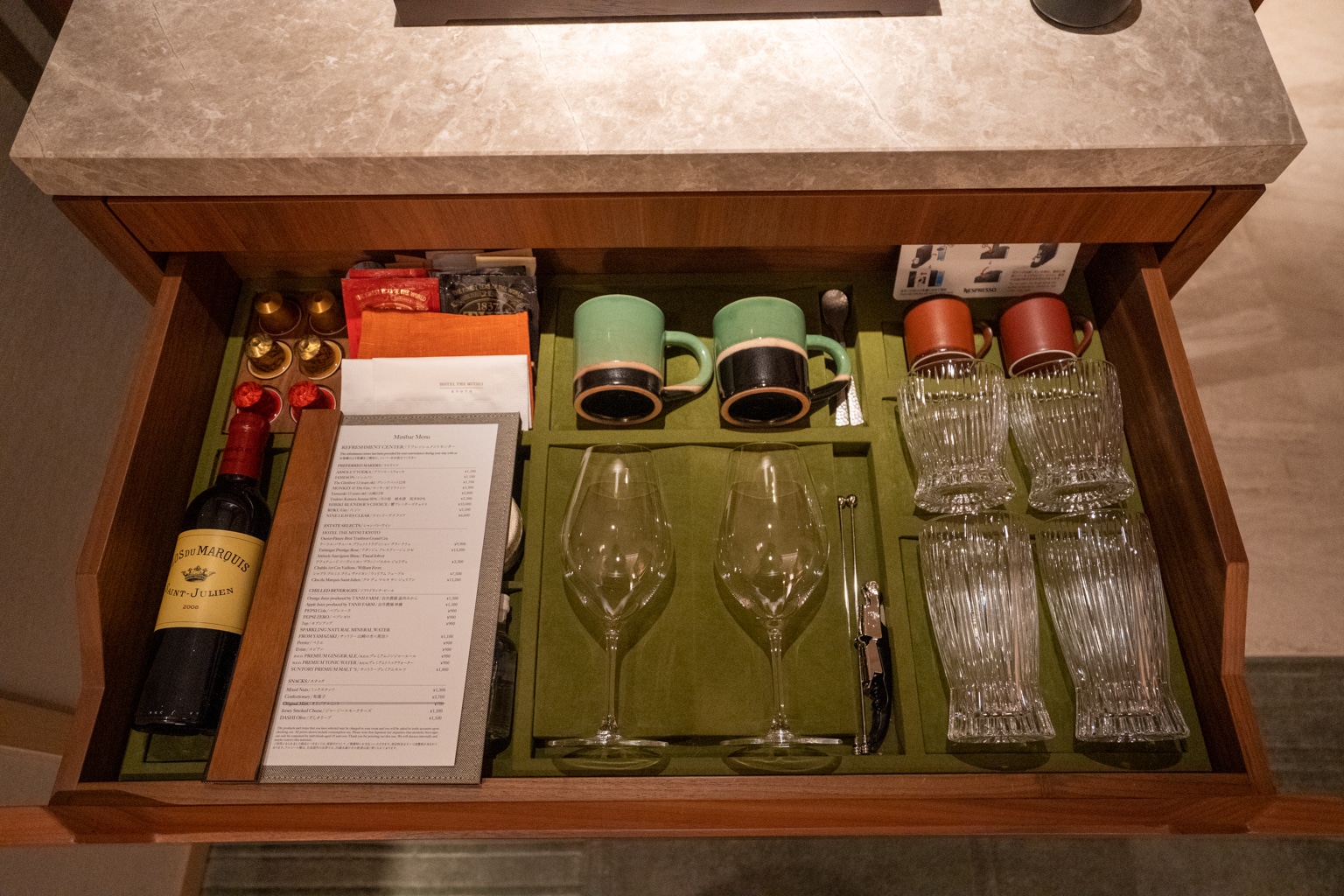 A minibar can be found just around the corner to the right as you first enter the suite. Here, you’ll find coffee and tea, a selection of spirits and whiskey, and some wine in the drawer.