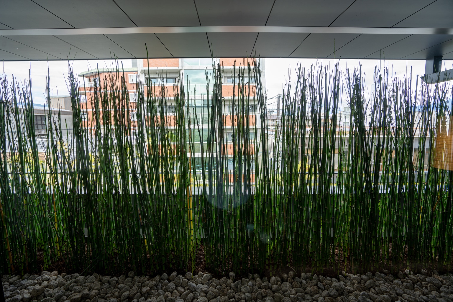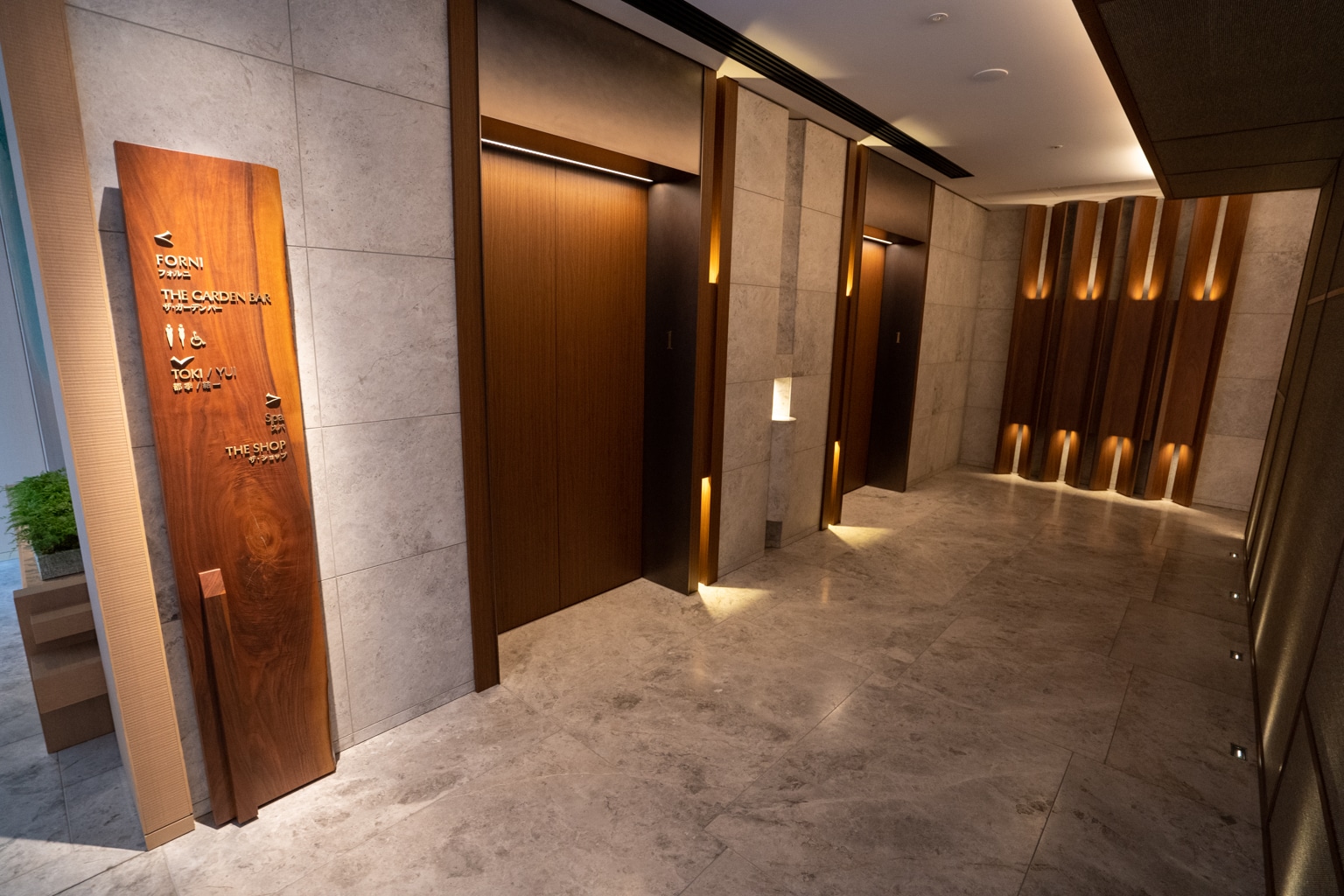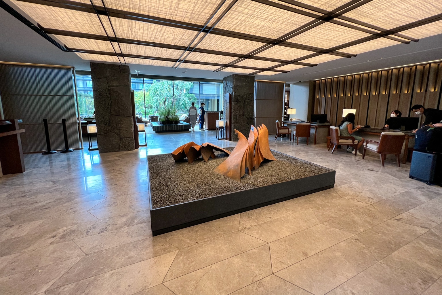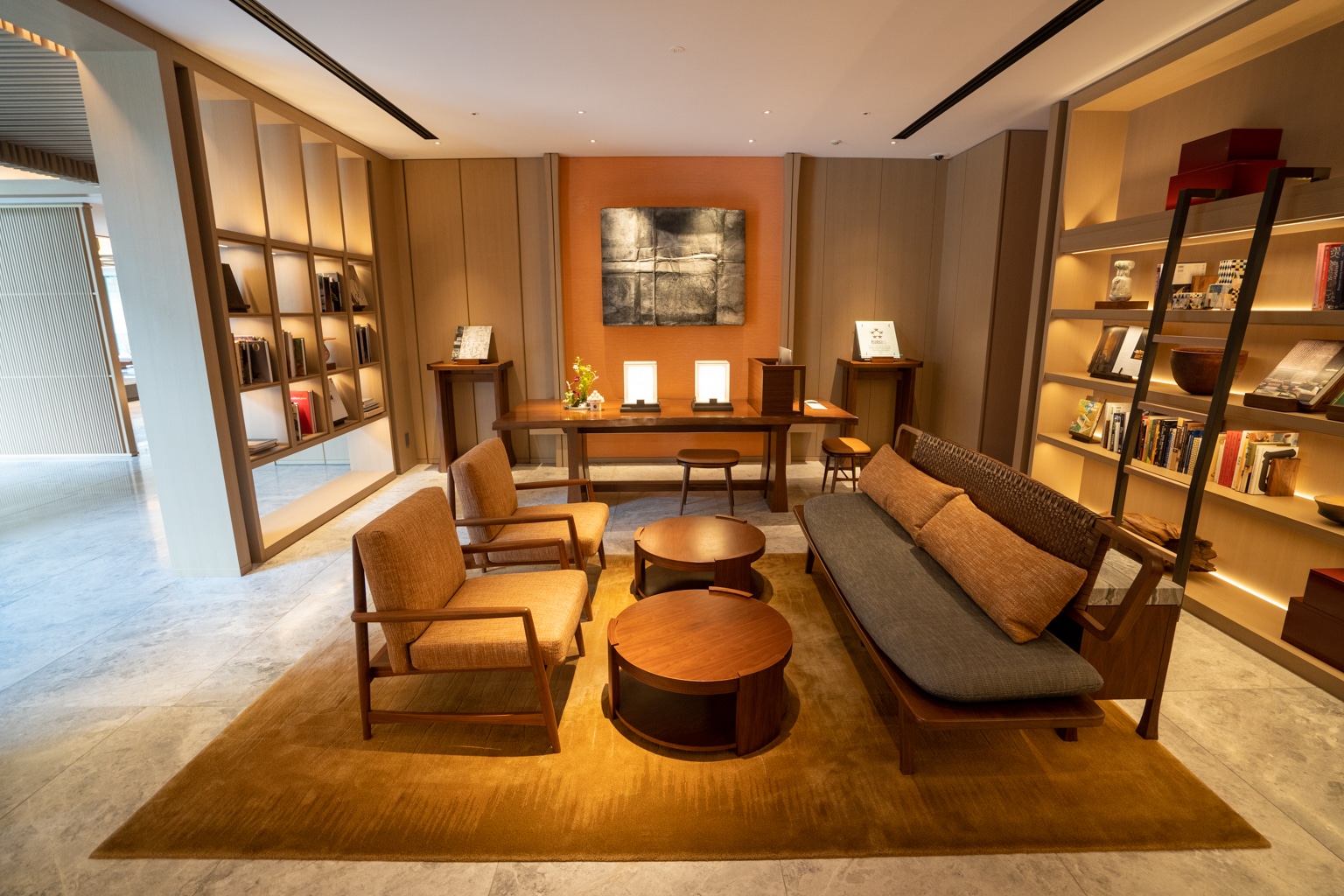 In particular, the lobby is where antiquity and modernity collide. A large ceramic sculpture fills the centre of the lobby, and sits below a more traditional Shoji lantern on the ceiling, while the surroundings are made of luxurious rustic elements.