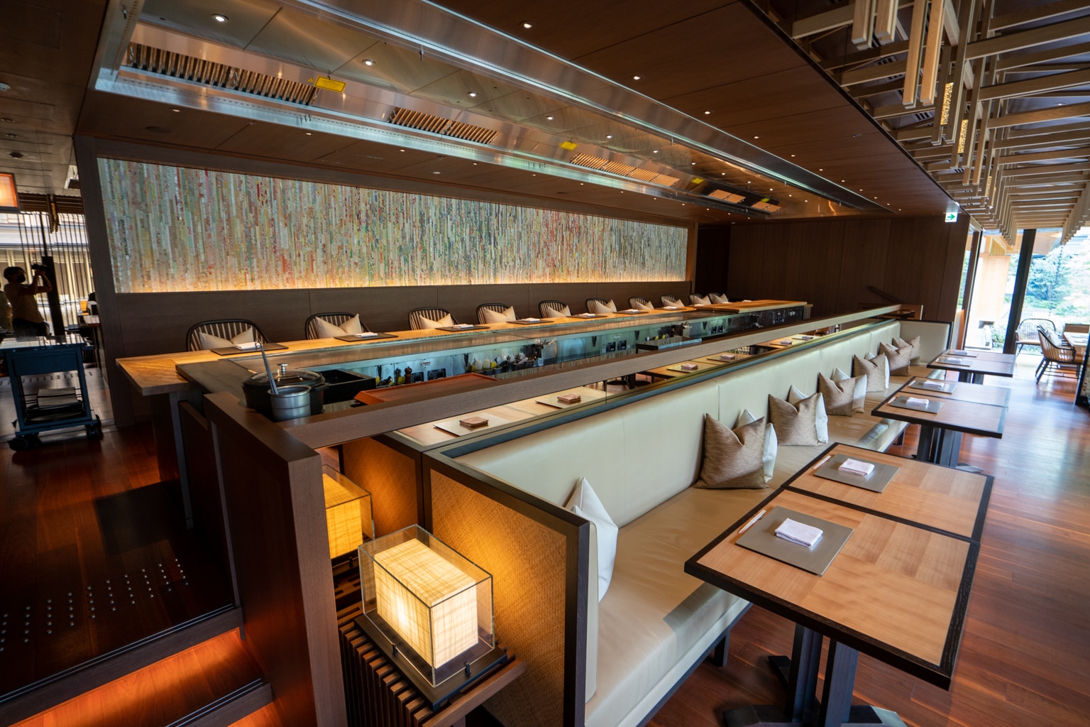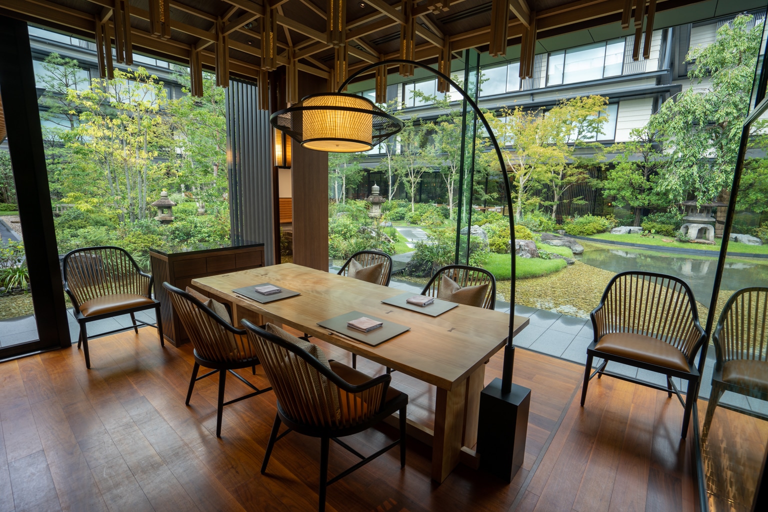 The restaurants and bars at Hotel The Mitsui Kyoto are composed of three separate sections, each surrounding the central courtyard gardens.