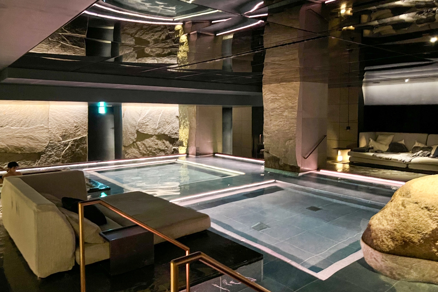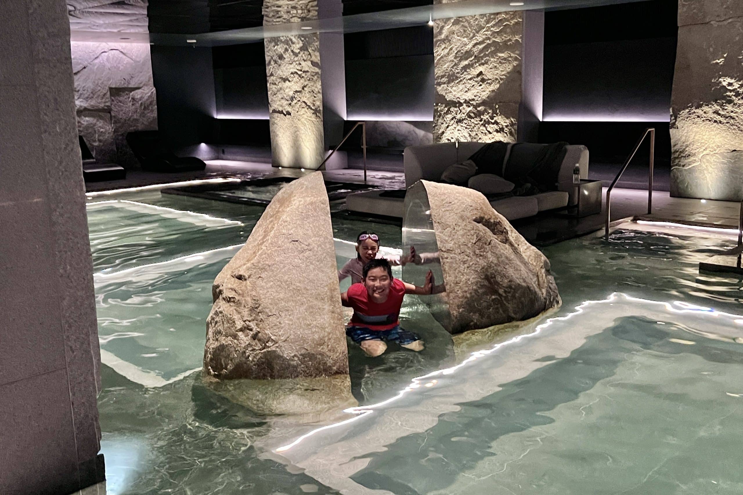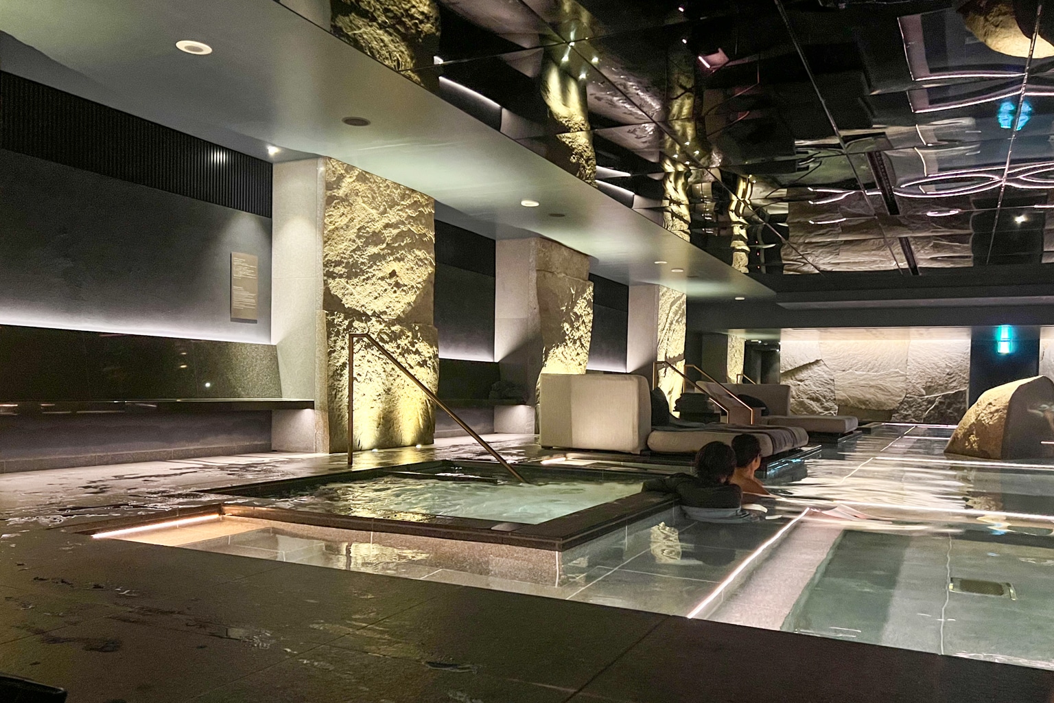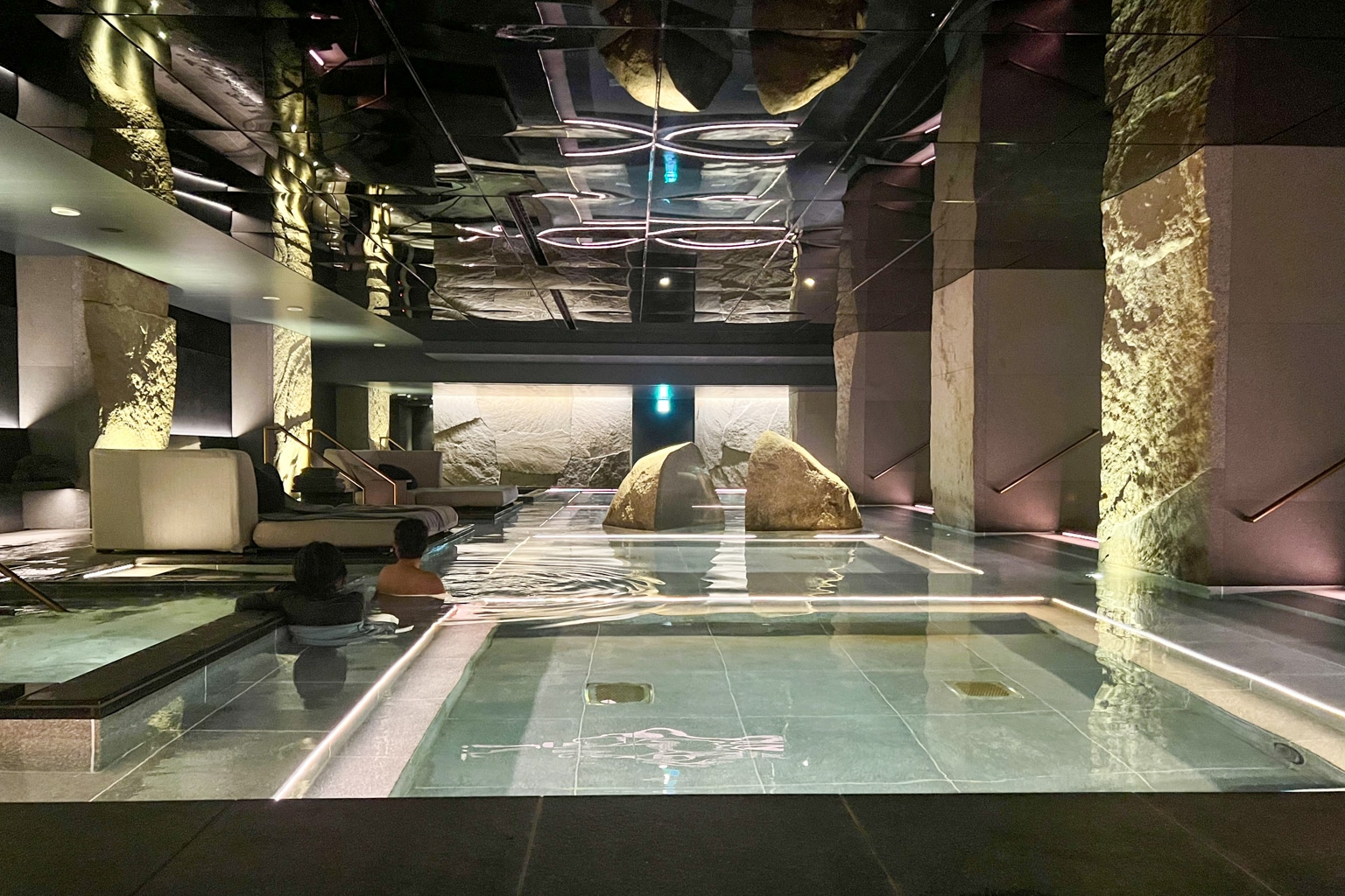 The space is unequivocally beautiful, in keeping with the rest of the hotel. Scattered boulders are submerged in the thermal baths of the dimly lit large open space, creating a serene experience for anyone coming for a dip.