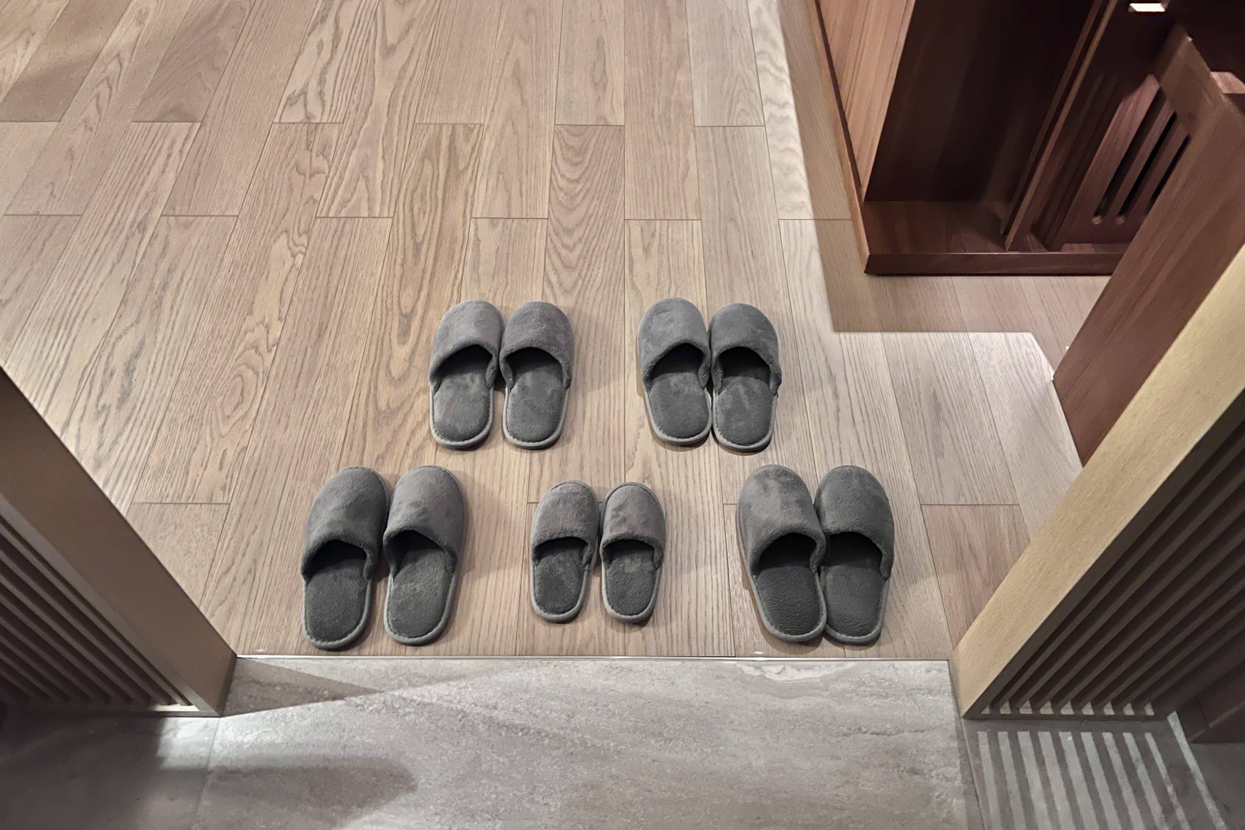 As we entered the suite, the foyer was elegant, with the flooring adorned in white stone. Slippers were laid out for us to change into before moving through the rest of the suite, which was lined with a nice, plush carpet.