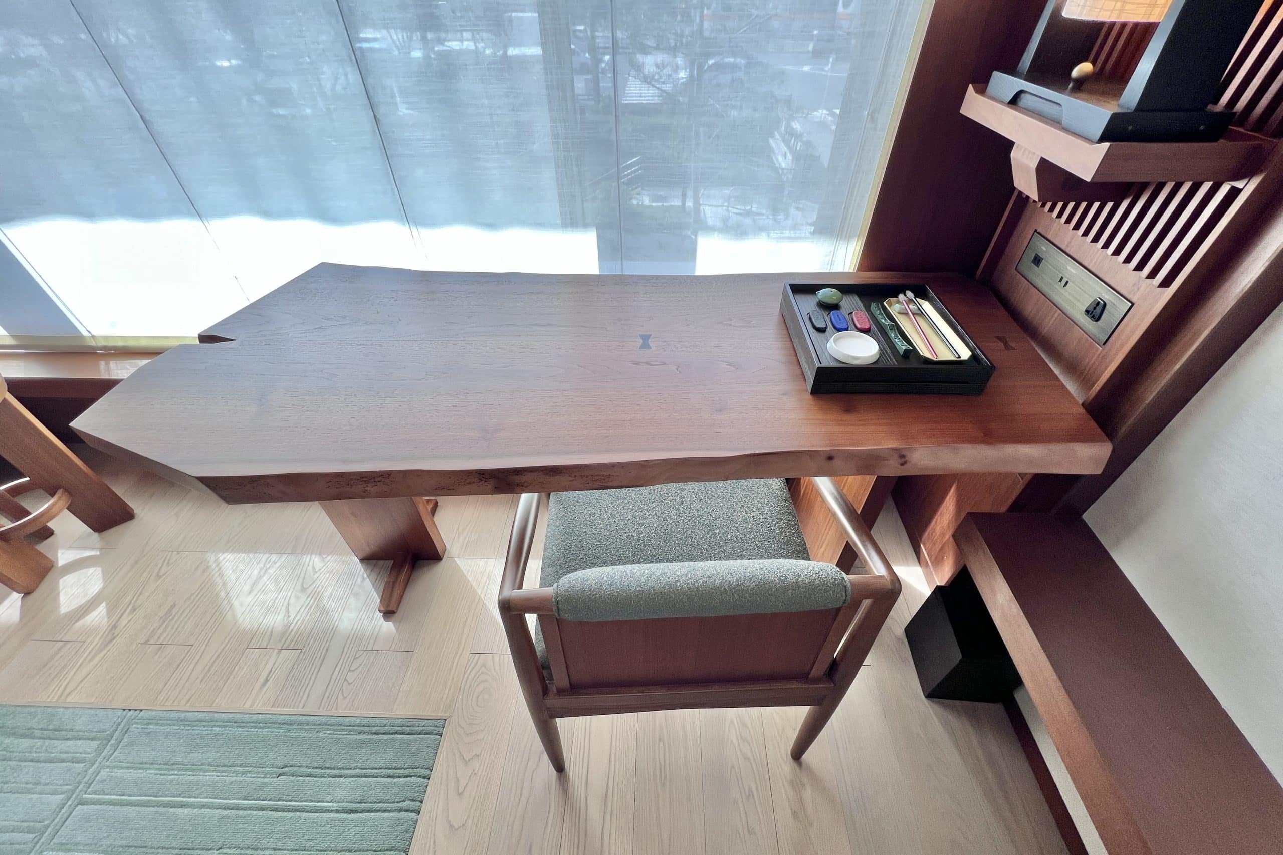 The bedroom had two twin beds, almost side by side, and a large live-edge desk with a Japanese calligraphy set.