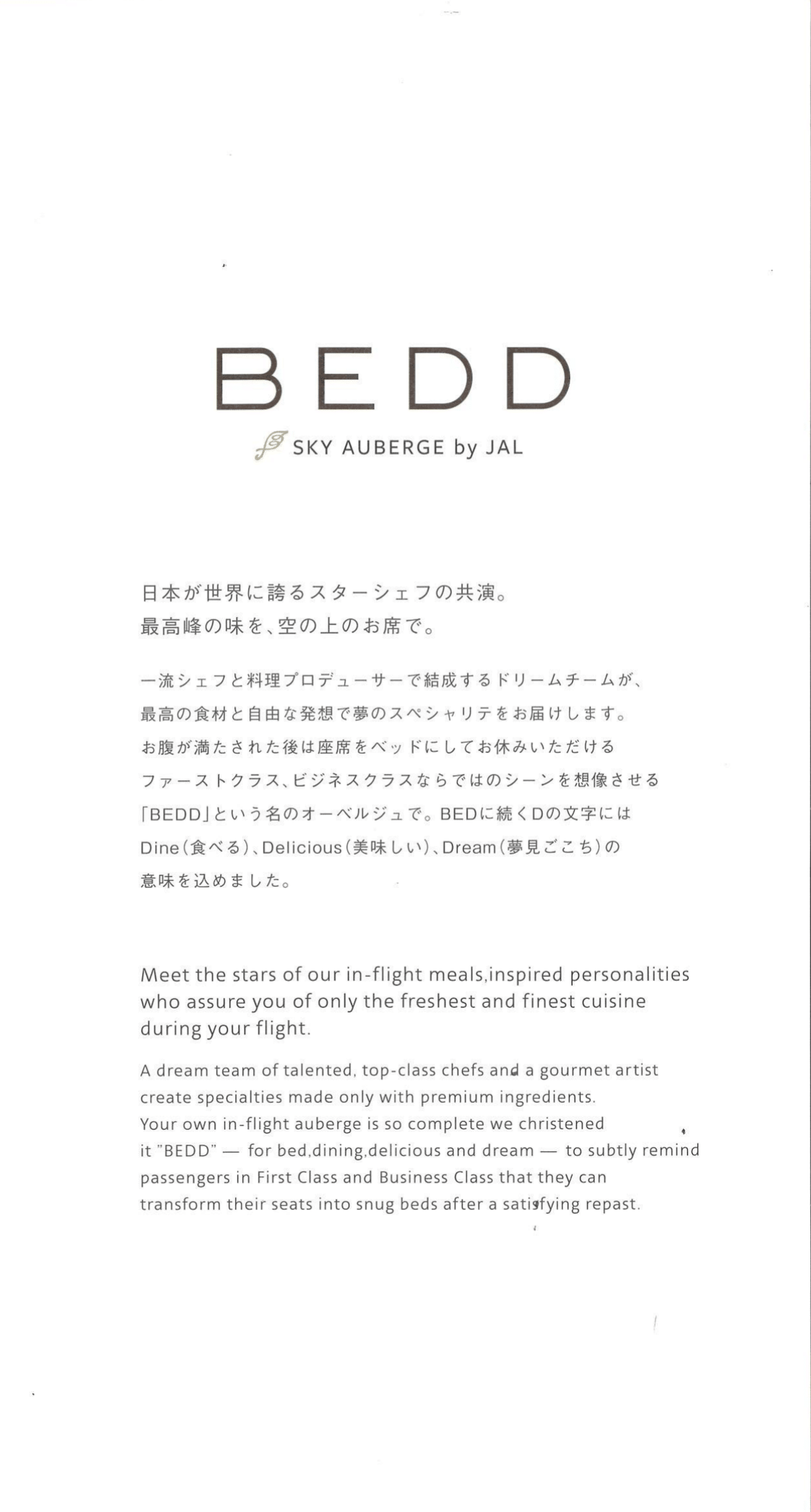 Japan Airlines’s business class dining concept is known as “BEDD: Sky Auberge by JAL”, with BEDD apparently standing for “bed, dining, delicious and dream”.