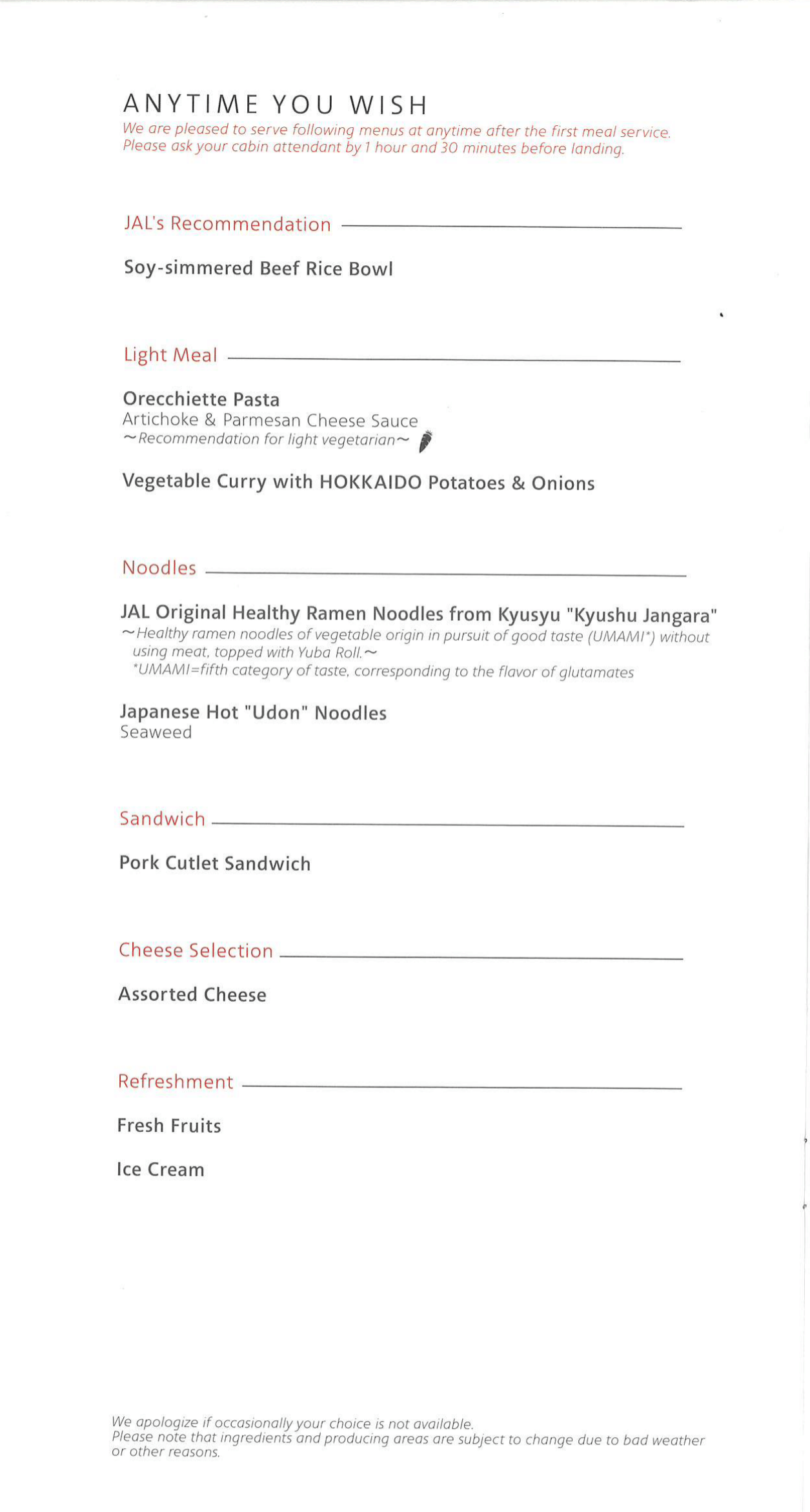 I worked for about two hours before deciding that it was time to hit up the “Anytime You Like” snack menu. As a huge fan of all kinds of Japanese food, from ramen to udon and everything in between, I find that the snack menu is one of my absolute favourite things about flying on Japanese airlines, so I intended to maximize this one as much as I could.