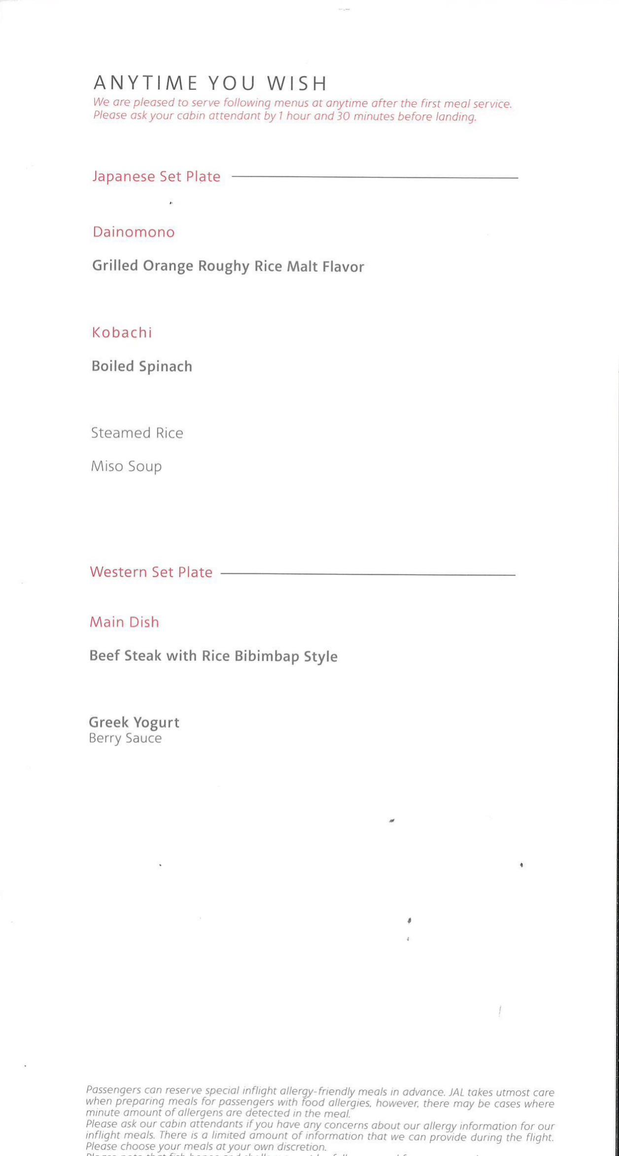 Soon after boarding was completed, the flight attendant came by our seats to take our meal orders. Thinking back to my fond memories of the Japanese meal onboard JAL First Class, it simply wasn’t a question for me: I selected the Japanese lunch over the Western one without a moment’s hesitation.
