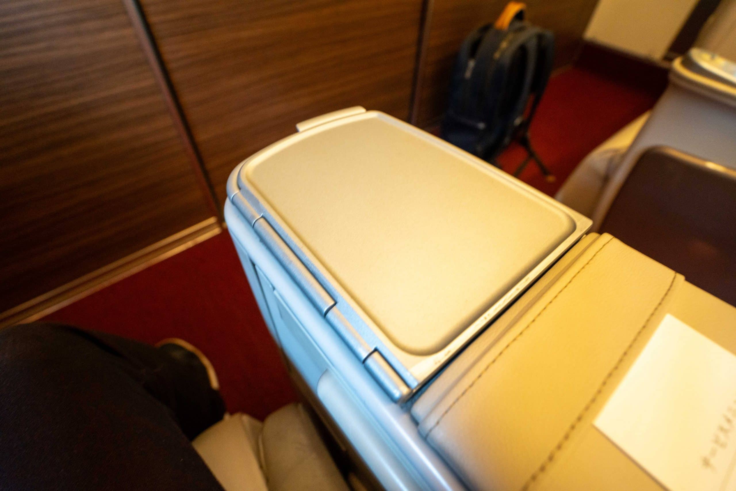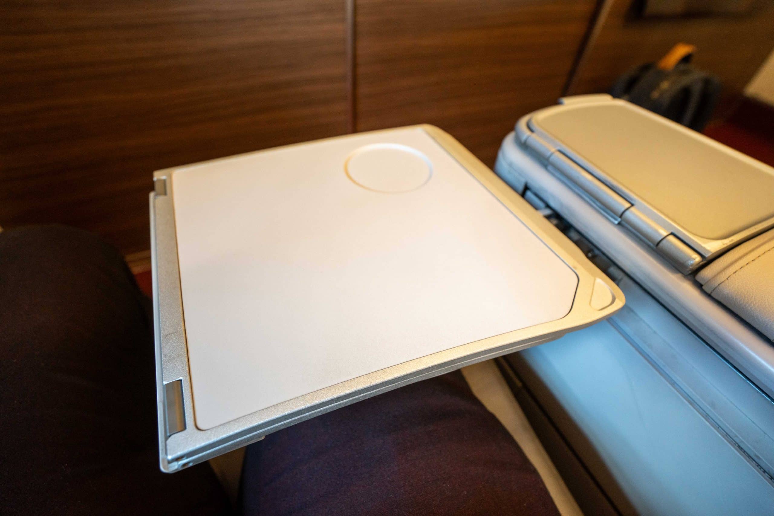 A table tray can be folded out from the armrest over your lap, doubling in size for sufficient dining space. However, it’s worth noting that leaving your seat can be challenging when the tray table is fully extended.