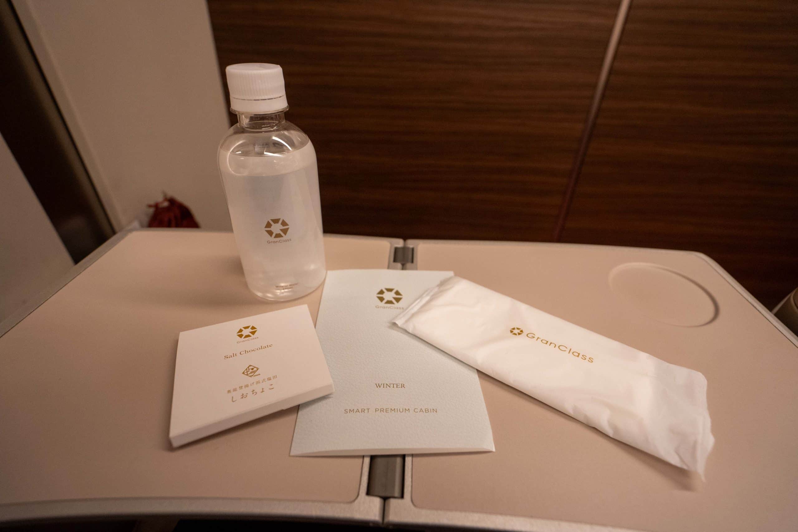 Shortly after, I received a white fabric bag containing an amenity kit, thoughtfully stocked with bottled water, salted chocolate, and a soft hand towel.
