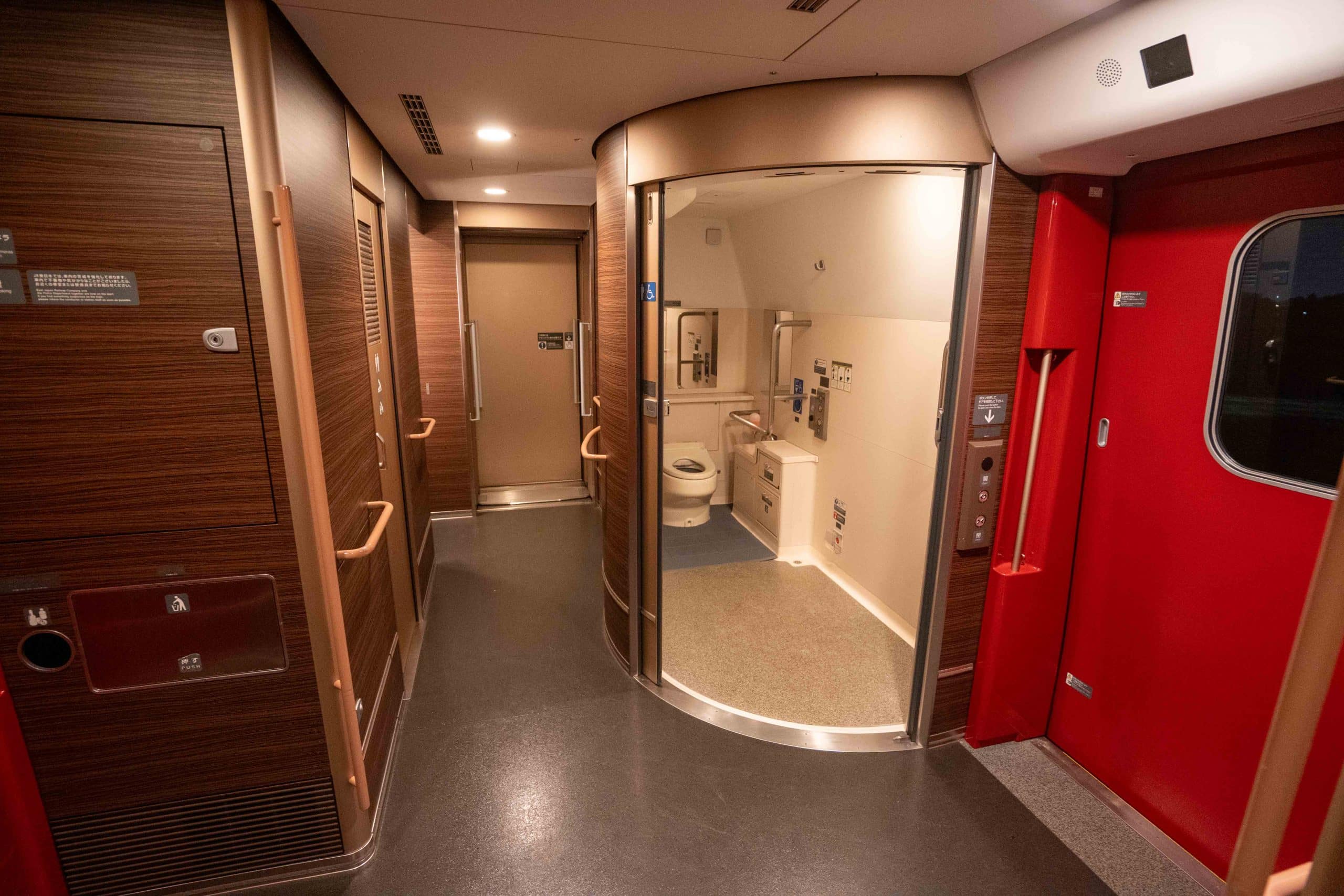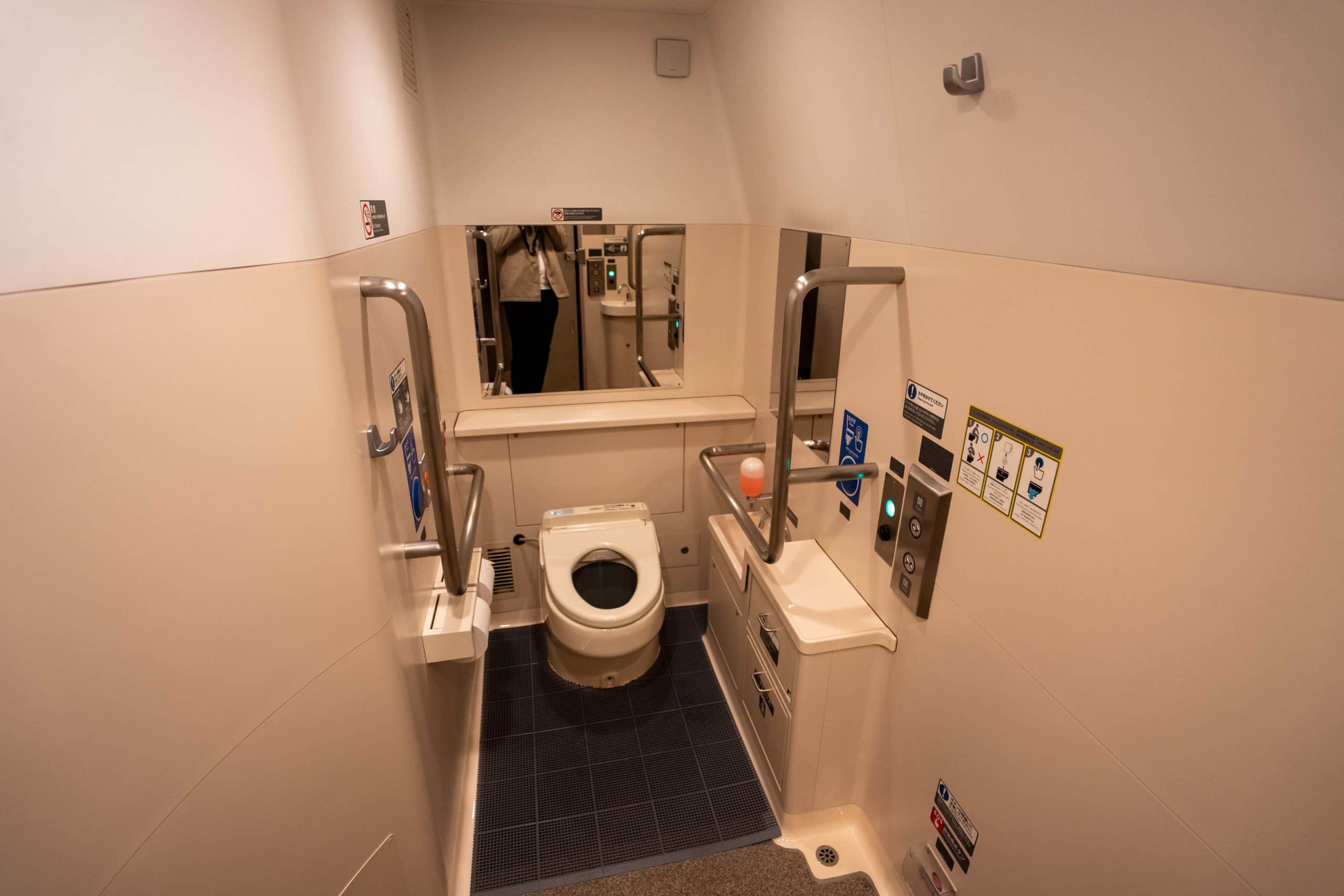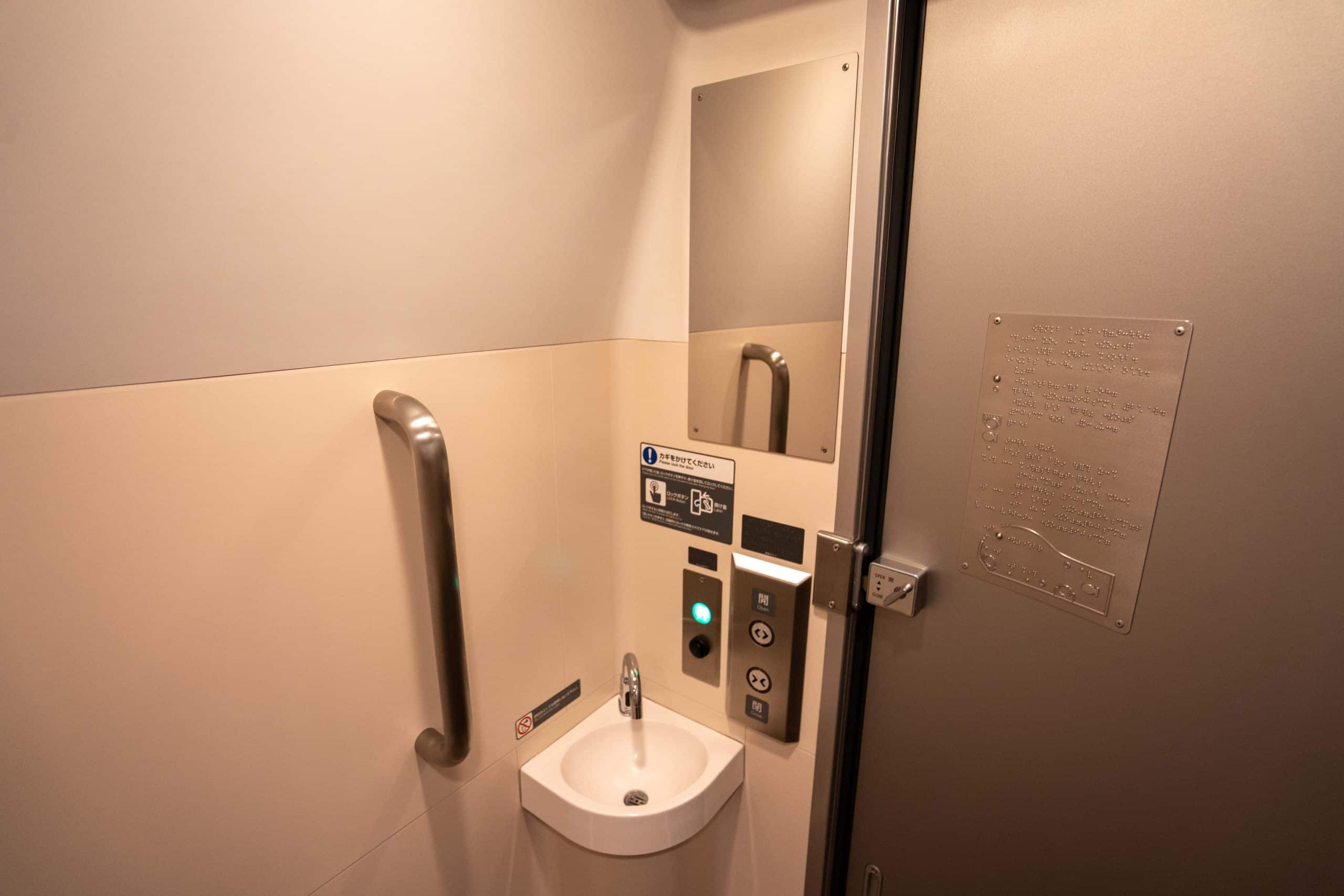 There’s shared bathrooms between the JR Shinkansen Gran Class and Green Class, with communal sinks. Behind a circular sliding door lies a spacious, well-maintained bathroom, which is equipped with a high-tech toilet and railings for stability.
